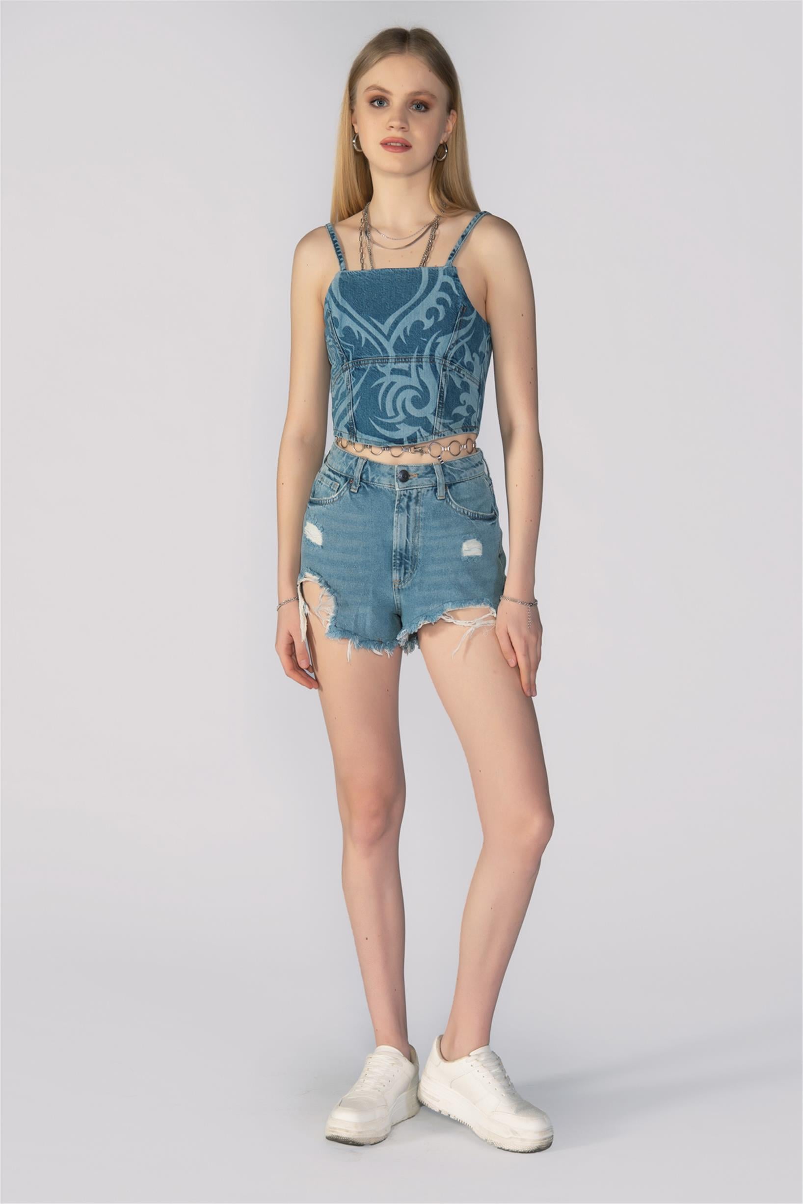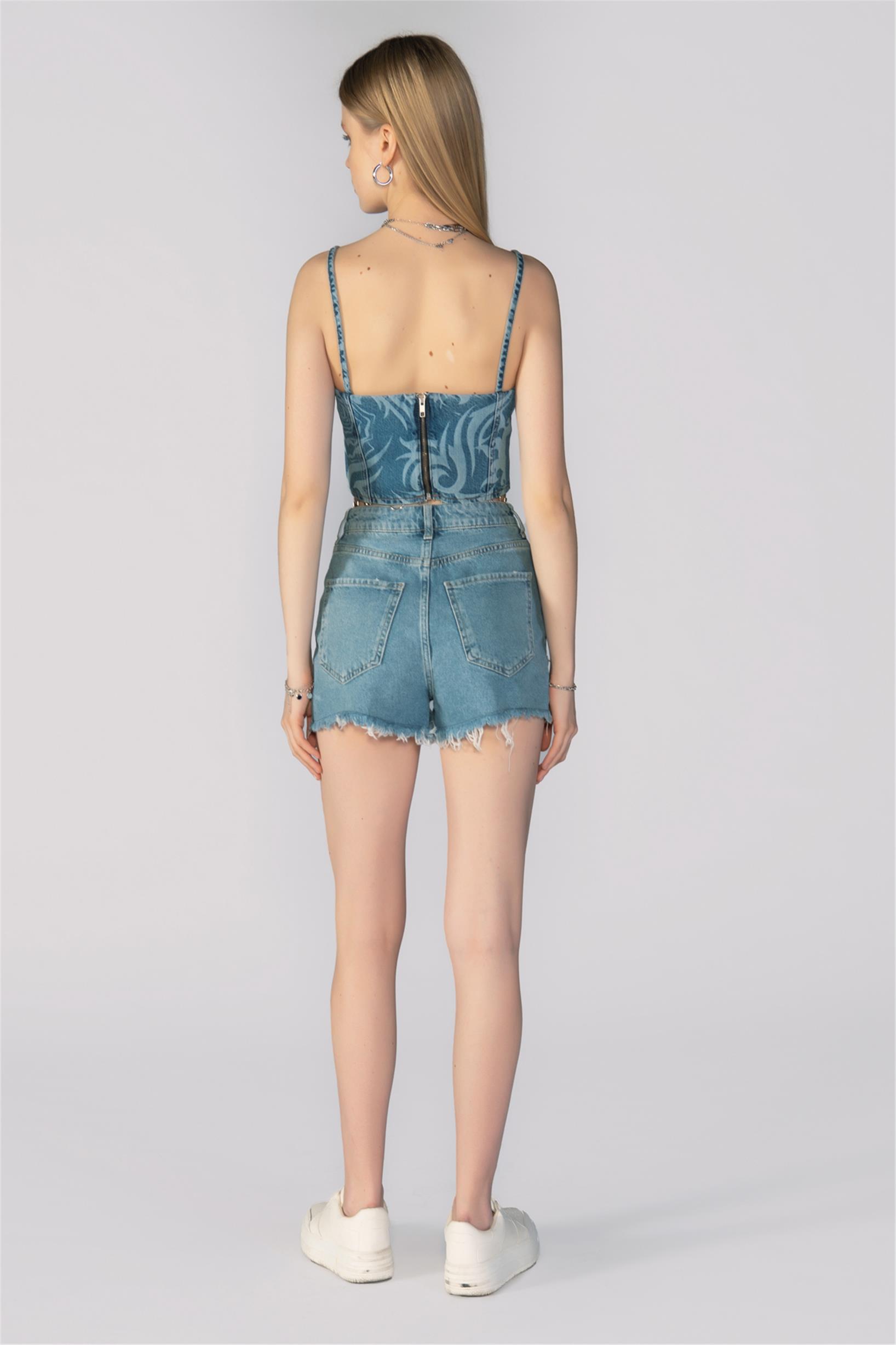 Mavi Yüksek Bel Lazer Kesim Mini Kot Şort