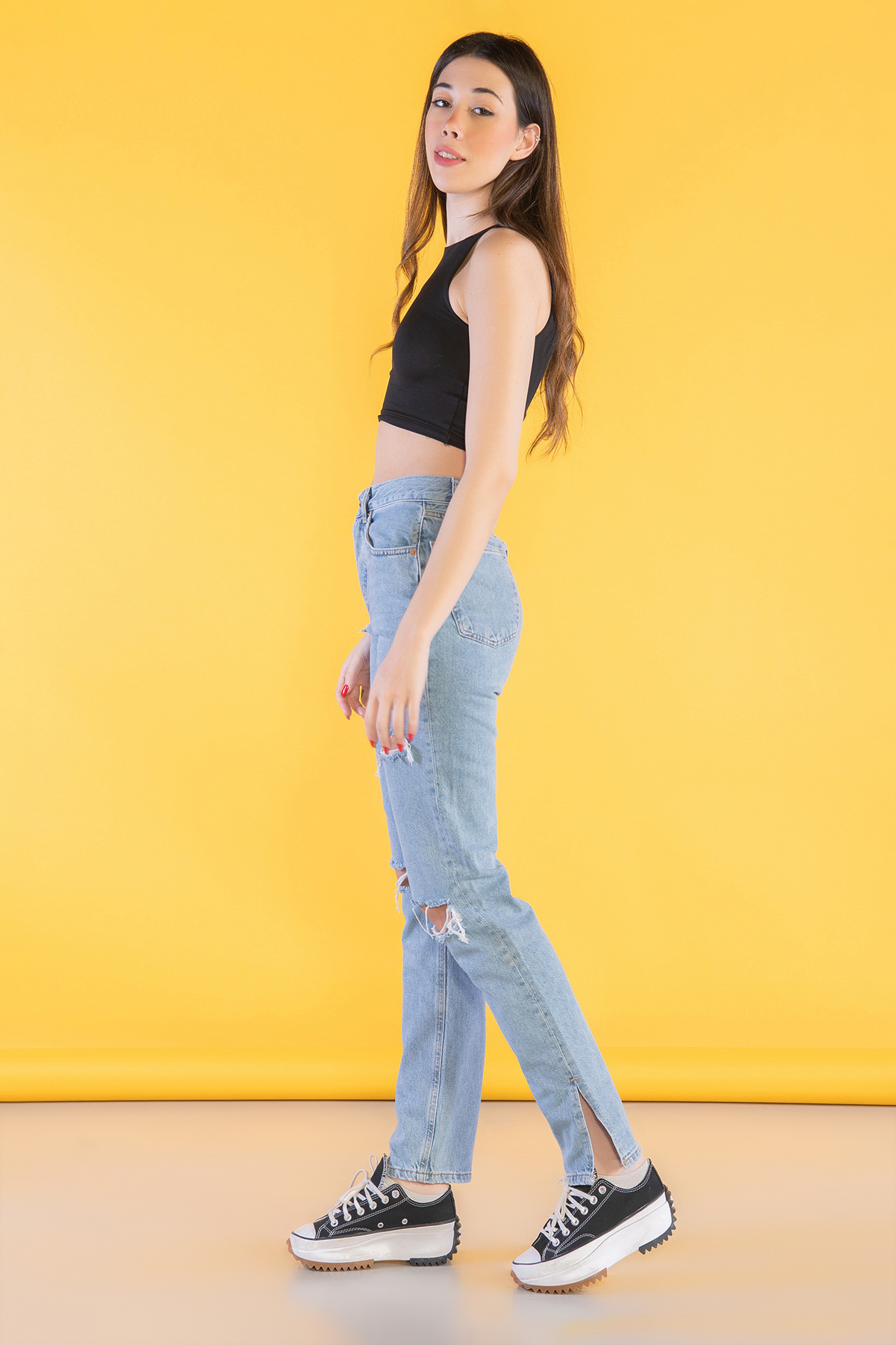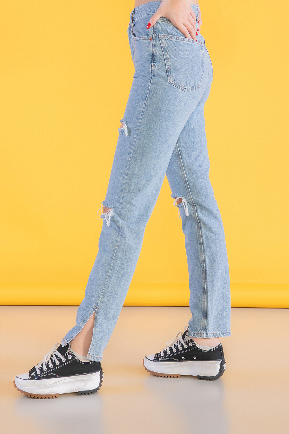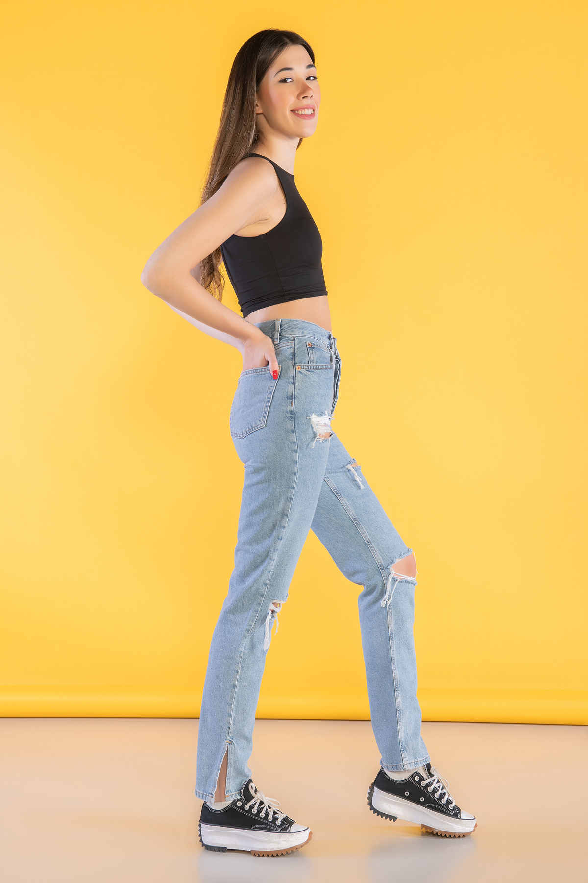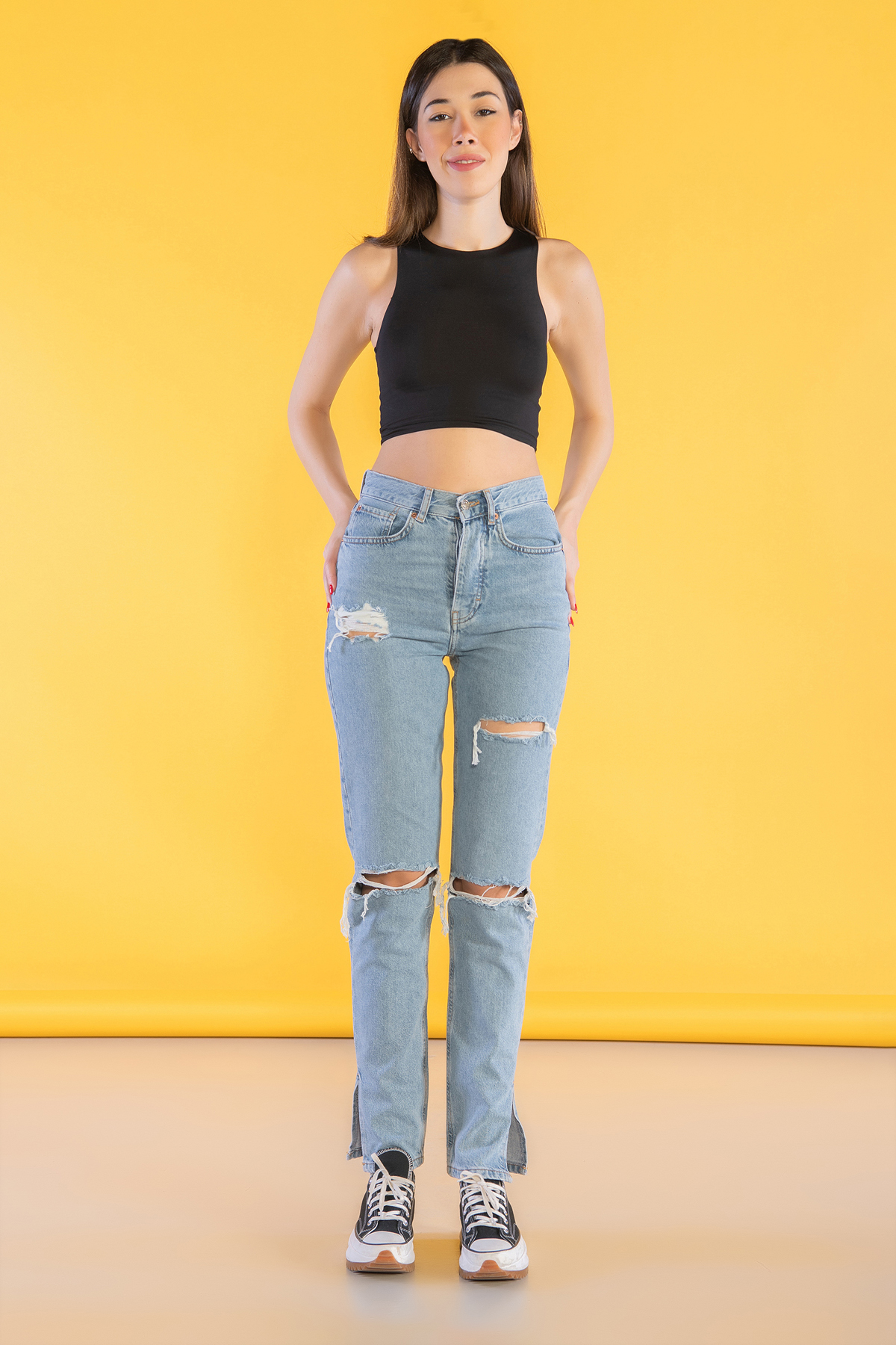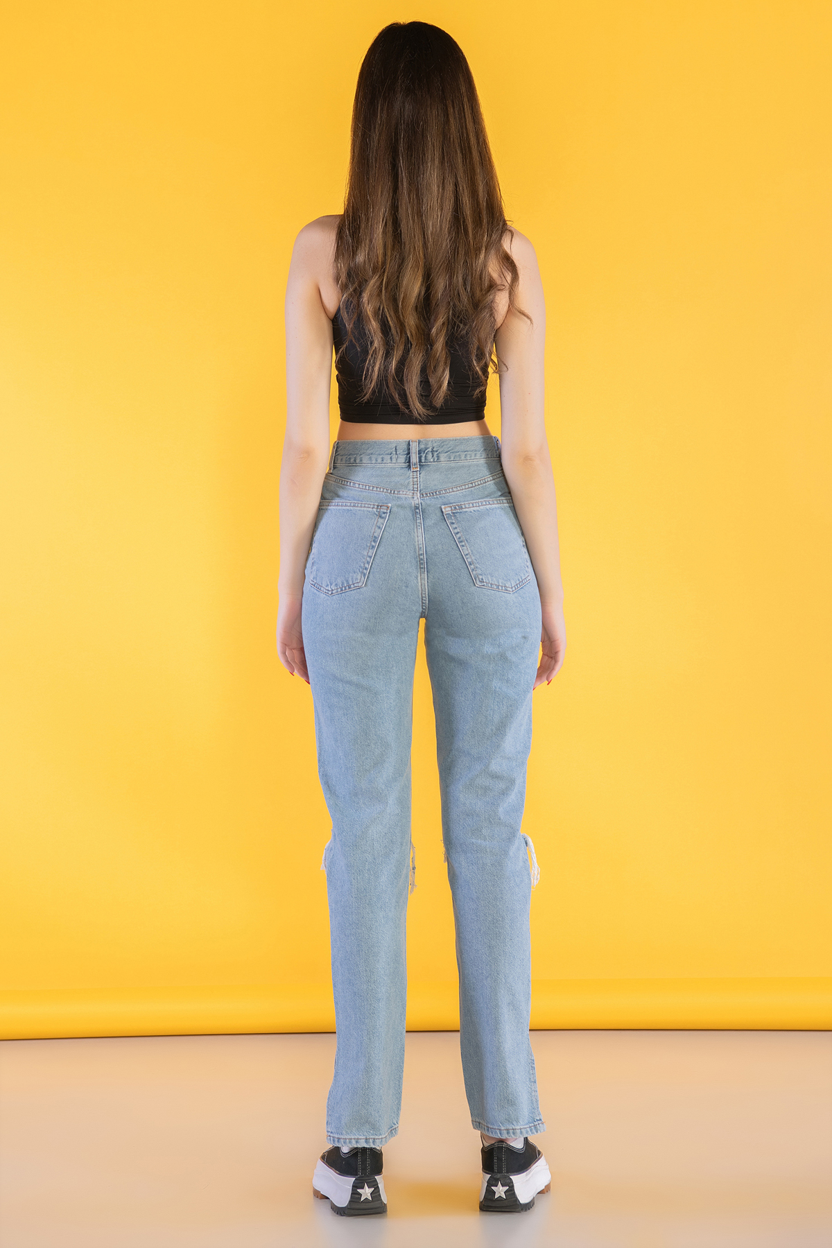 Mavi Yüksek Bel Lazer ve Paça Detaylı Mom Jeans