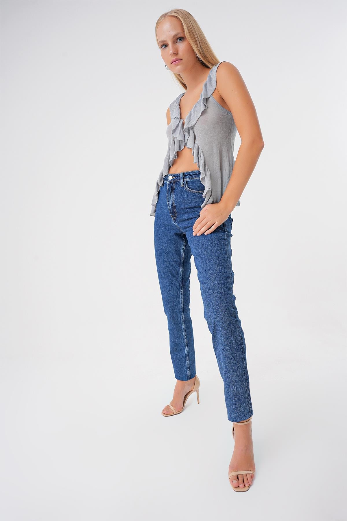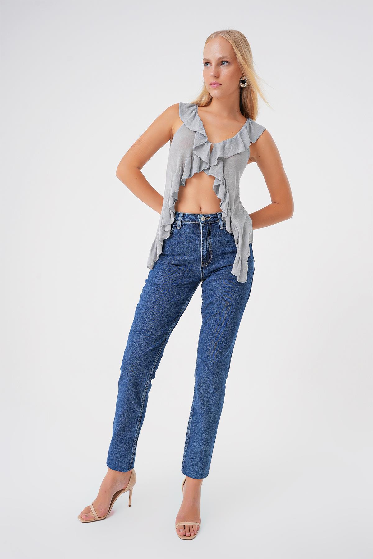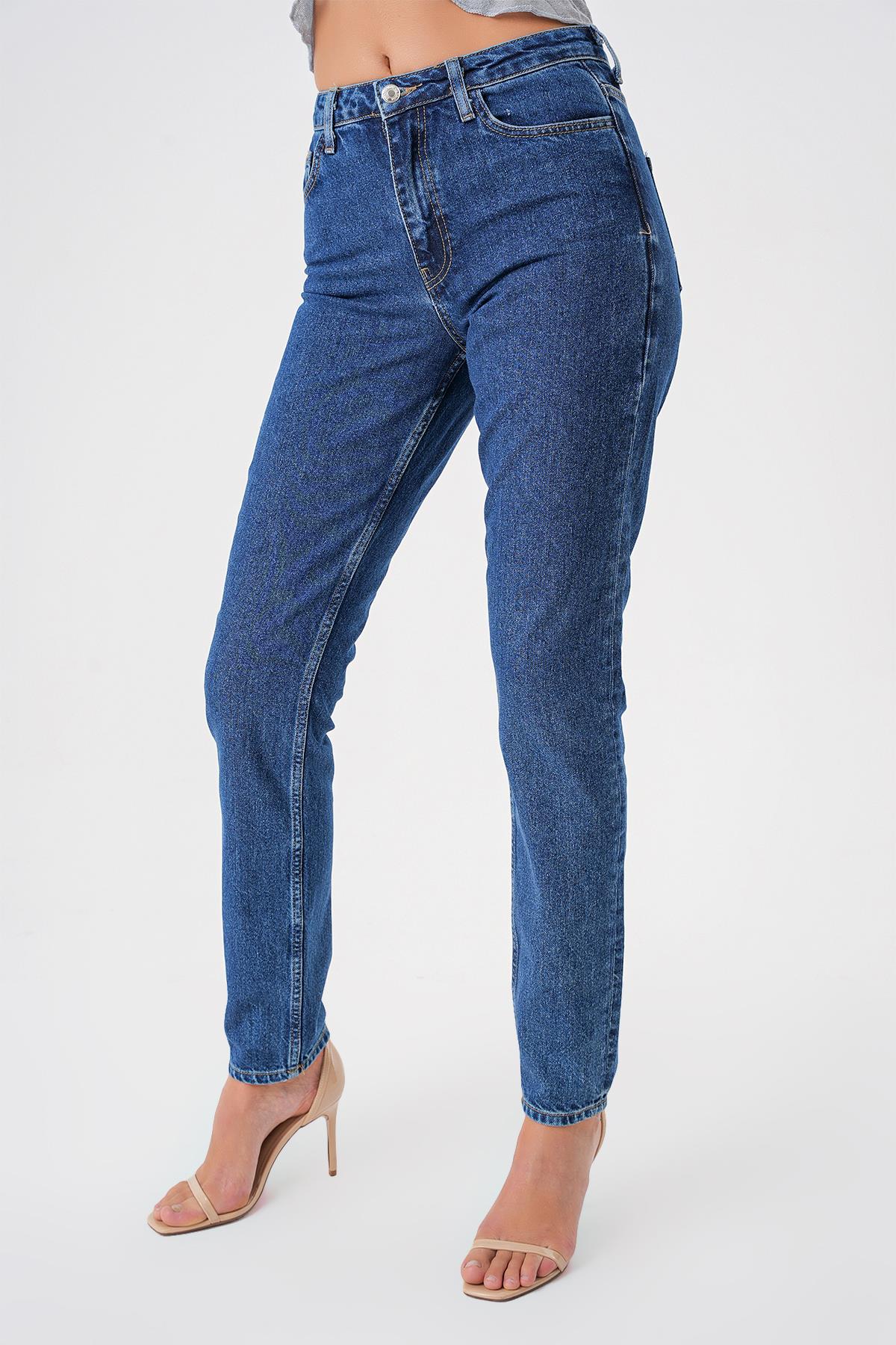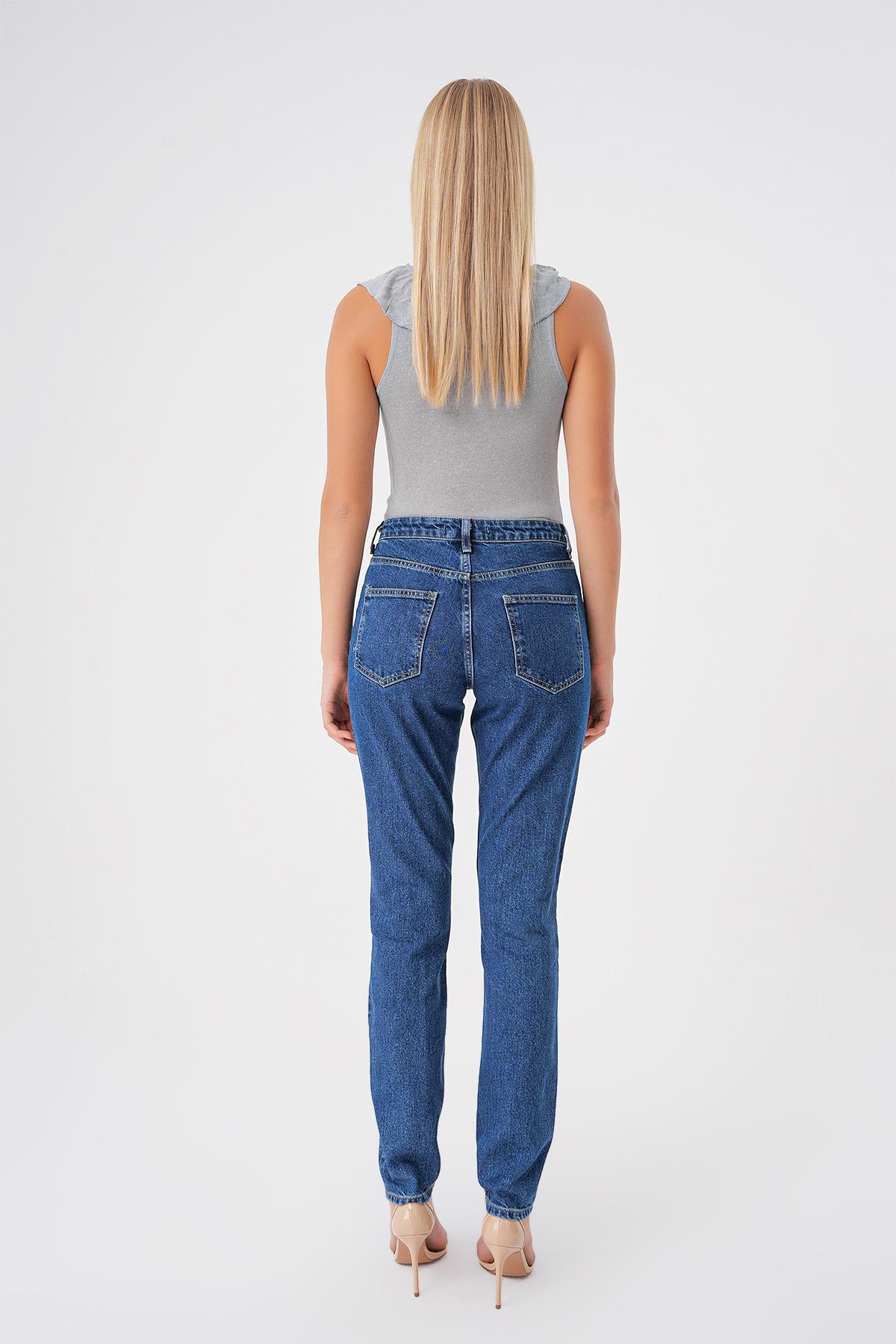 Mavi Yüksek Bel Paça Detayli Slim Mom Jean