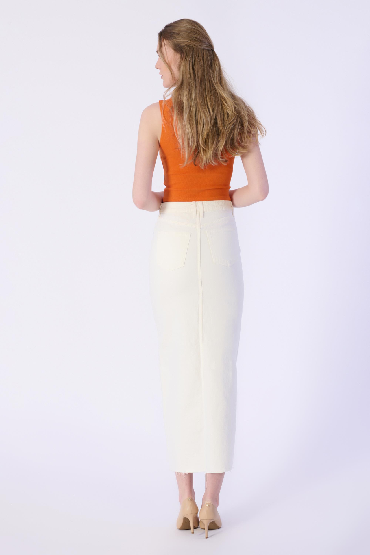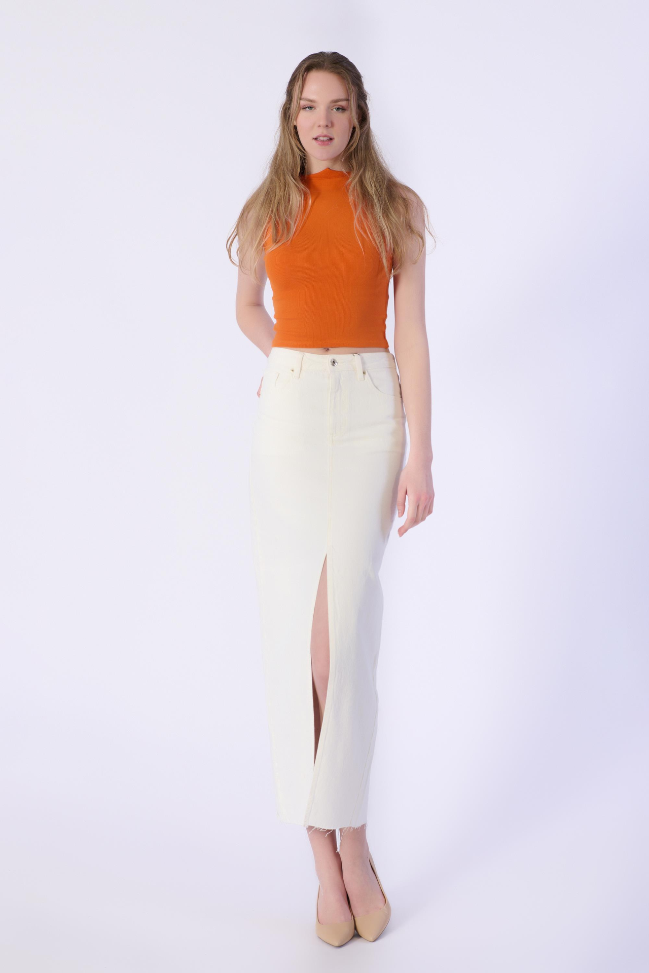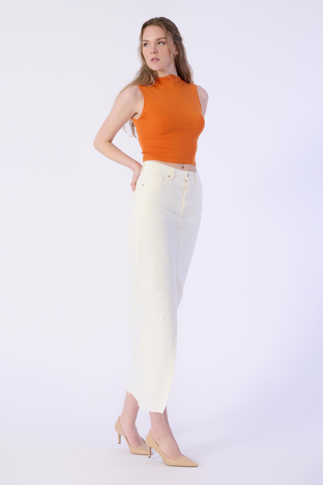 Ön Dikiş Detay Yırtmaçlı Altı Kesik Denim Etek