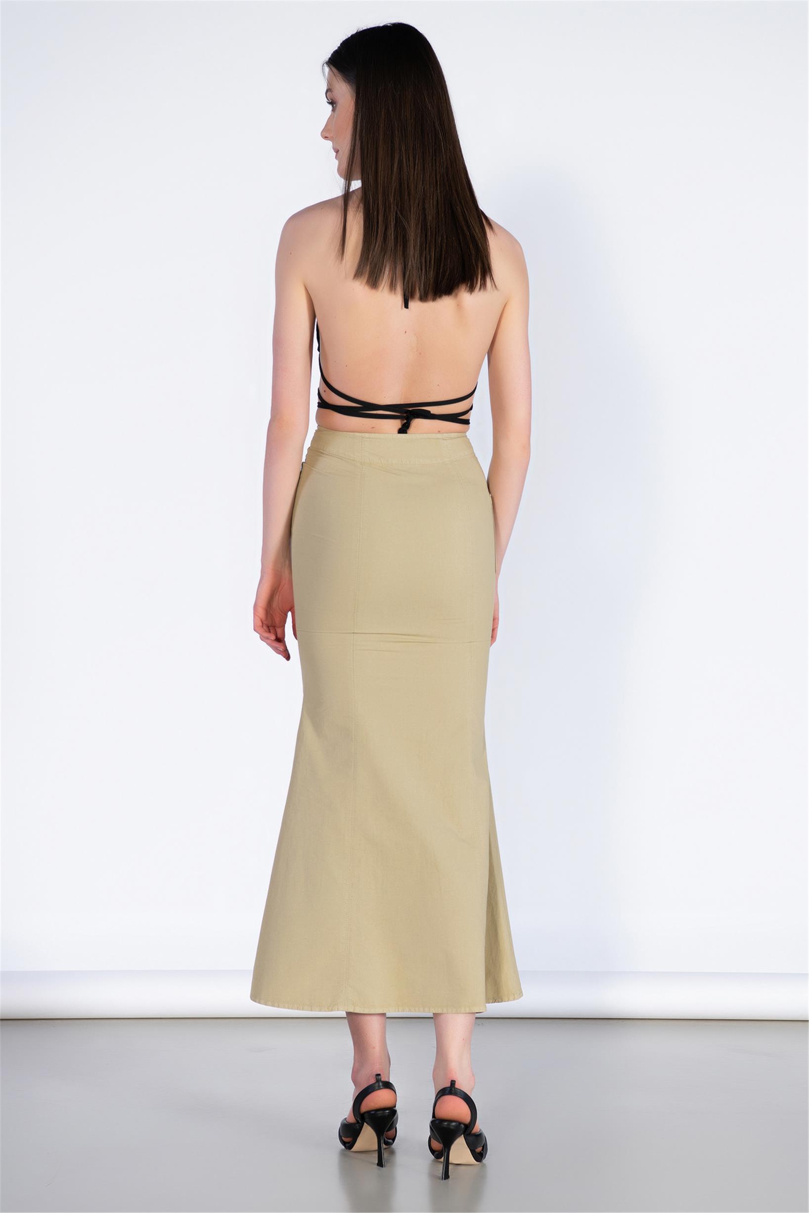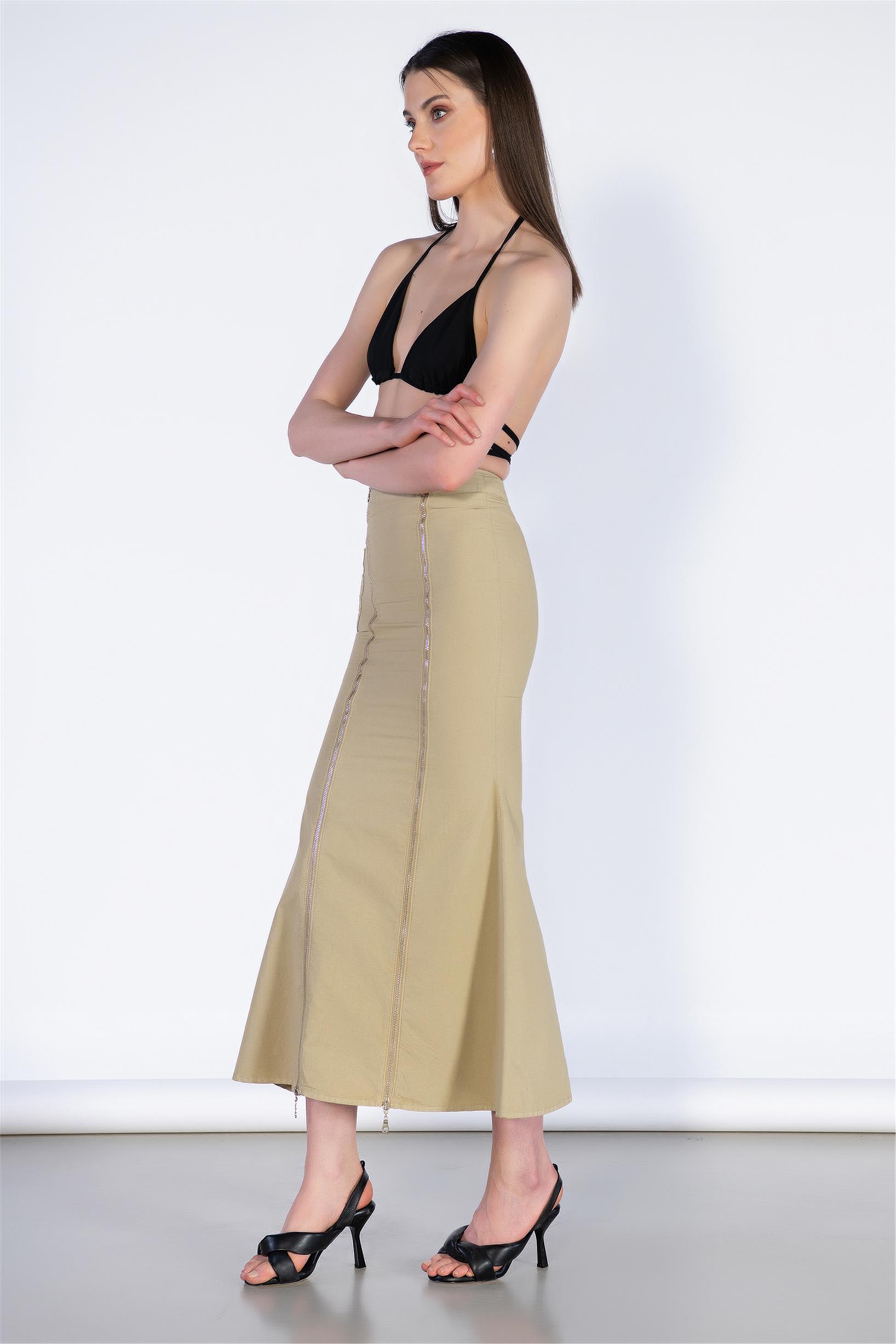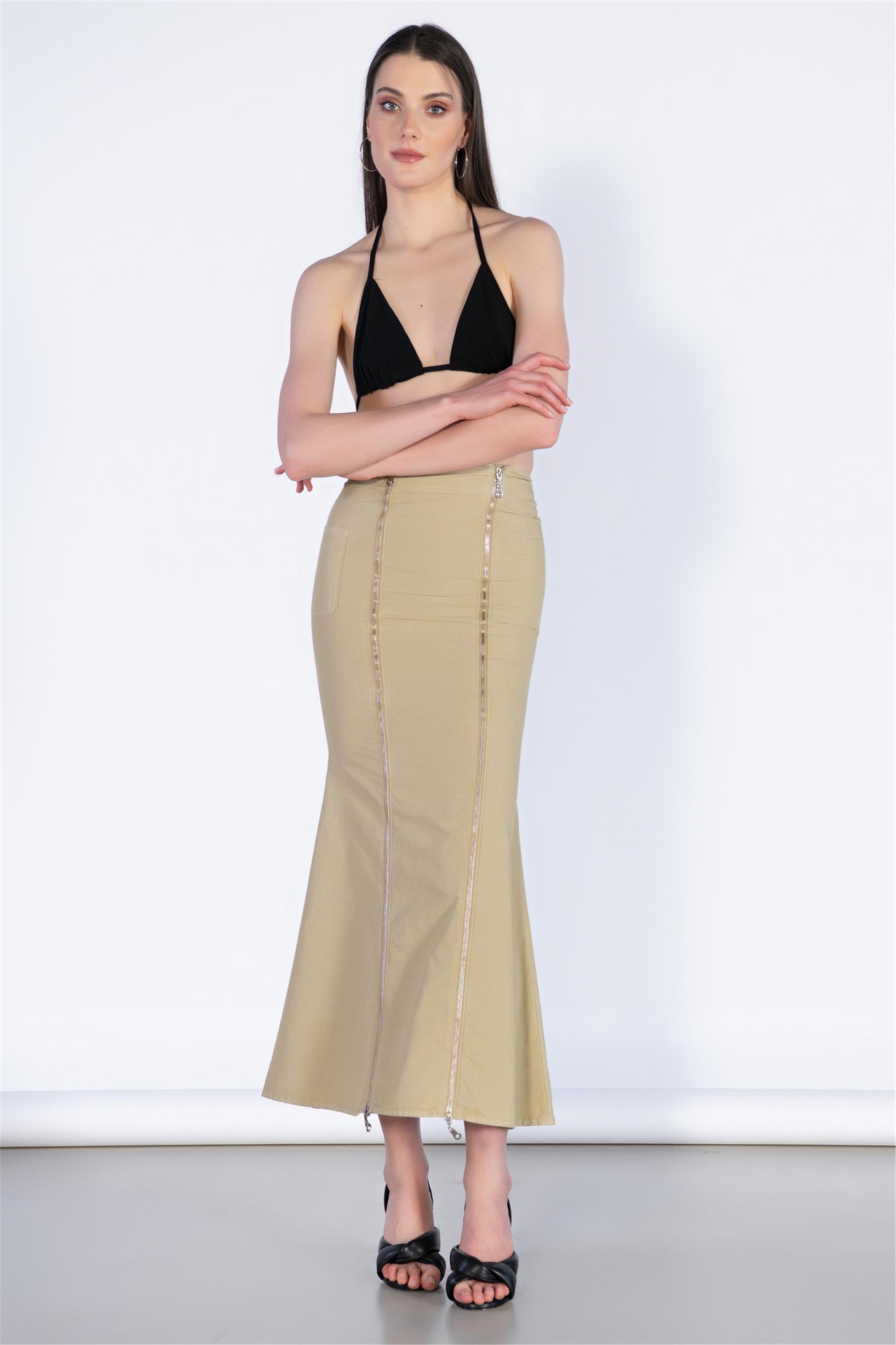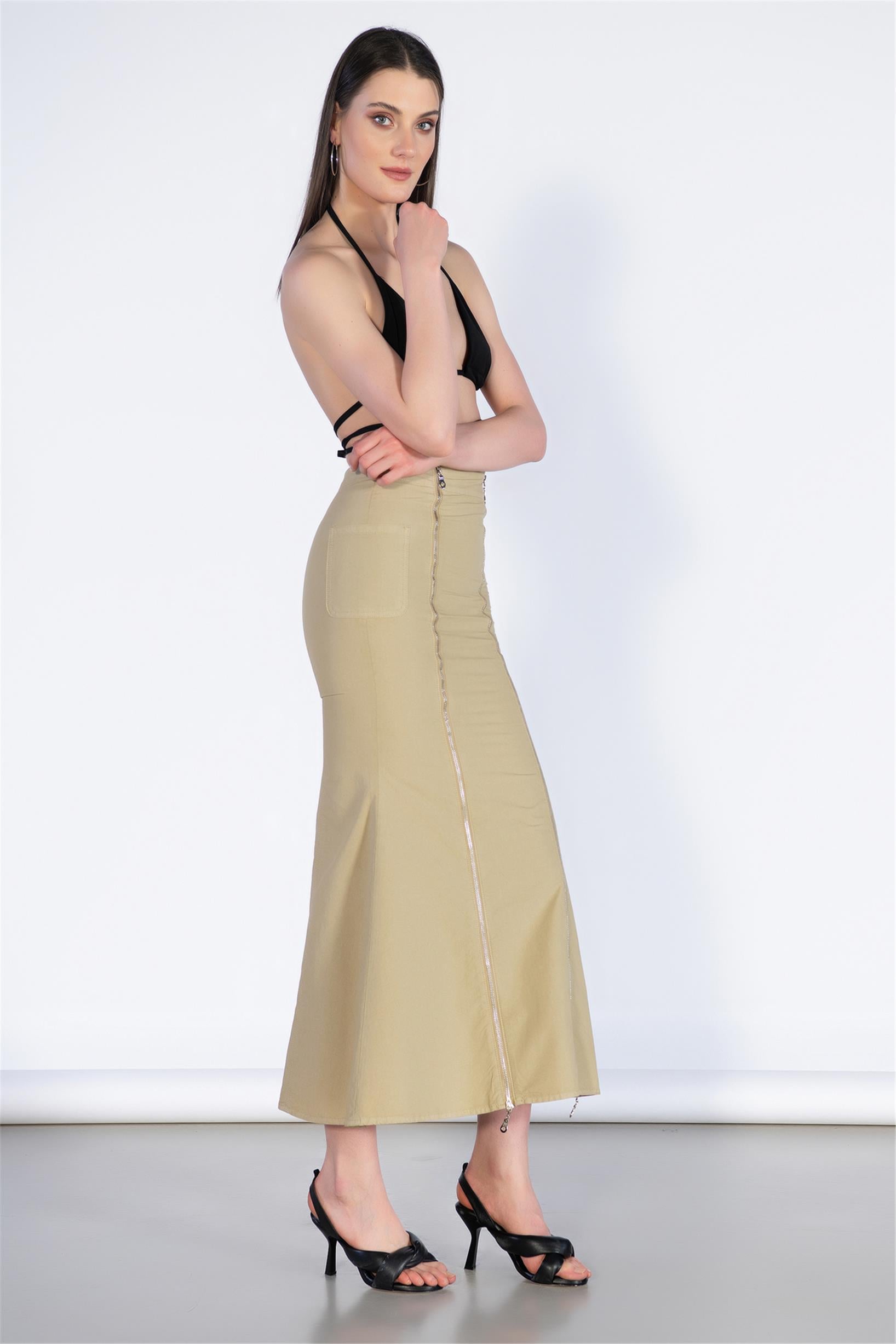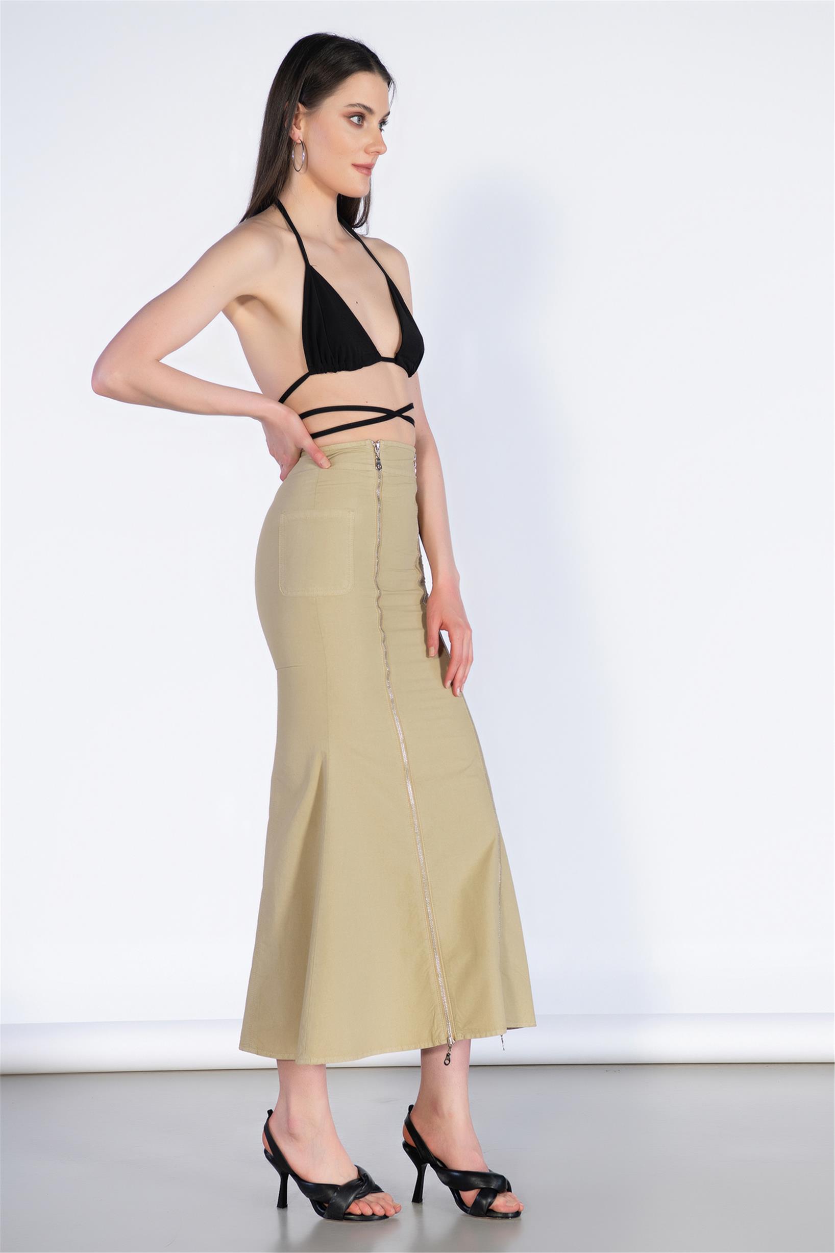Ön Fermuar ve Cep Detay Midi Boy Etek