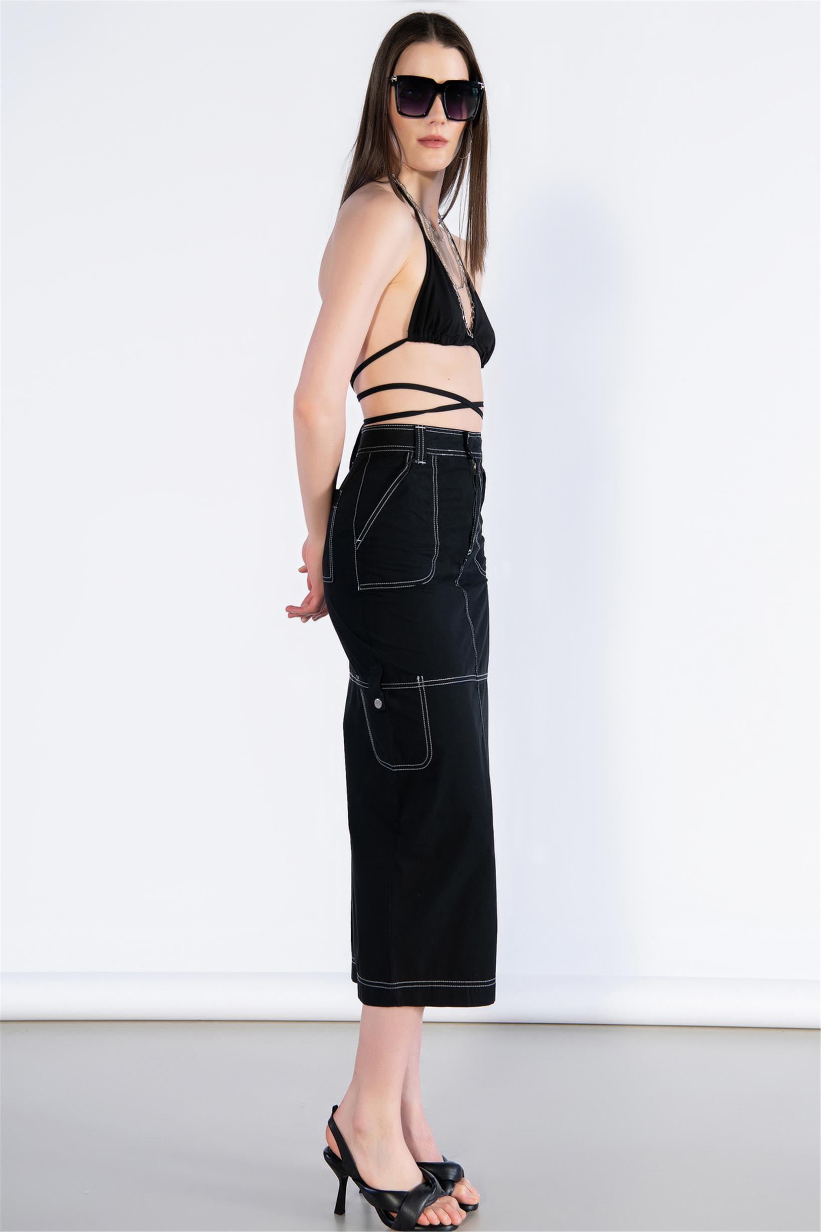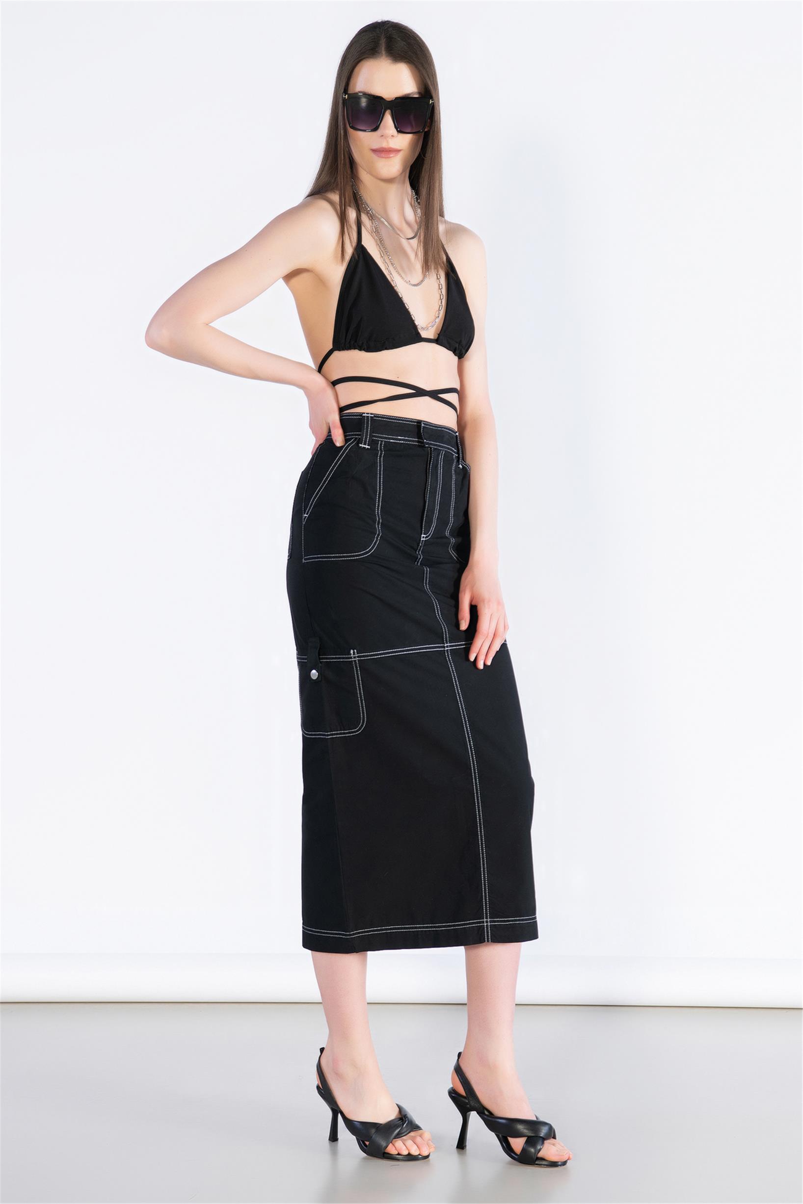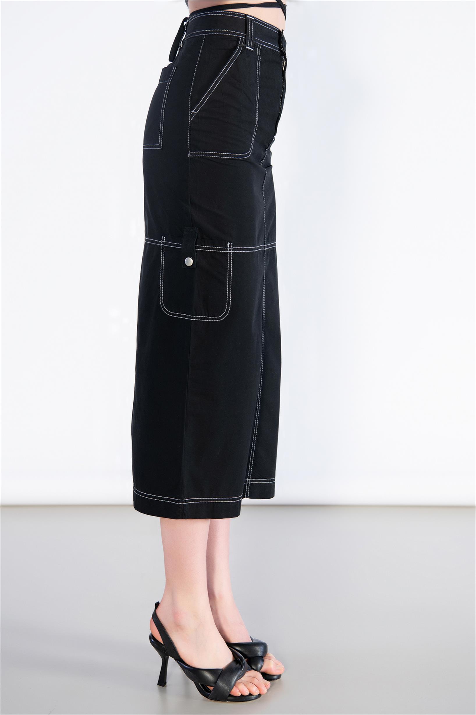 Siyah Dikiş ve Arka Yırtmaç Detay Midi Boy Kargo Etek