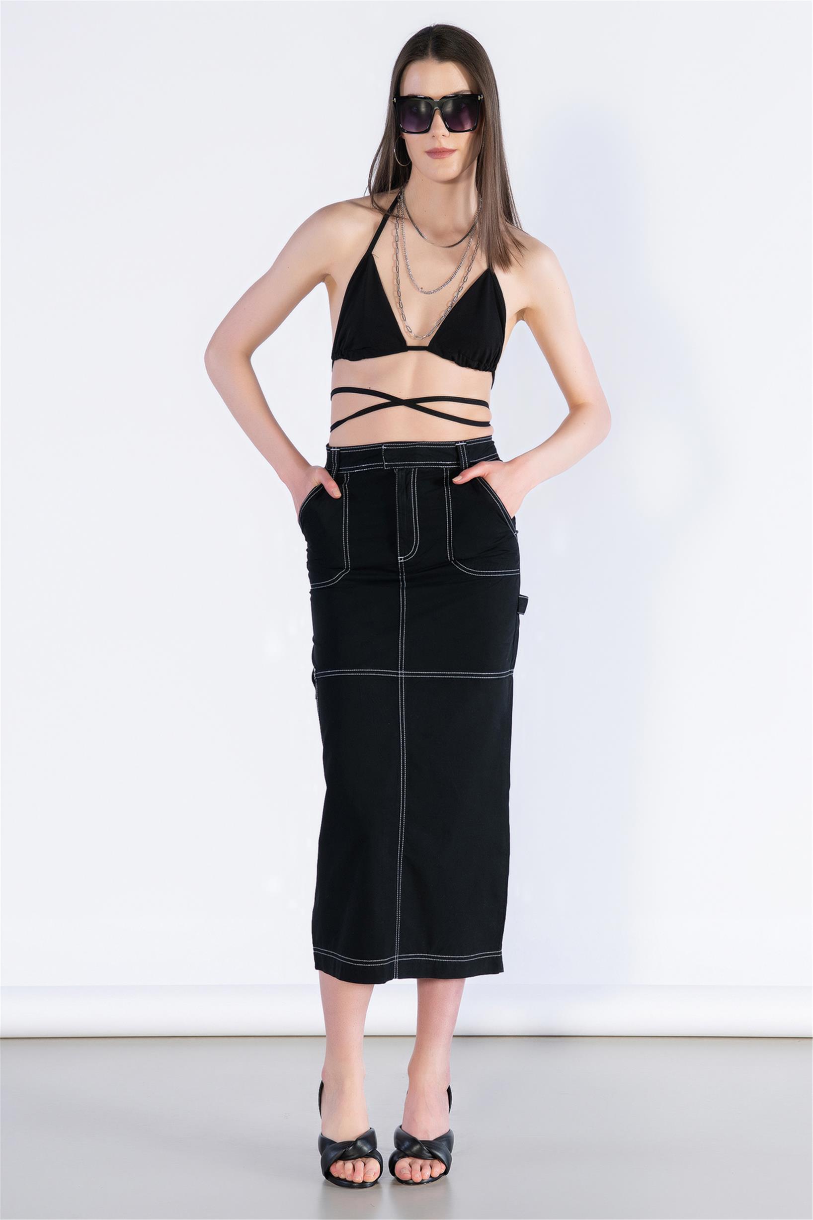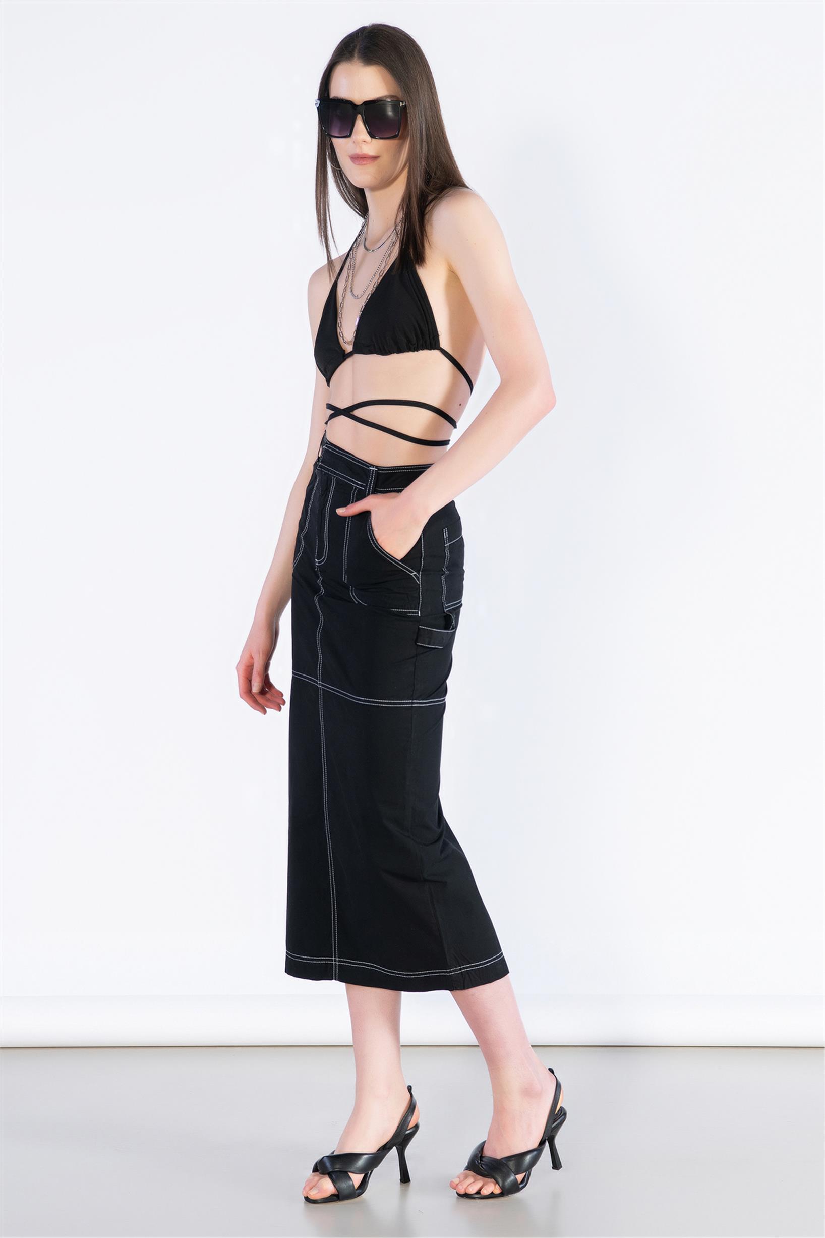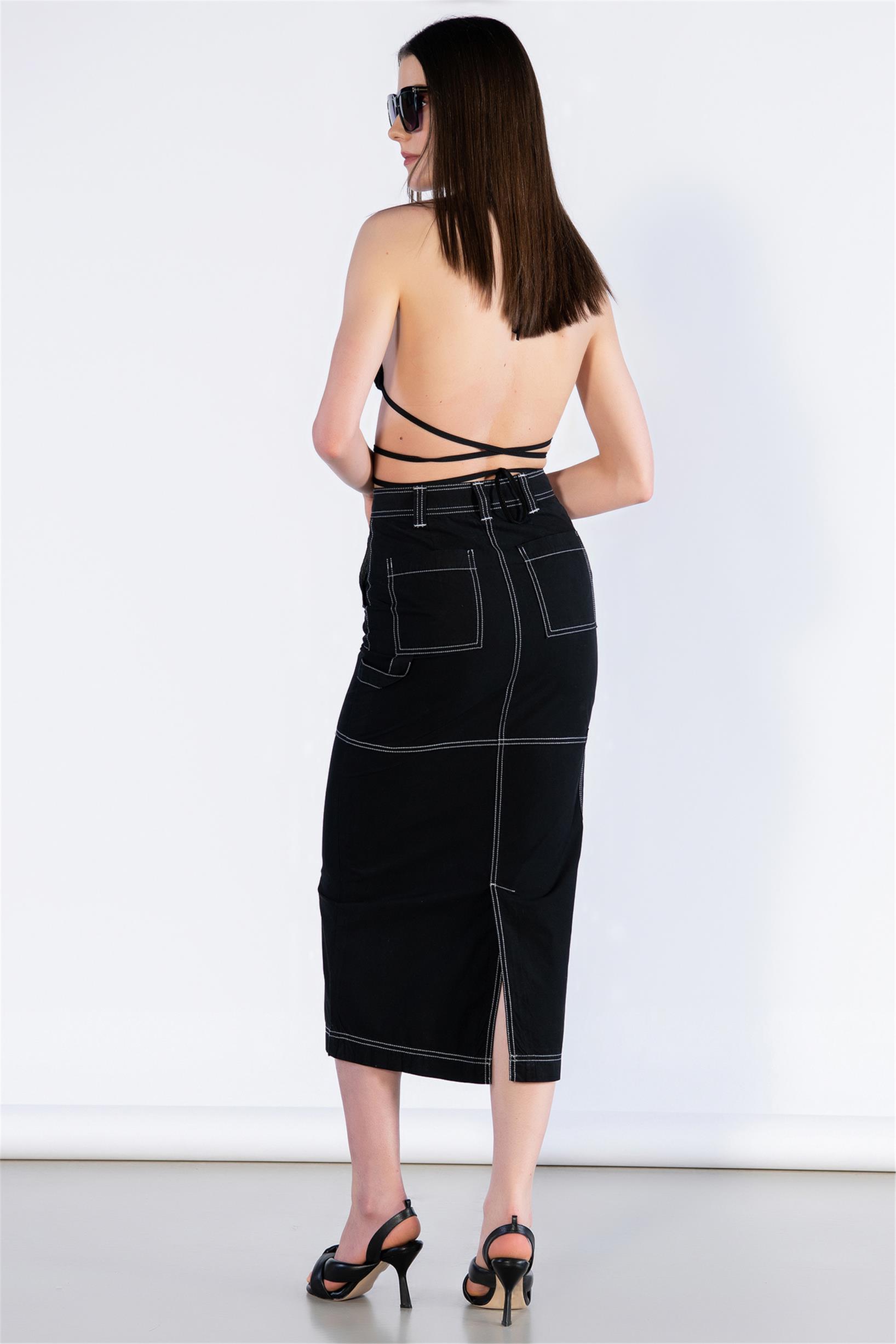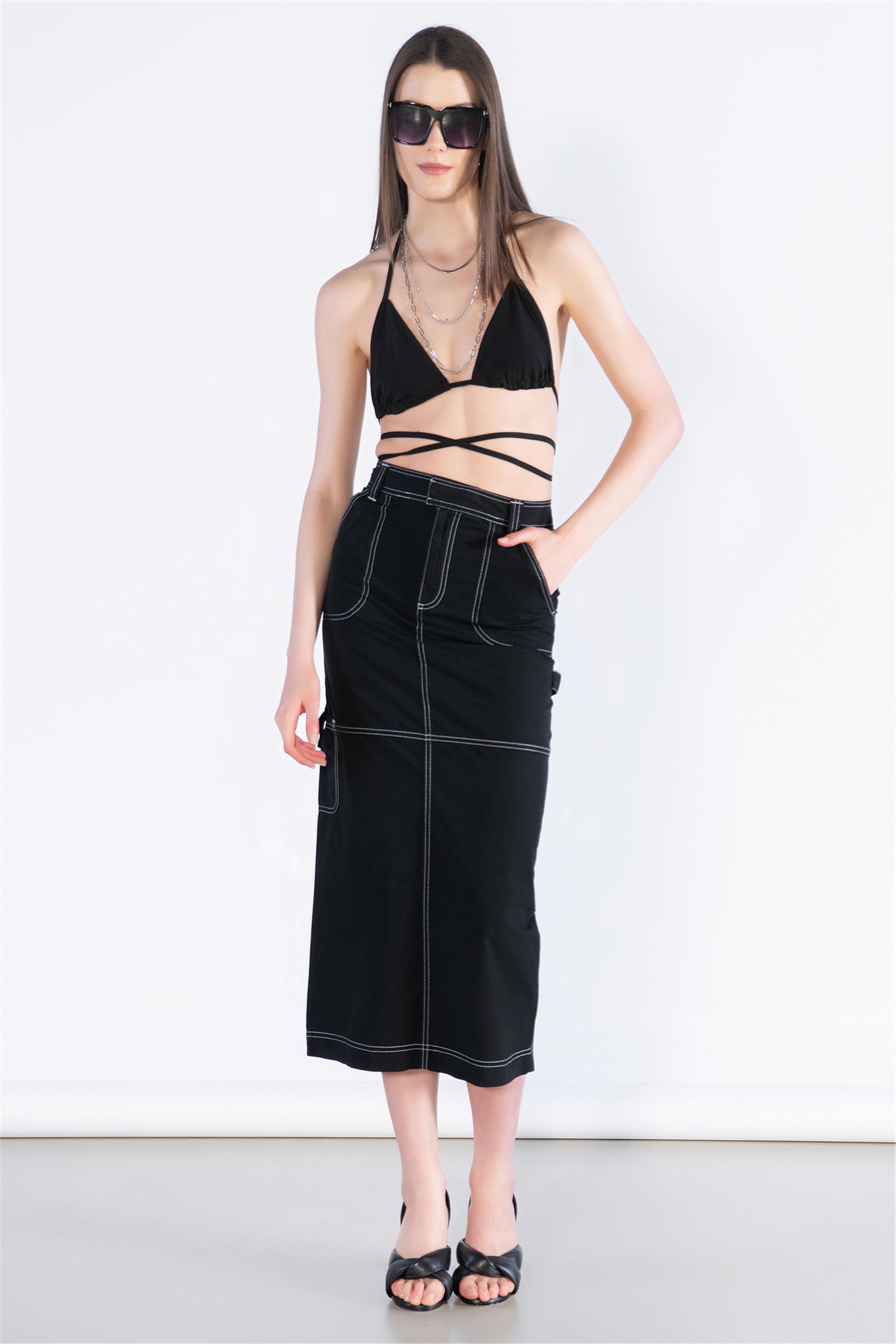 Siyah Dikiş ve Arka Yırtmaç Detay Midi Boy Kargo Etek