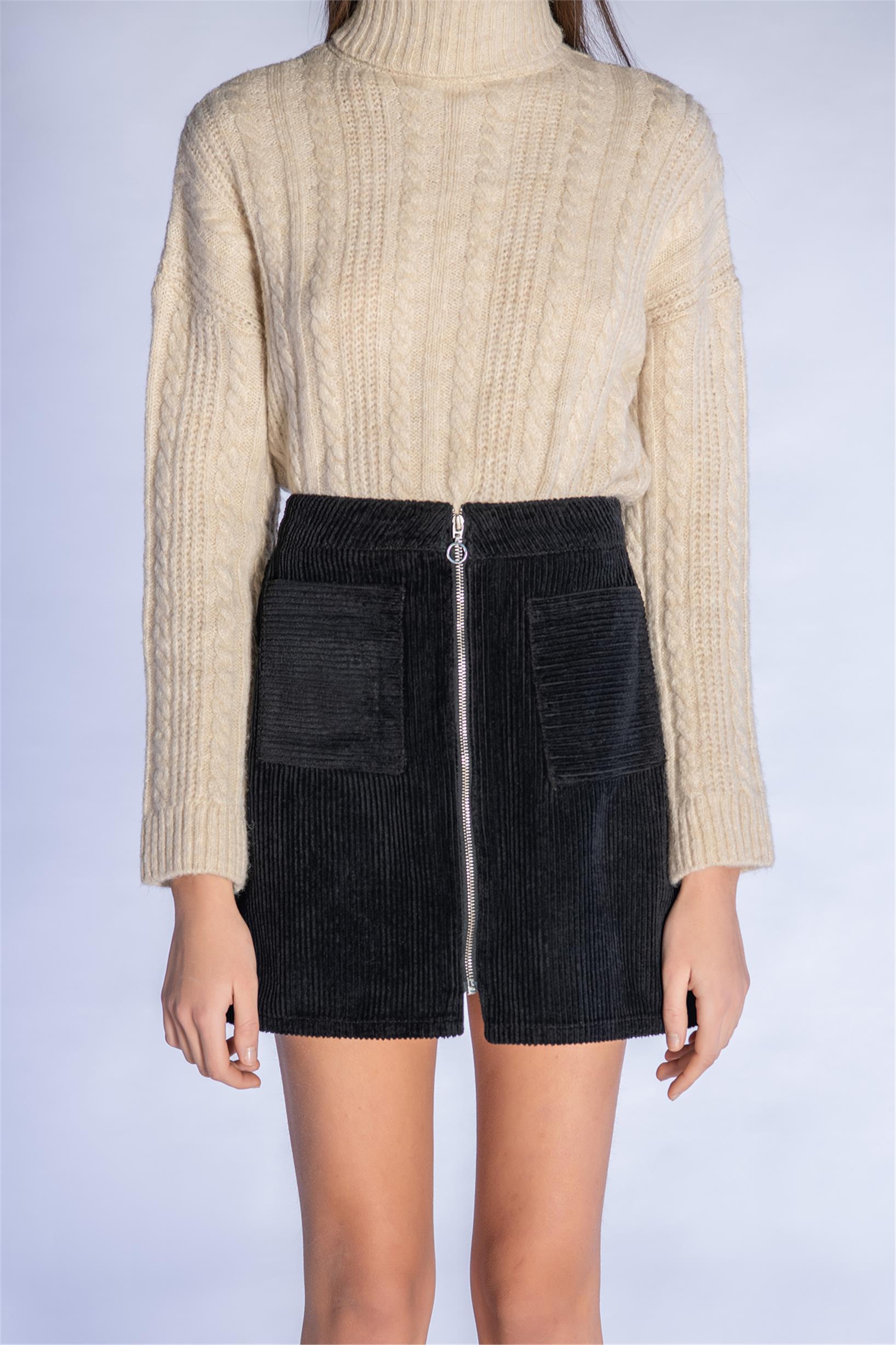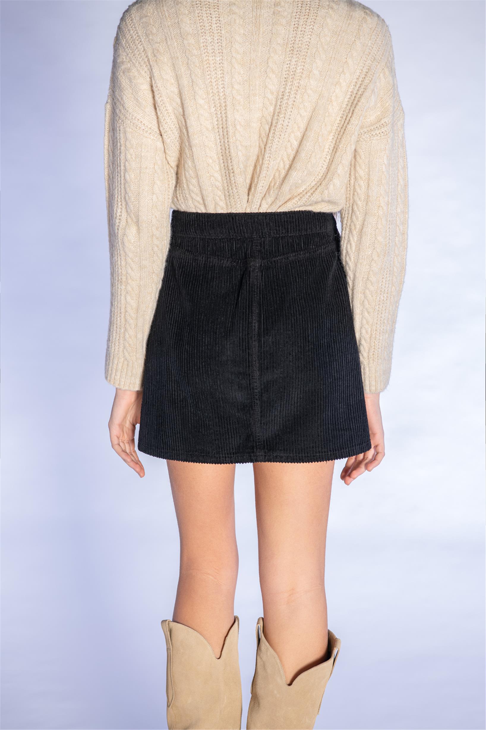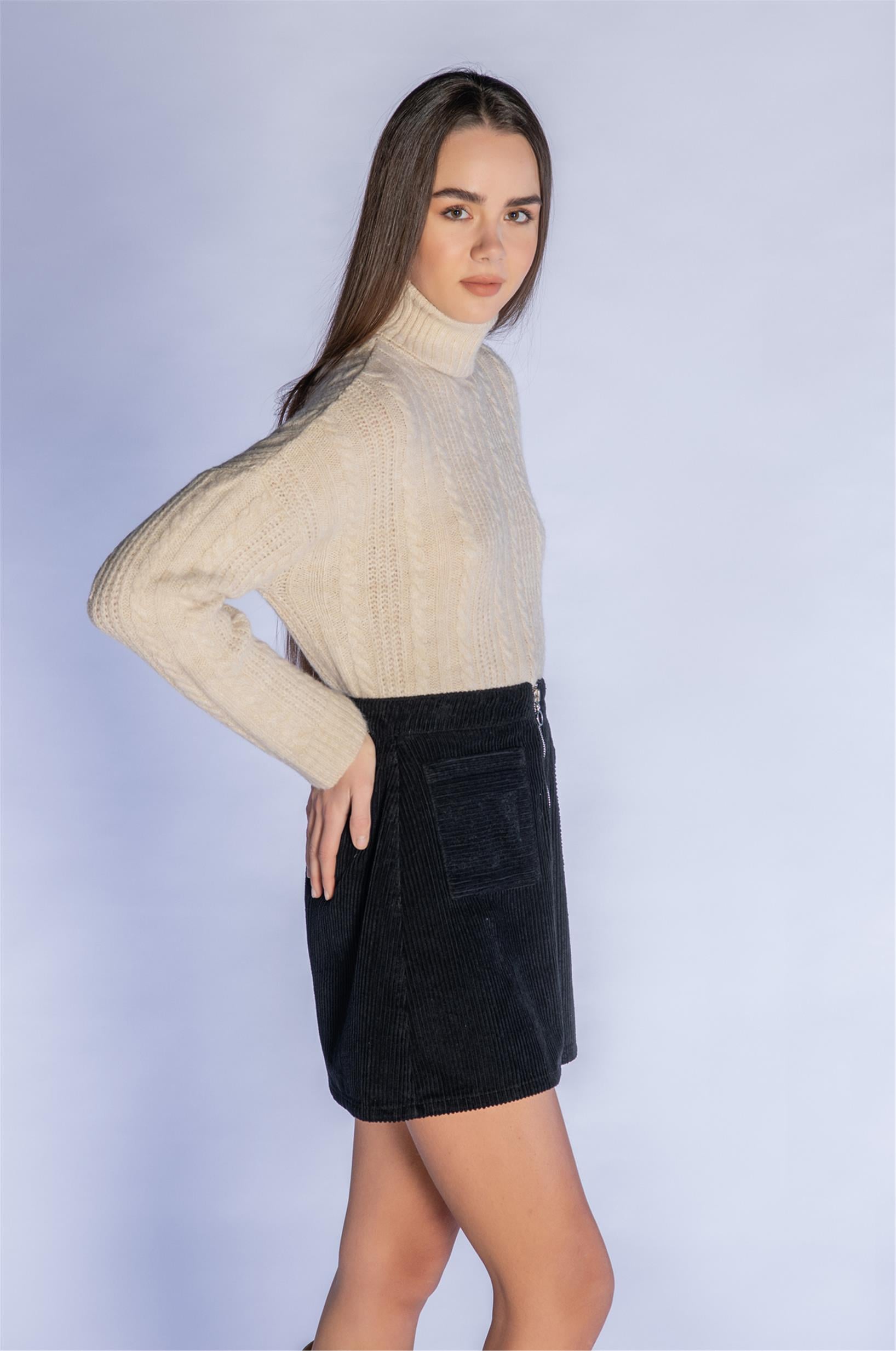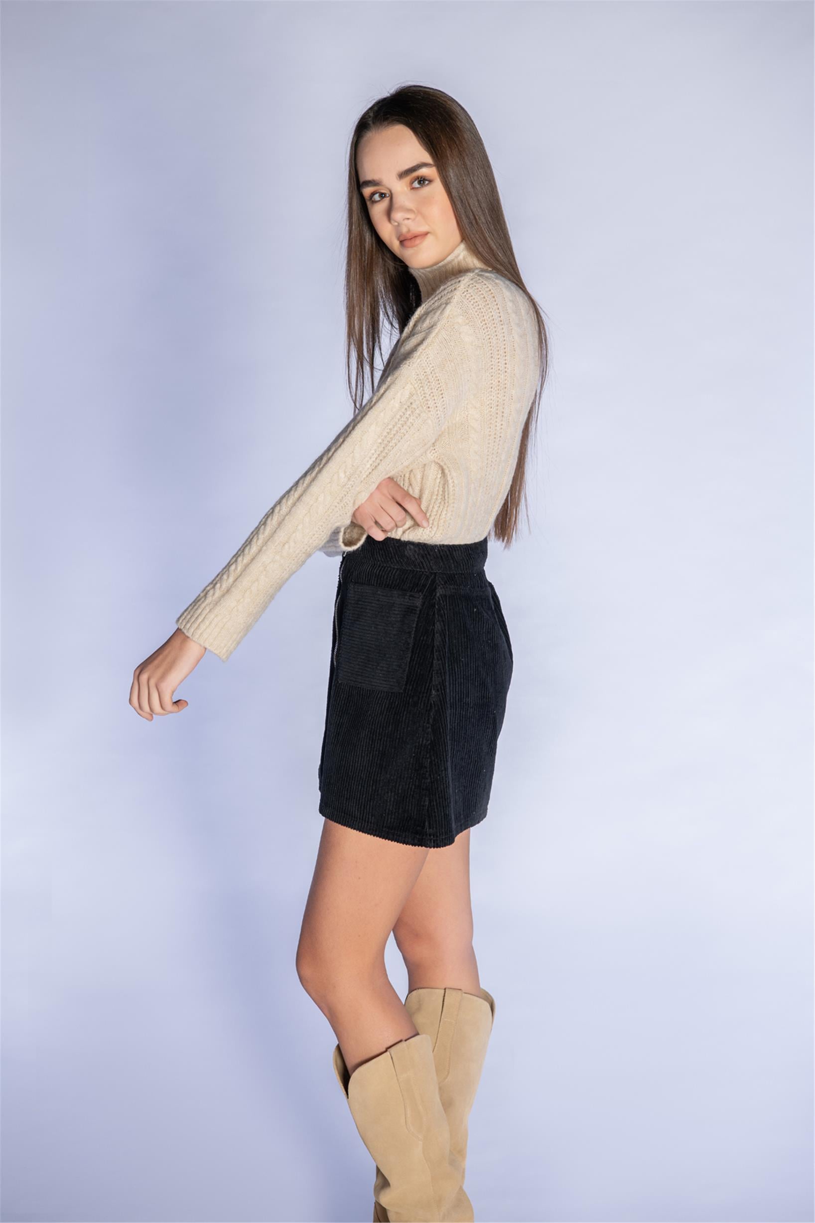Siyah Fitilli Kadife Ön Cep Detay Mini Etek