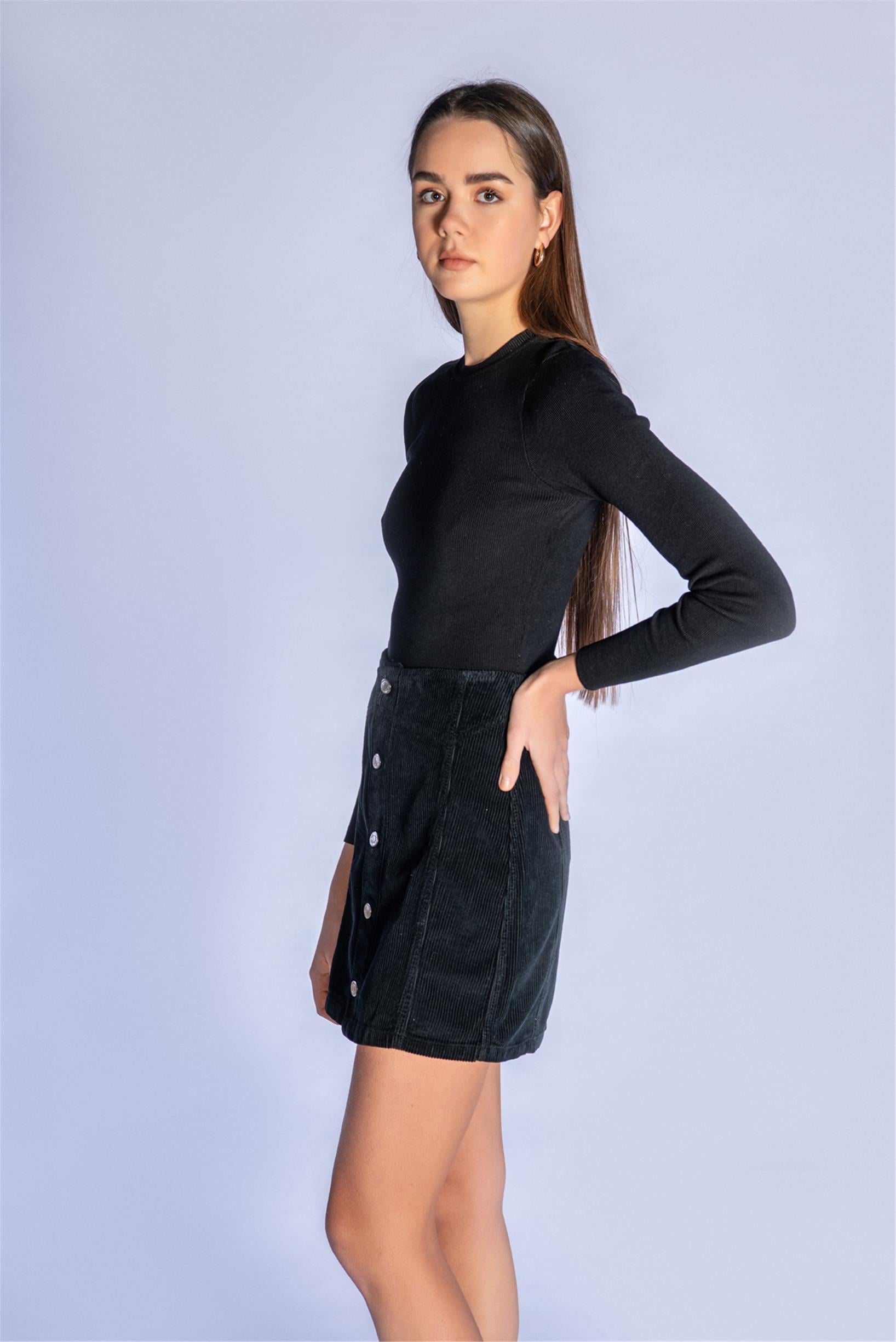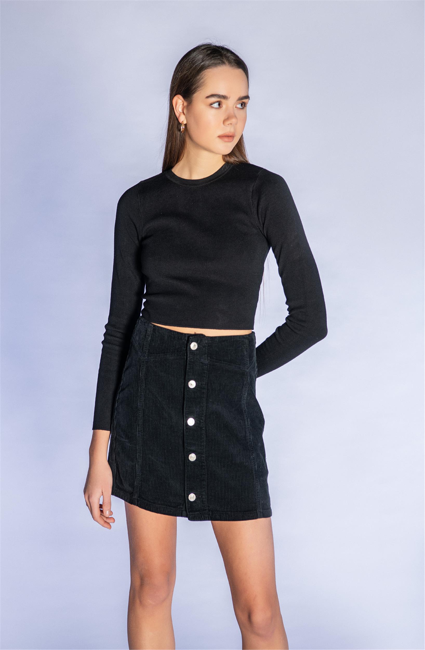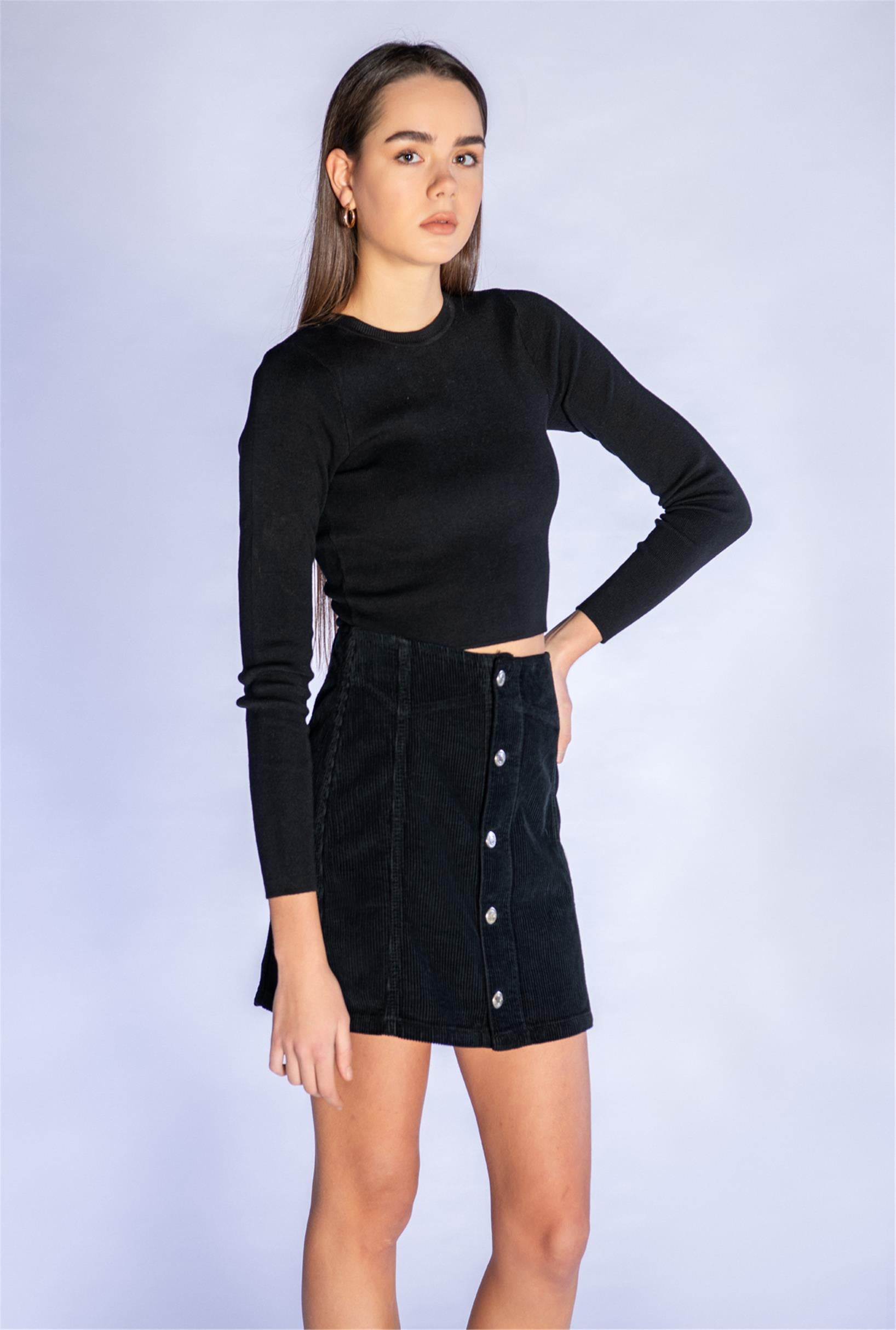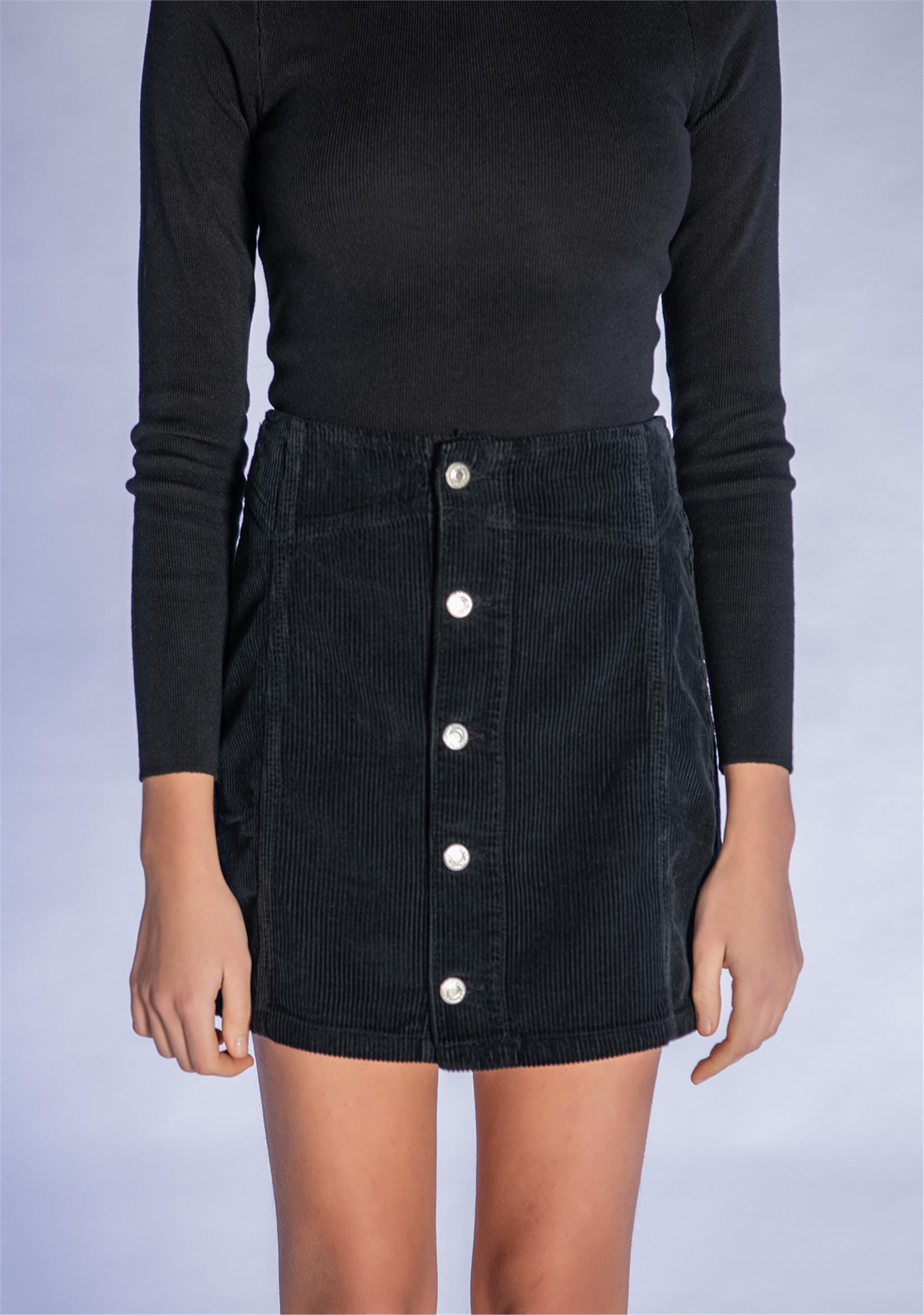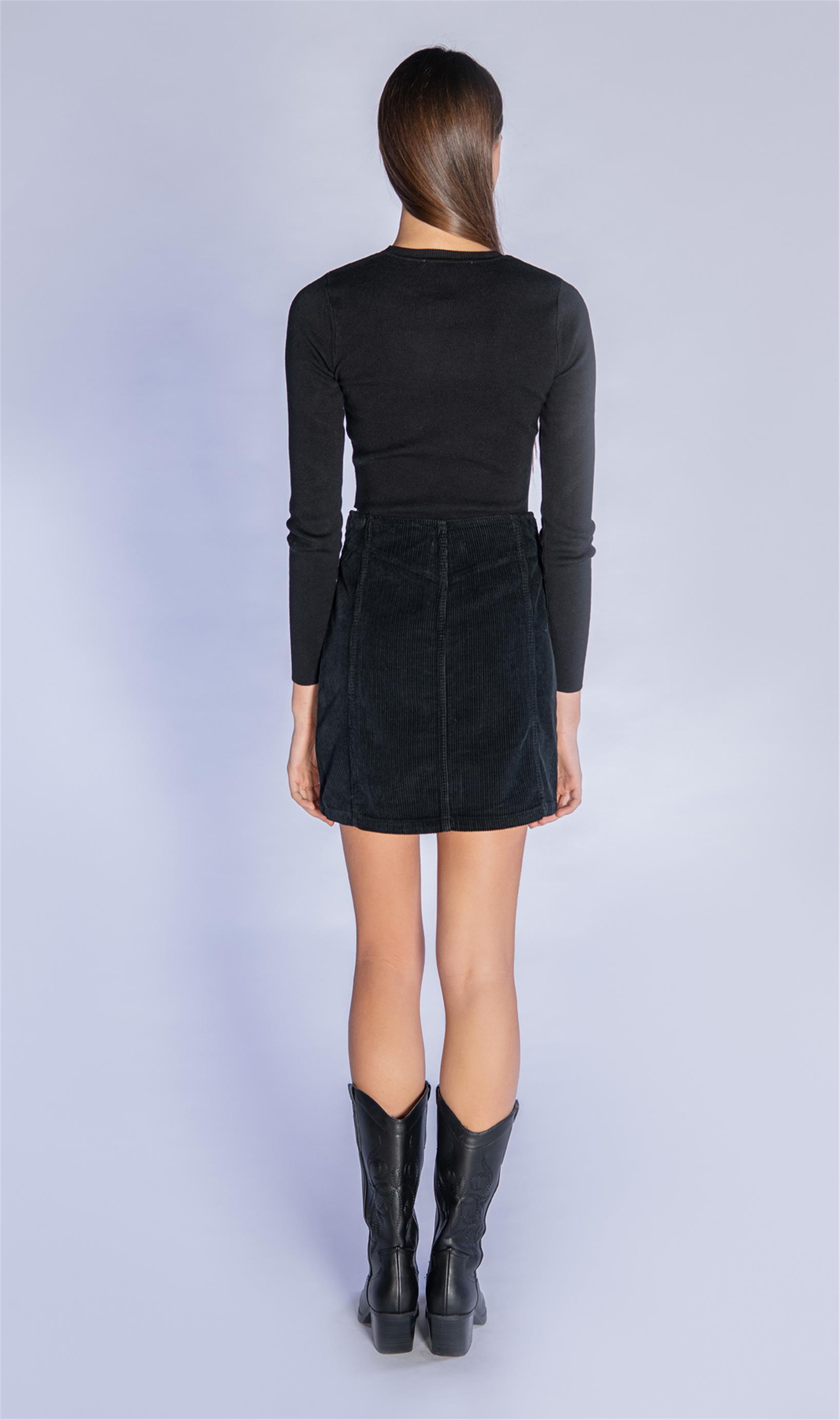 Siyah Ftilli Kadife Düğmeli Mini Etek