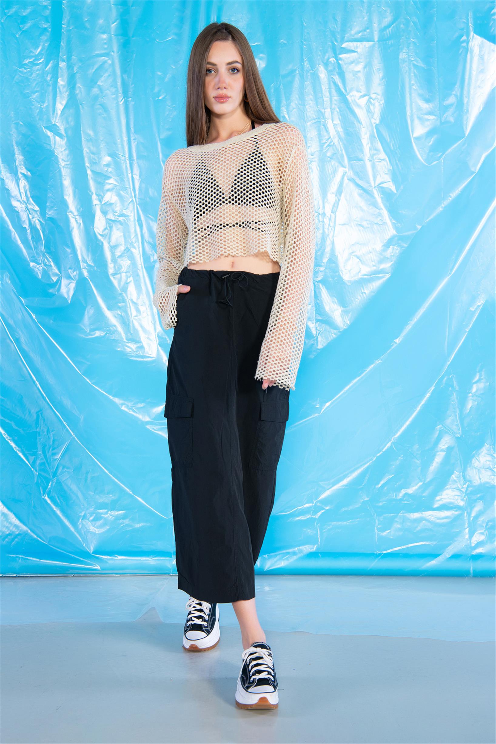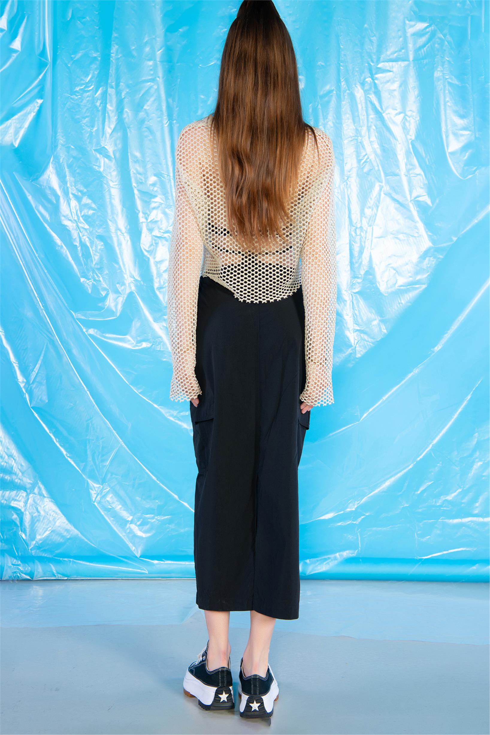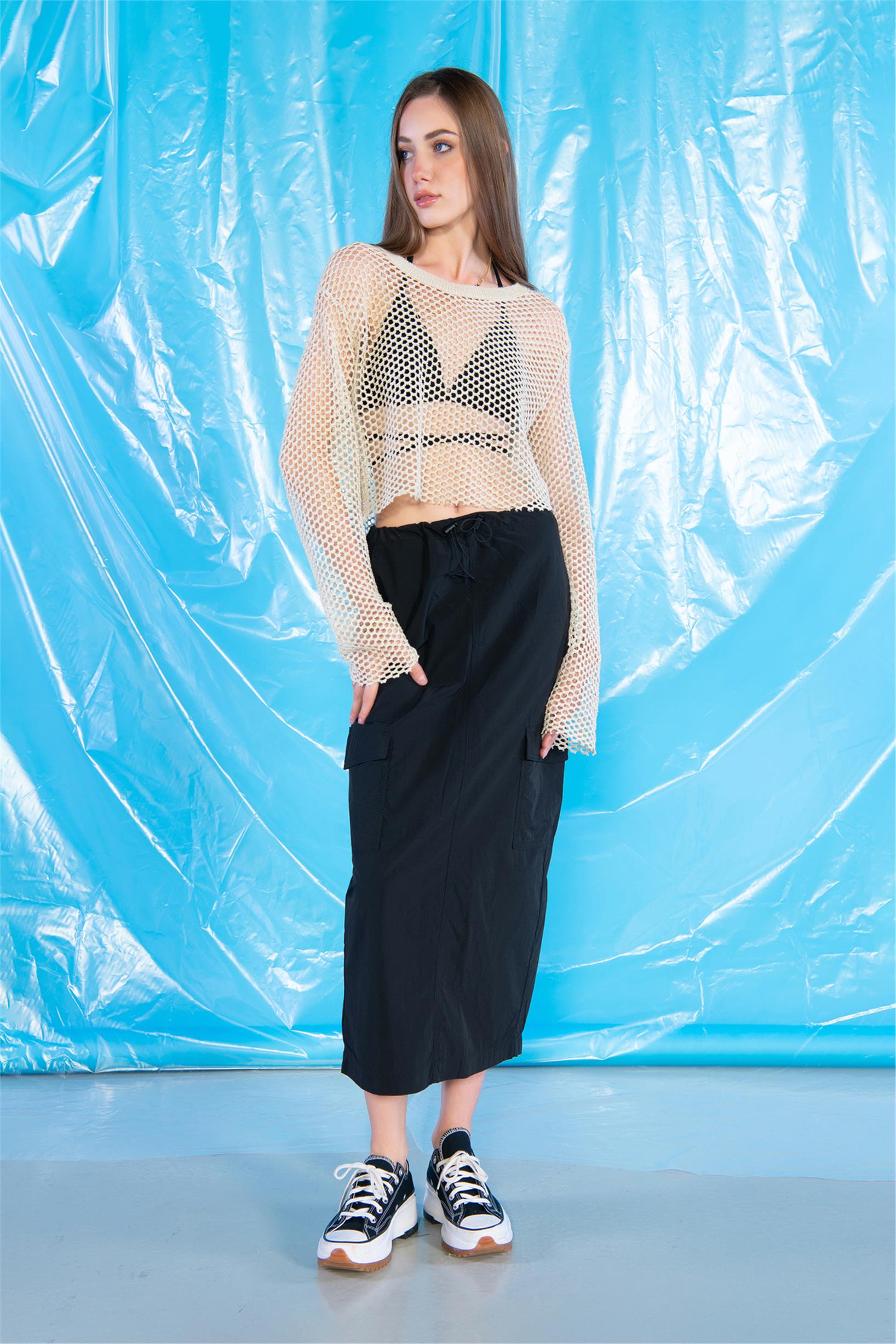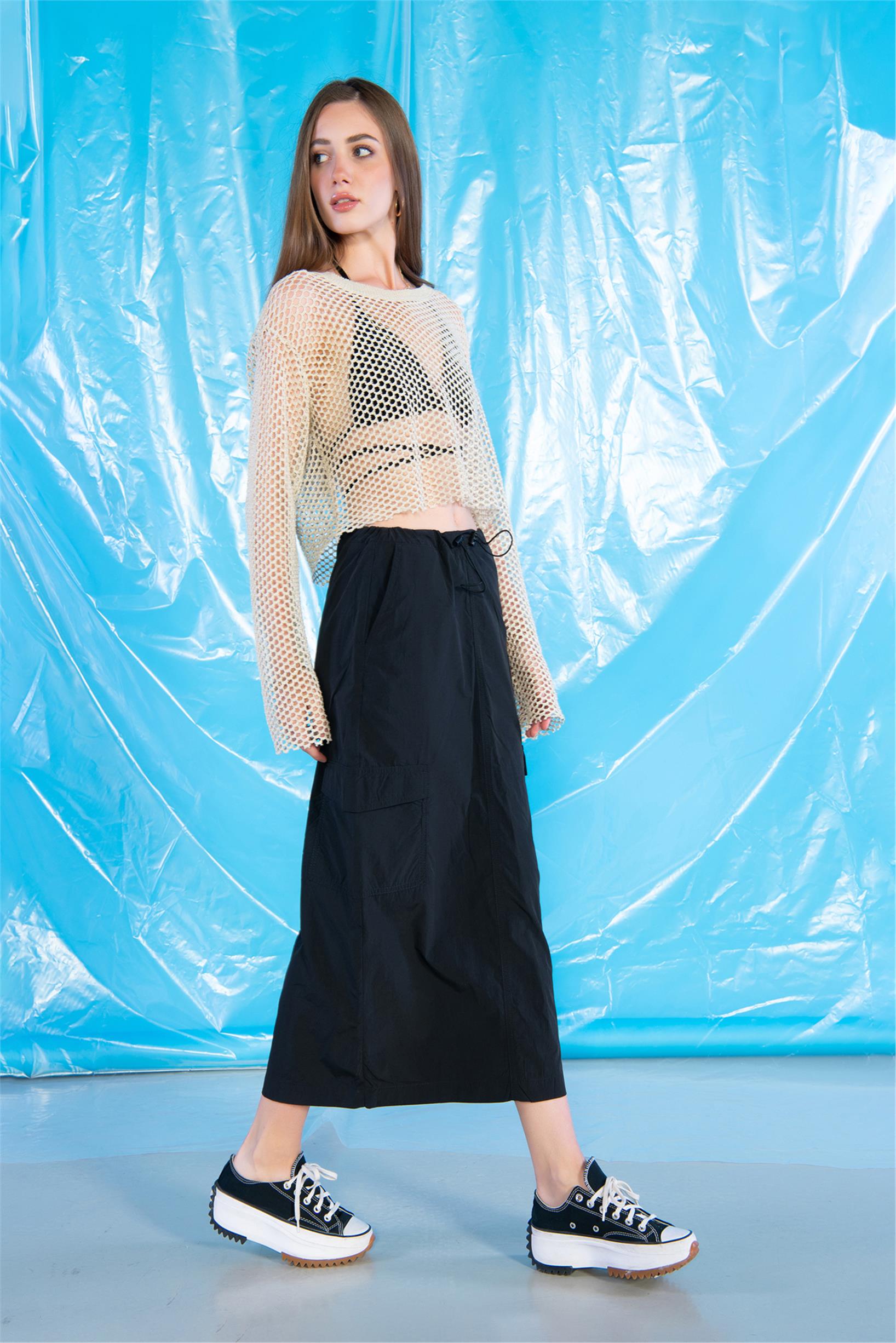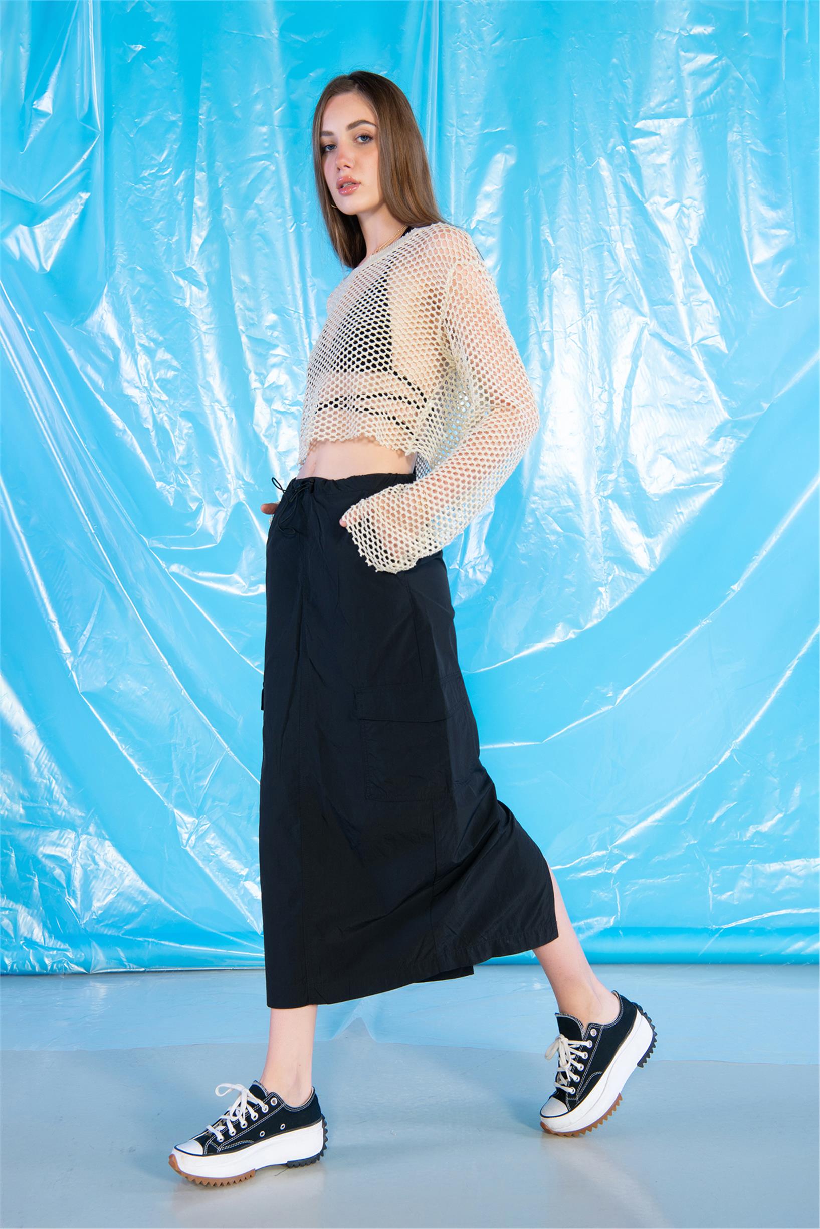 Siyah Normal Bel Stoperli Midi Boy Kargo Paraşüt Etek