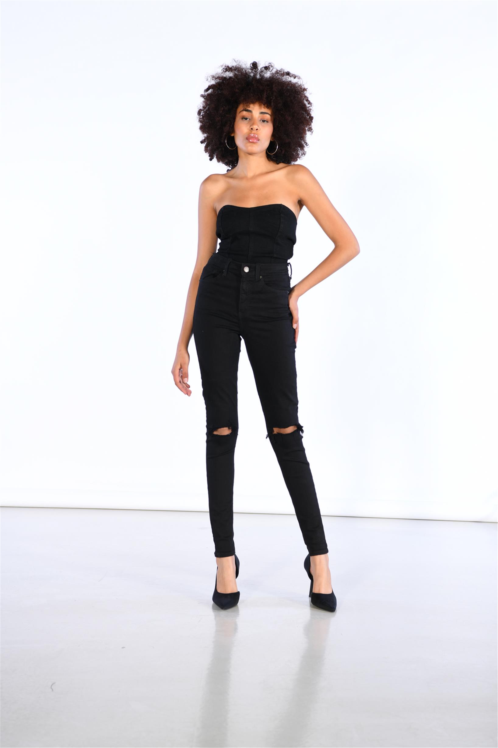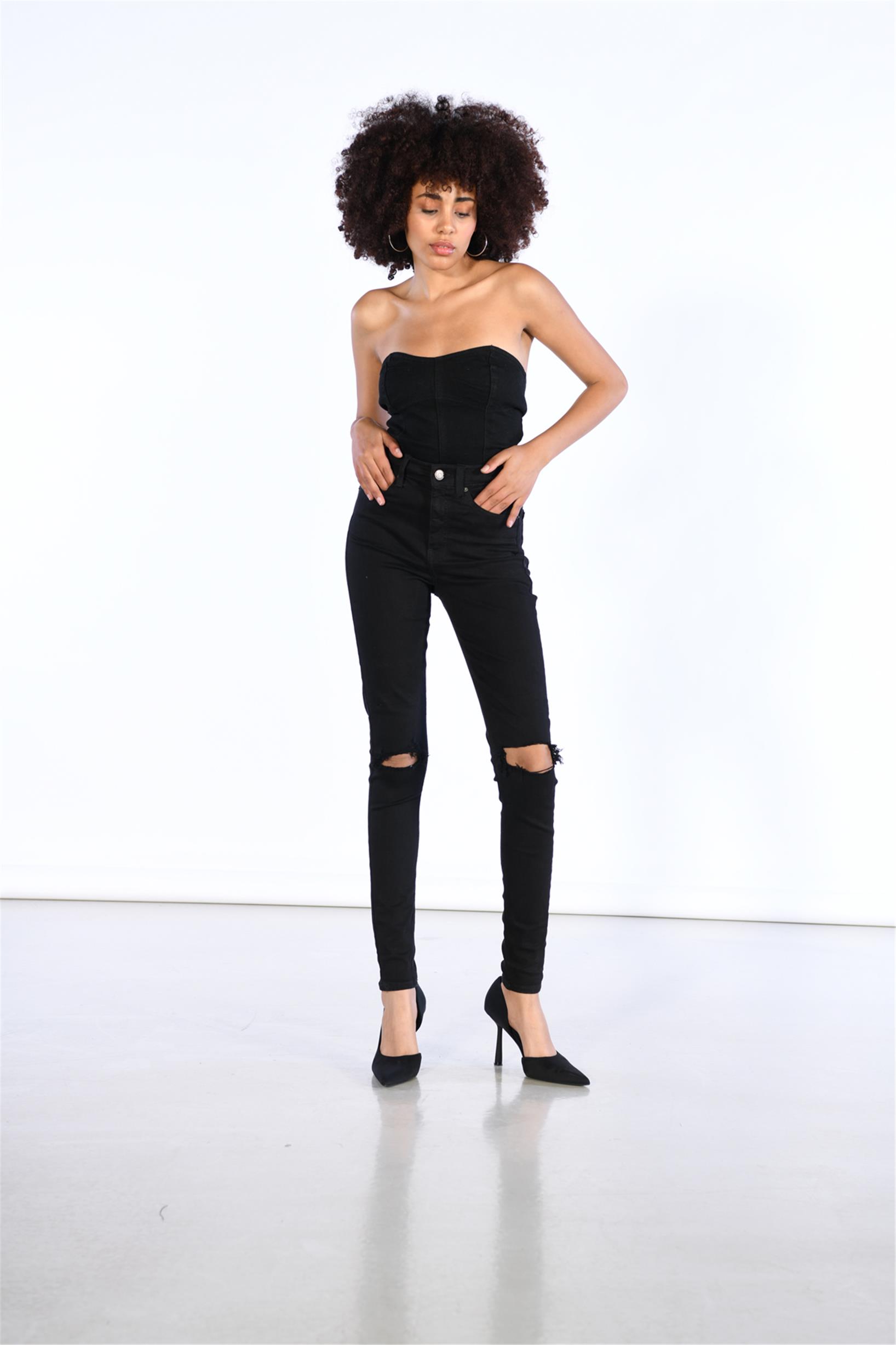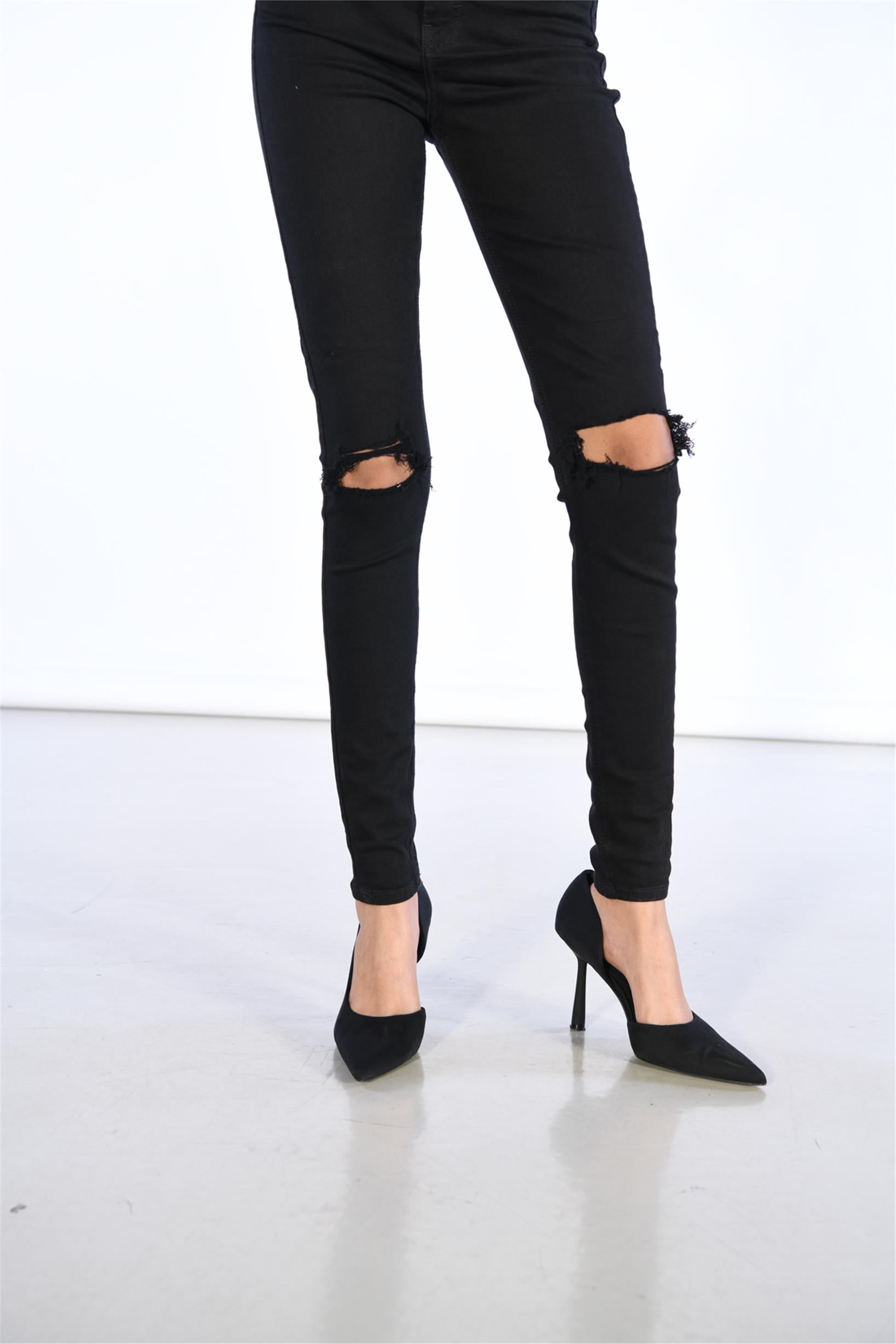 Siyah Yüksek Bel Diz Lazer Detaylı Skinny Jeans