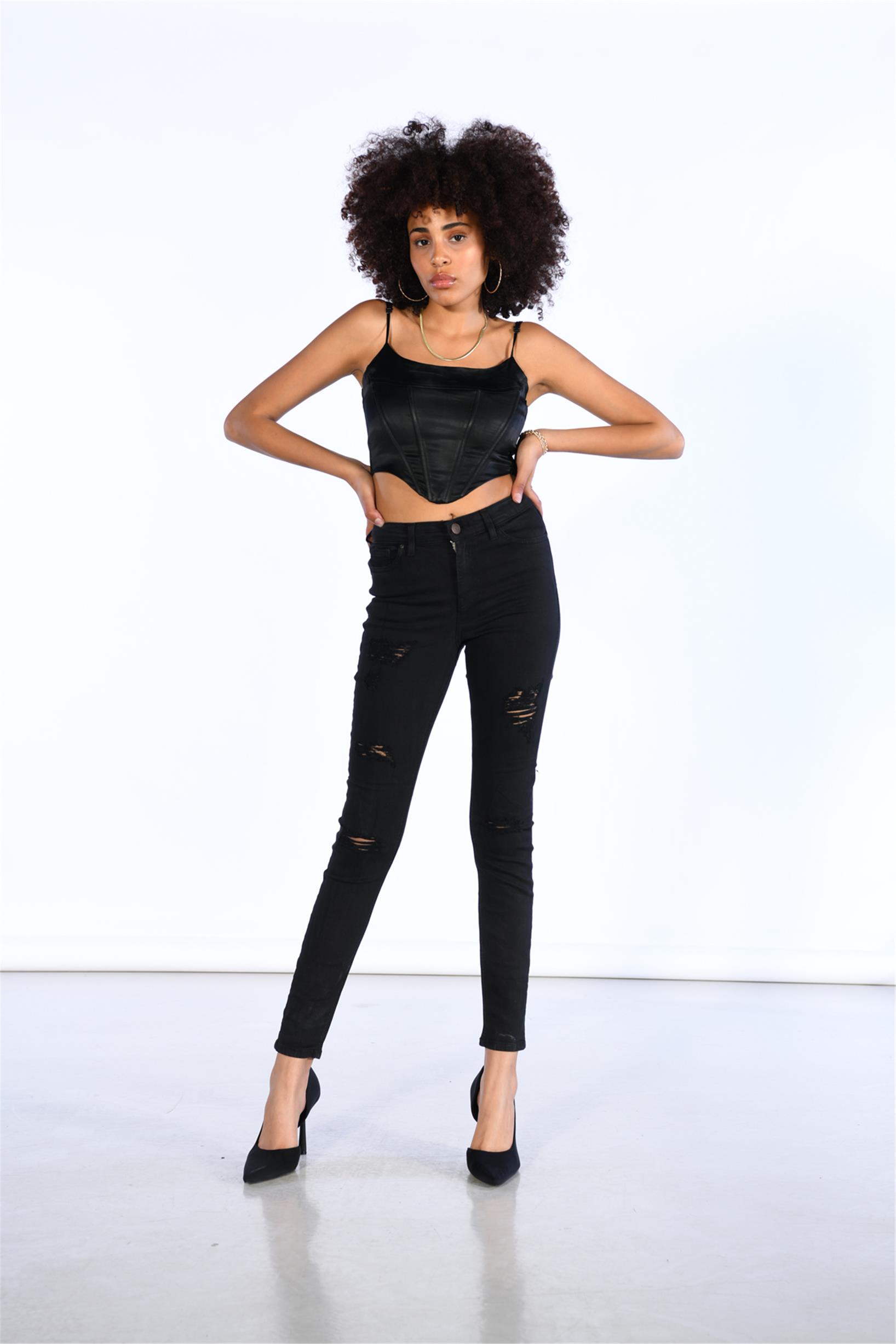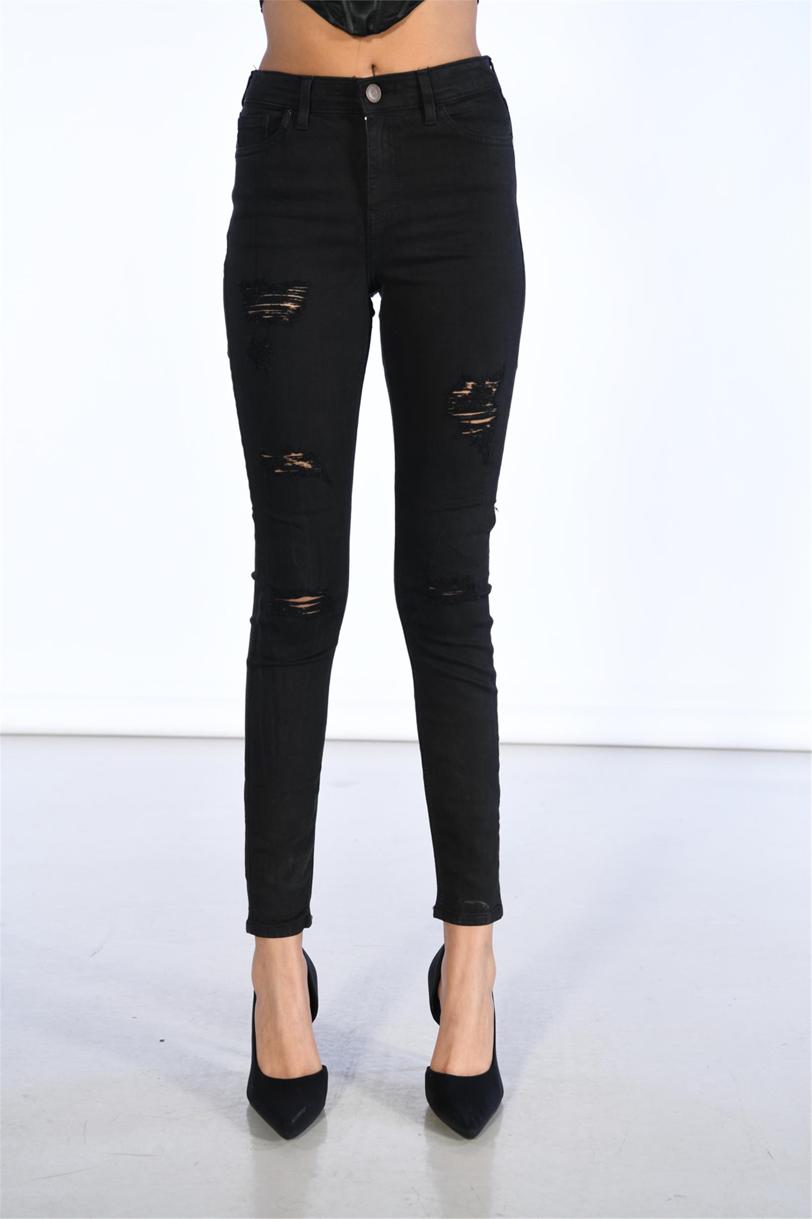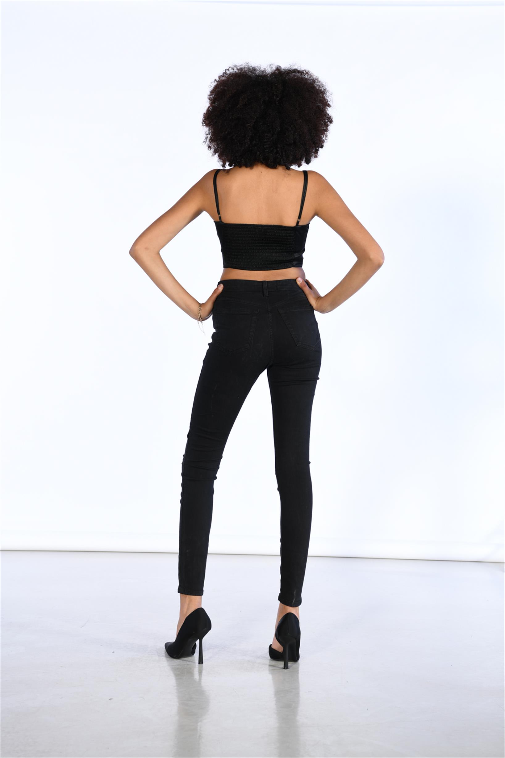 Siyah Yüksek Bel Lazer Detayı Skinny Jeans