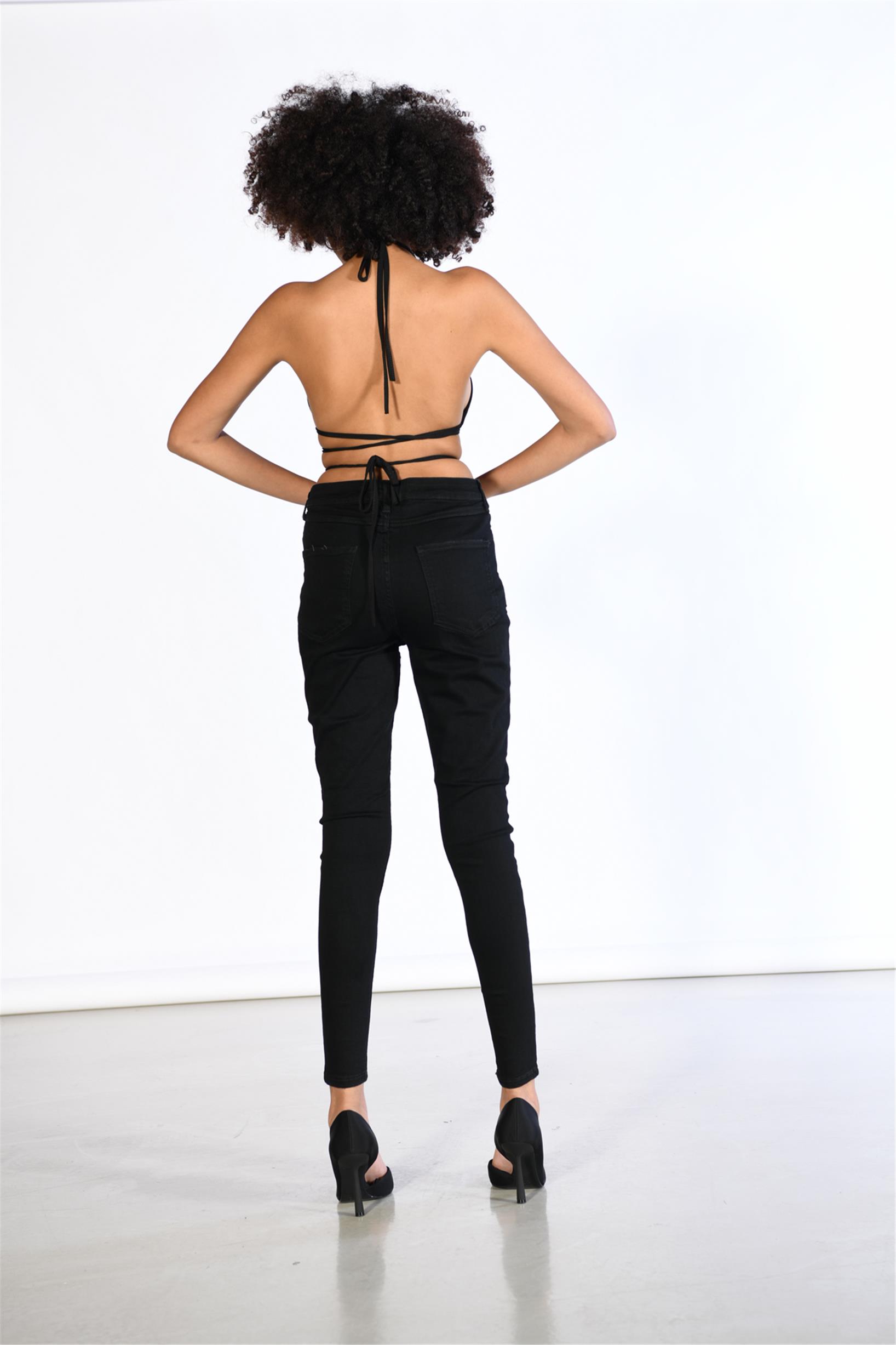 Siyah Yüksek Bel Lazer Detaylı Skinny Jeans
