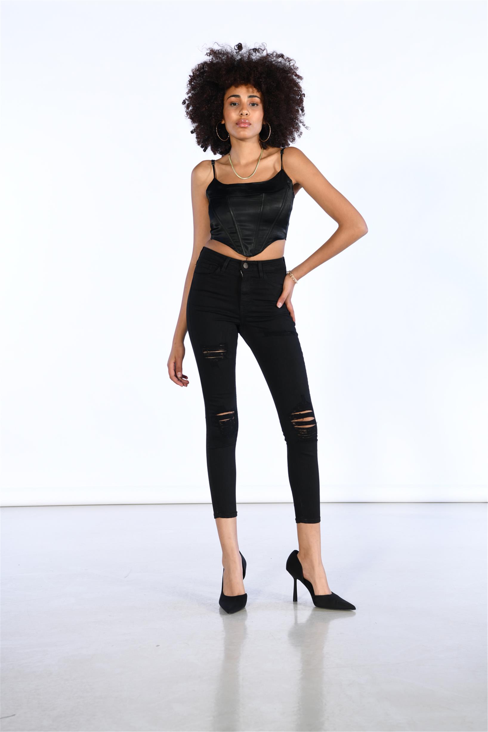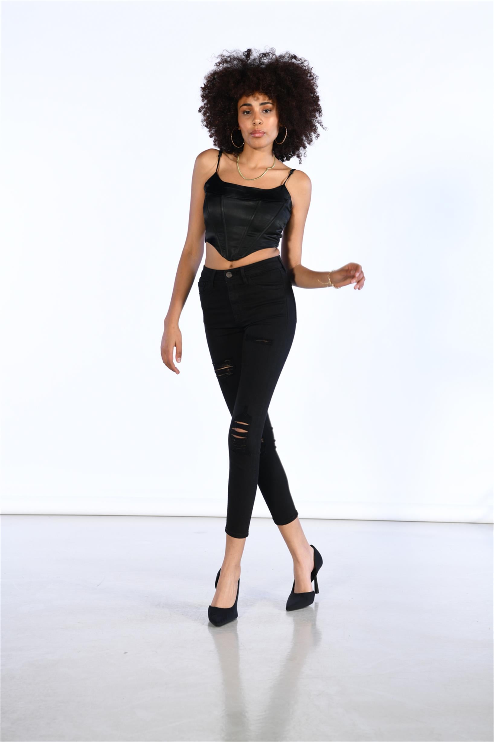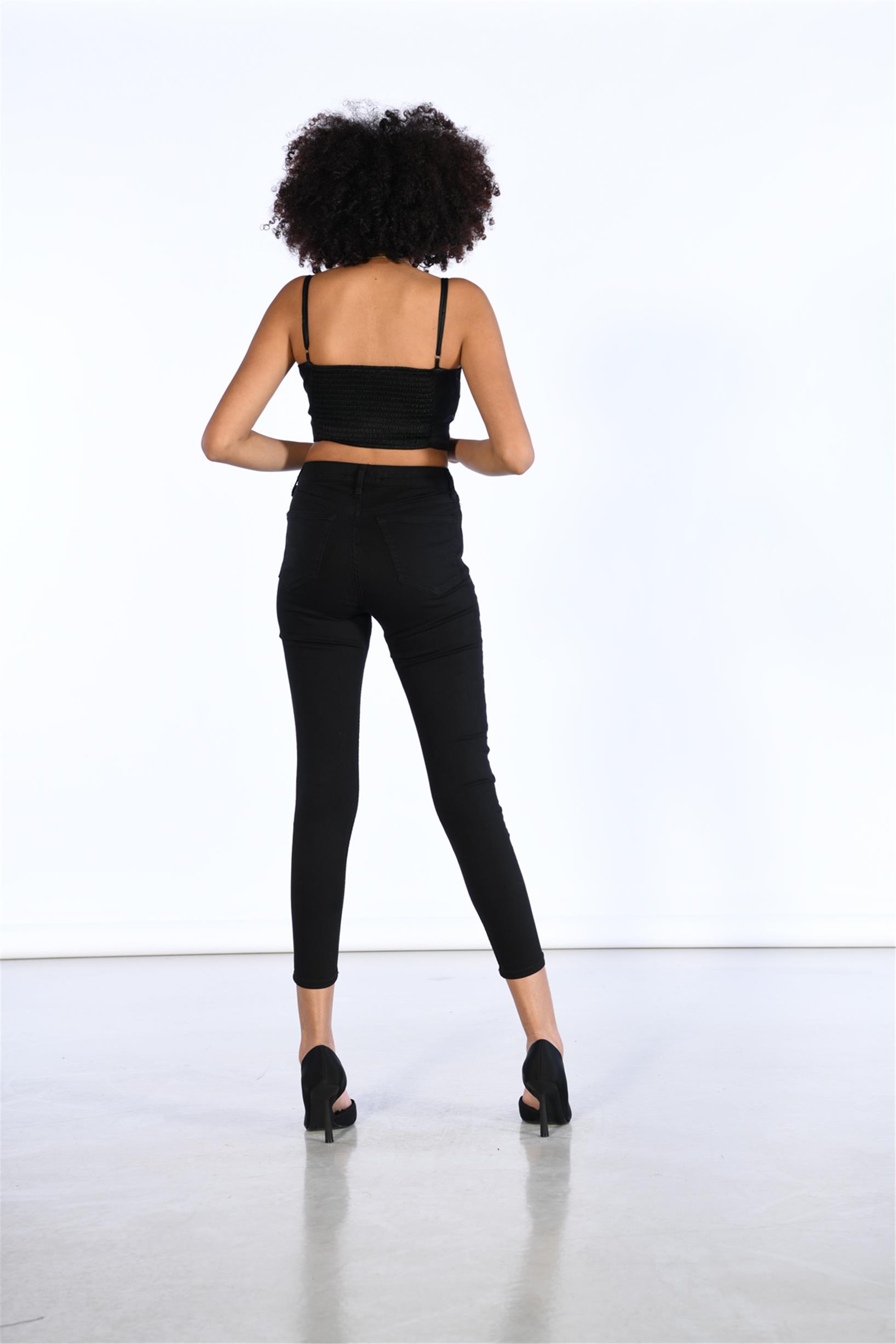 Siyah Yüksek Bel Lazer Detaylı Skinny Jeans