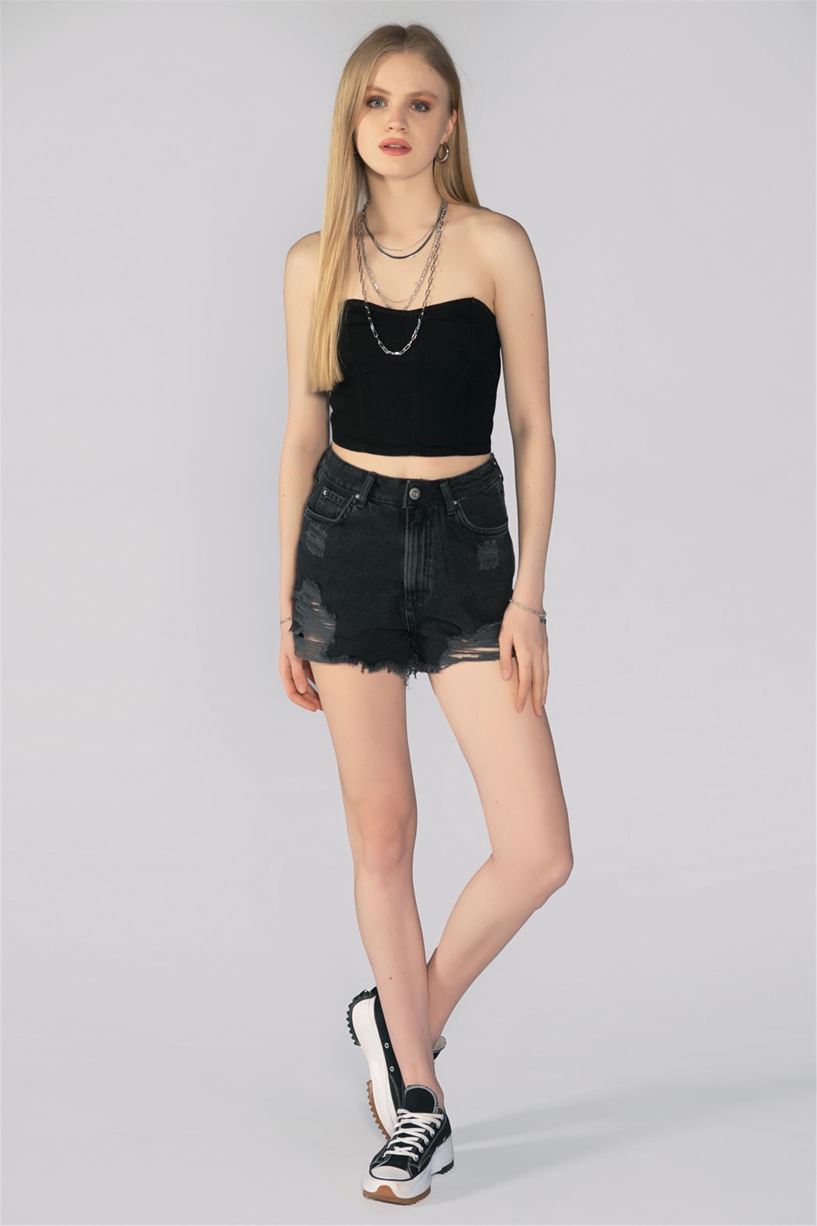 Siyah Yüksek Bel Lazer Kesim Kot Şort