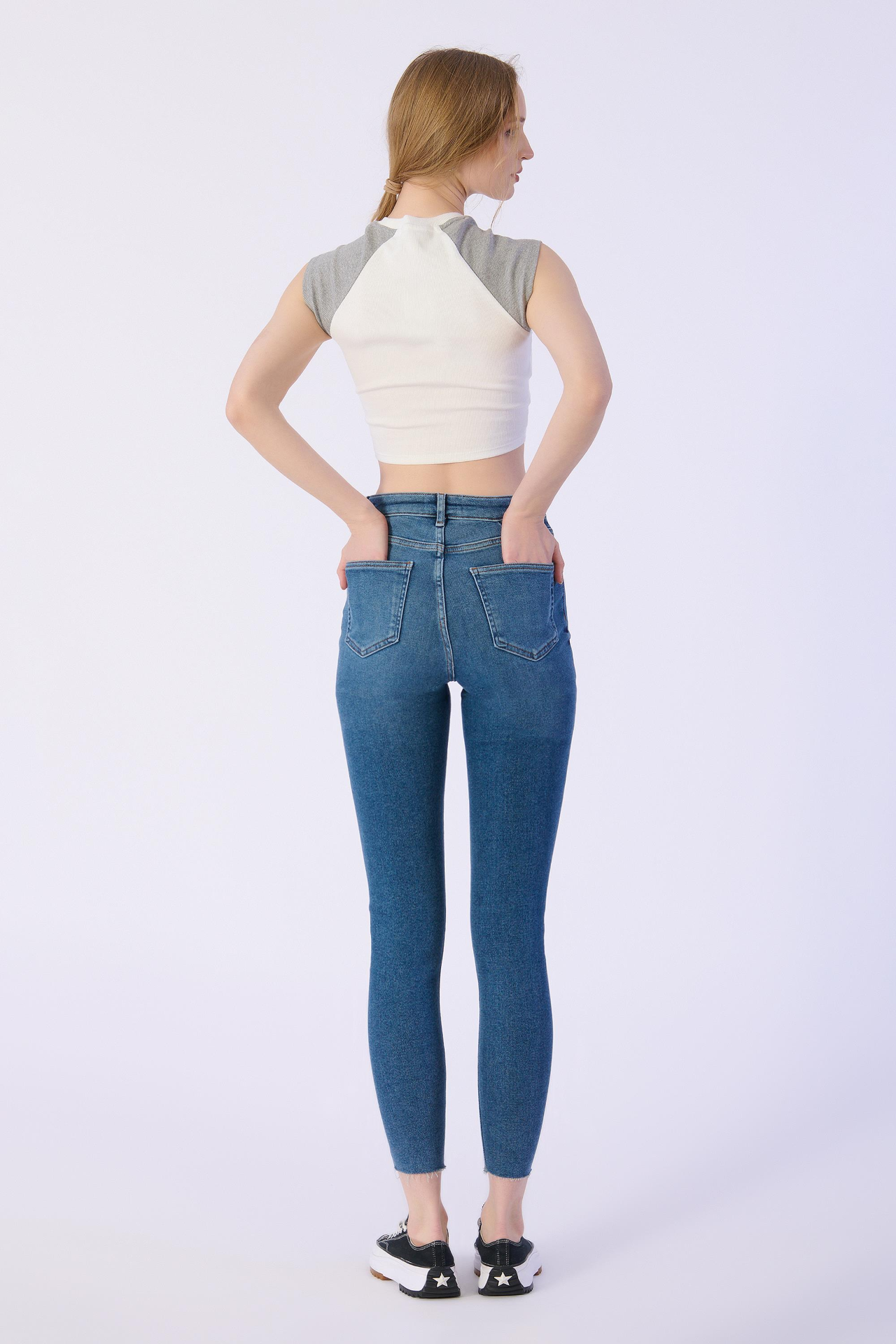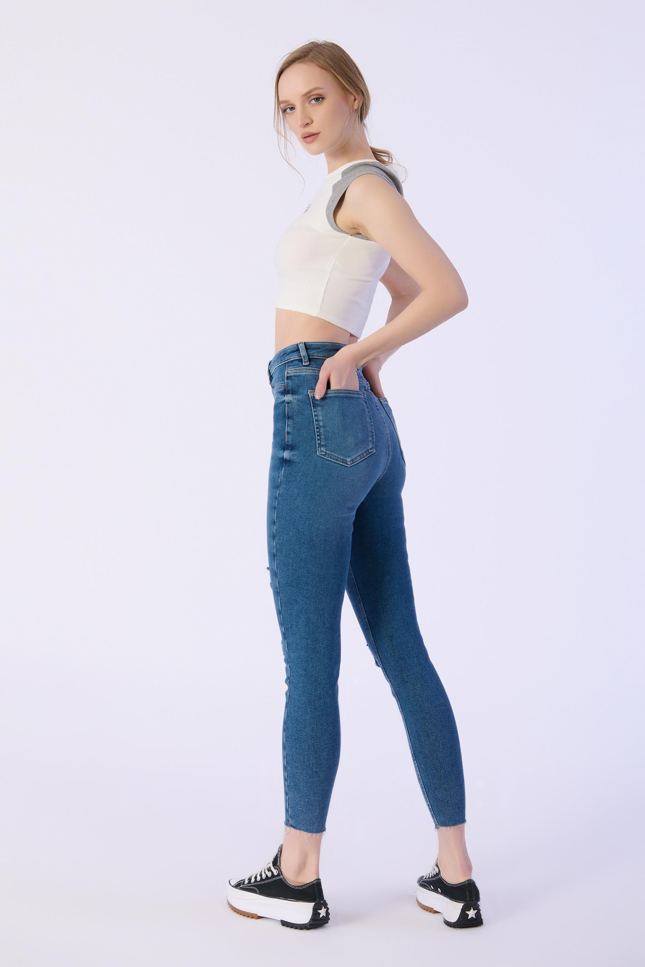 Skınny Cep Kapalı Dizler Lazerlı Paça Kesik Denim Pantolon