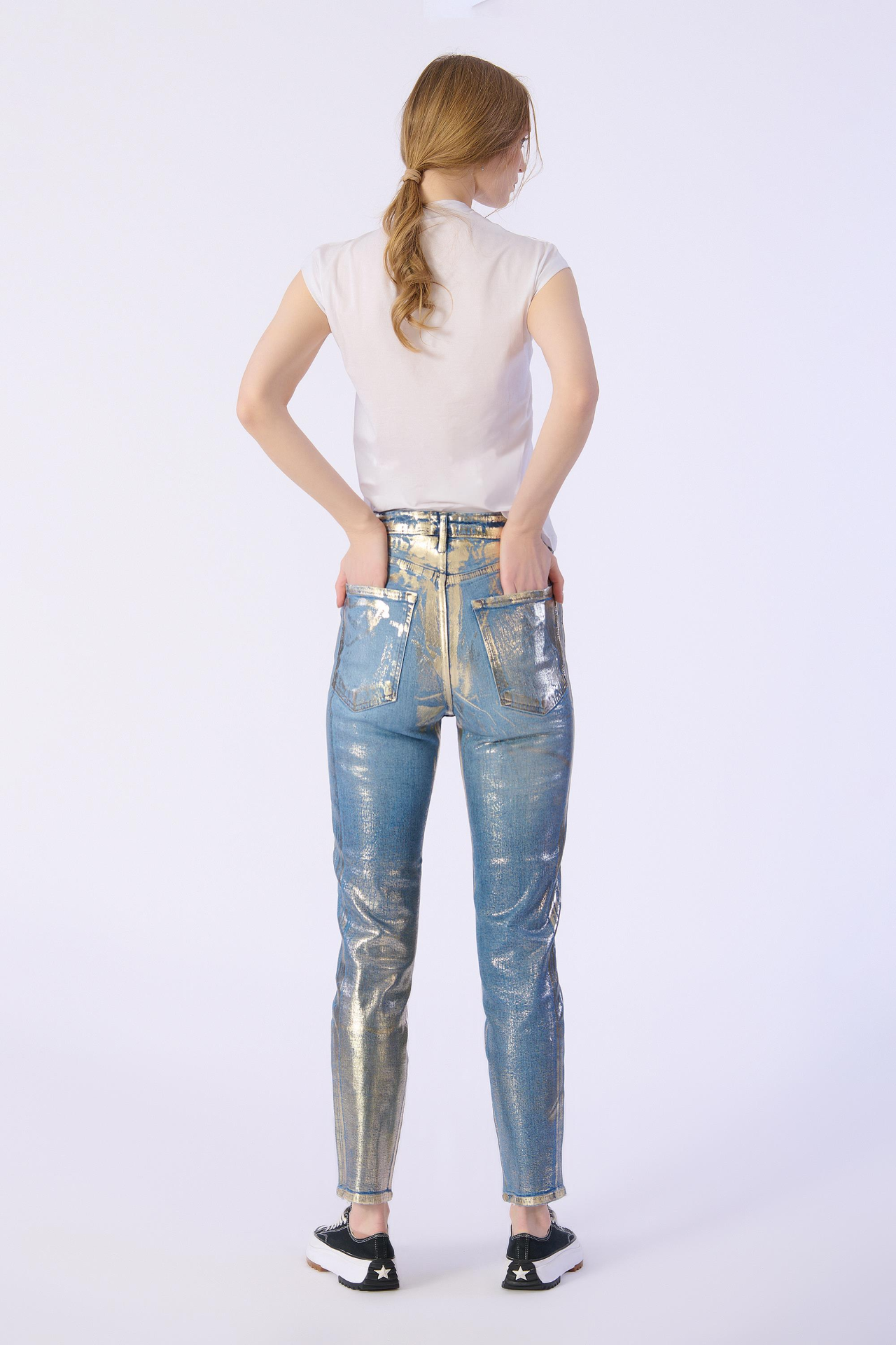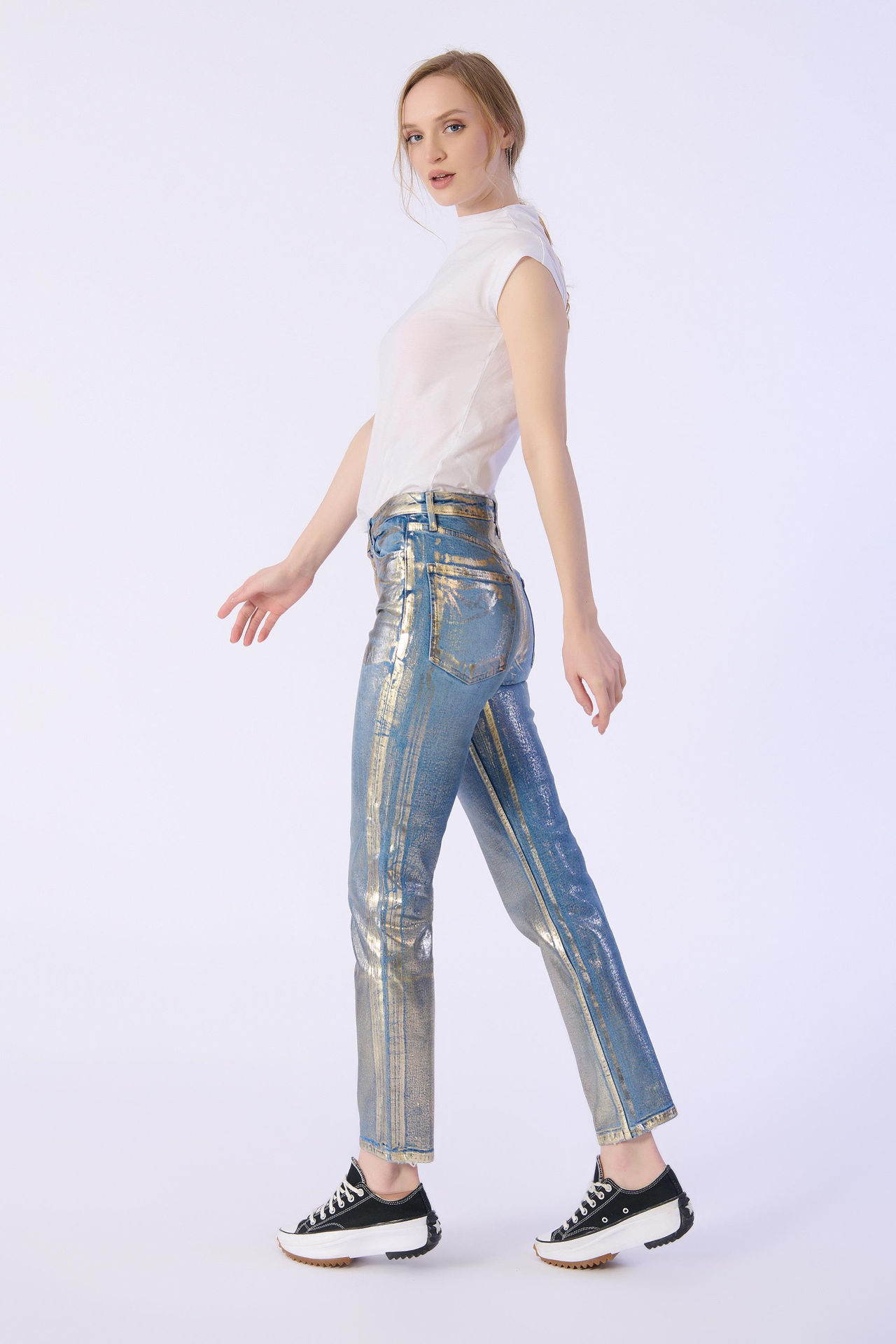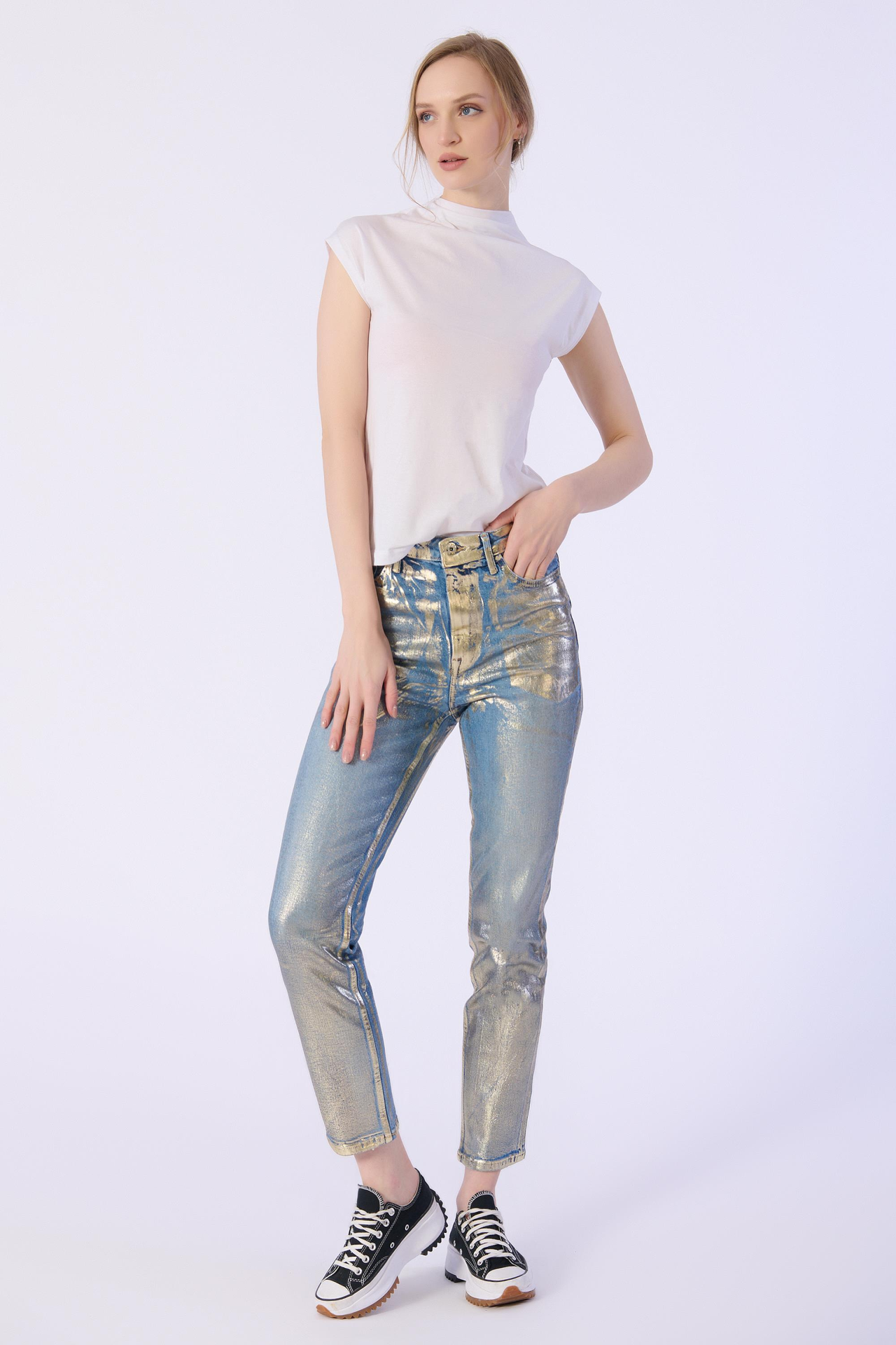 Slim Kalıp Altın Varaklı Denim Pantolon