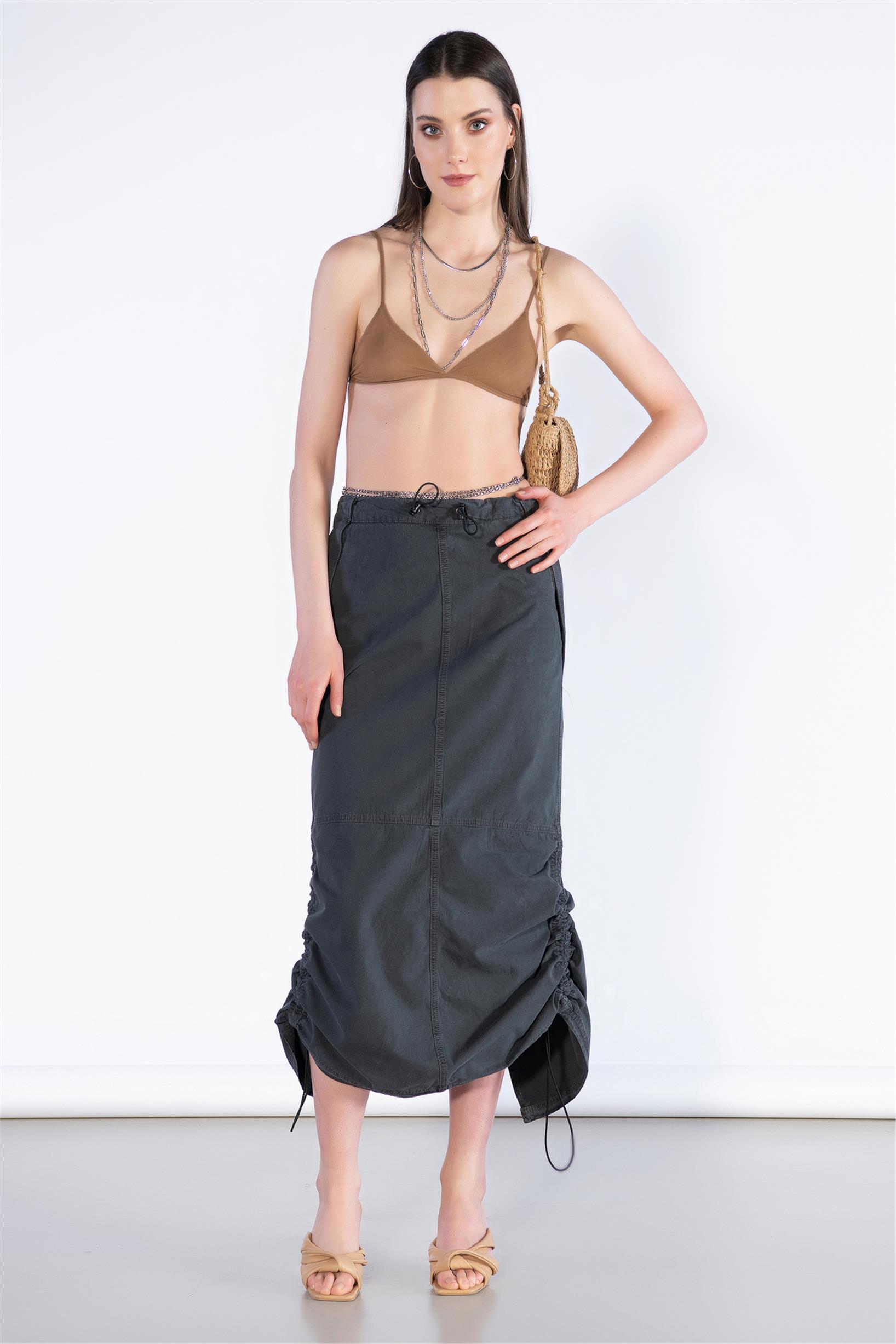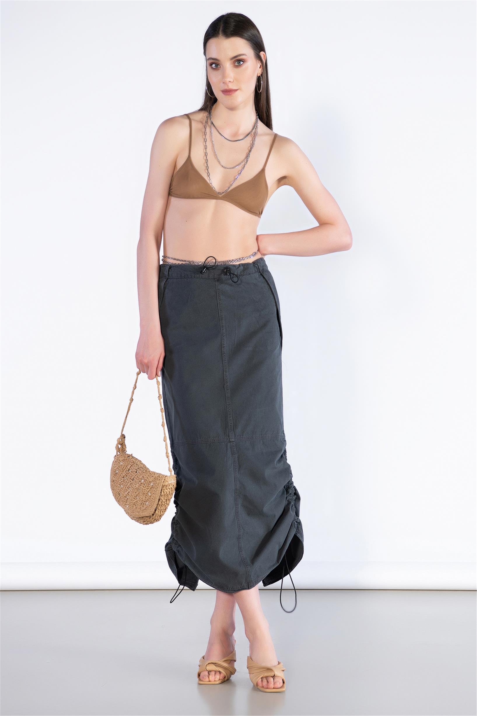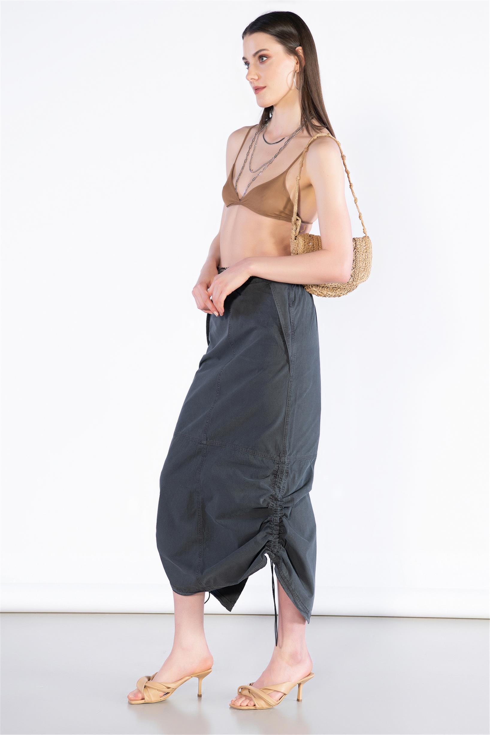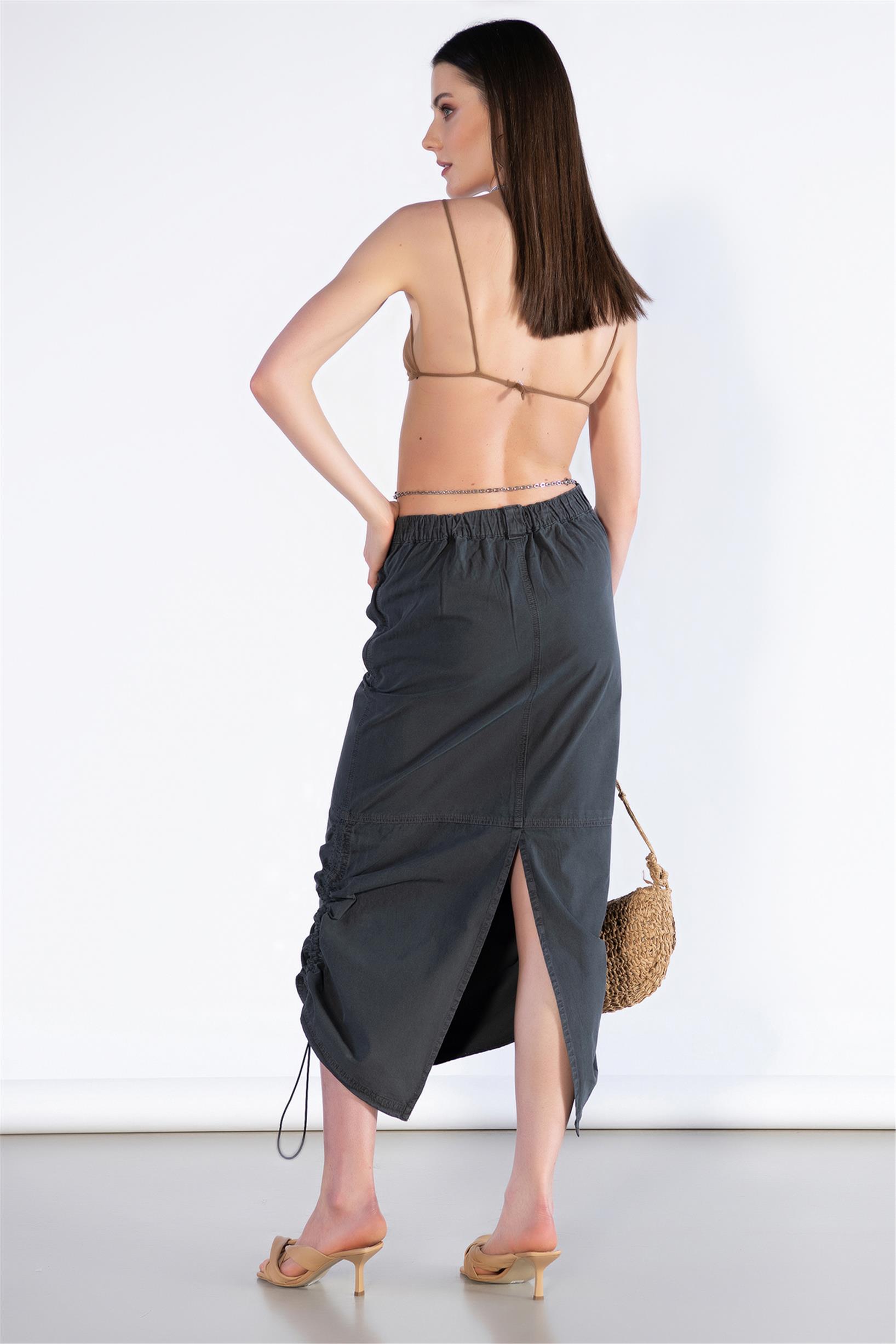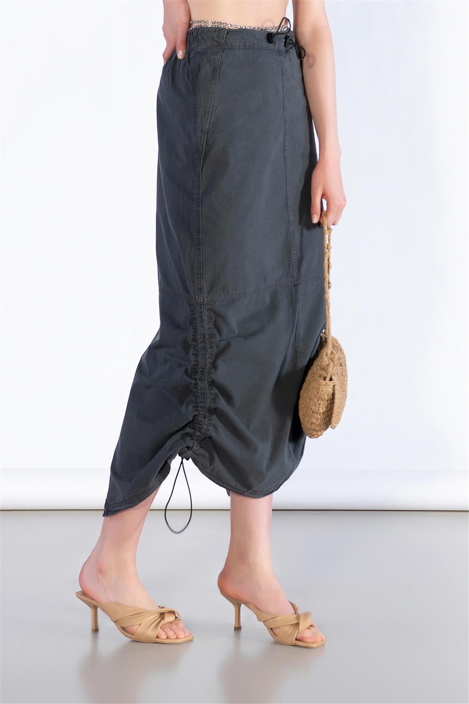 Stoperli Arka Yırtmaç Detay Midi Boy Paraşüt Etek