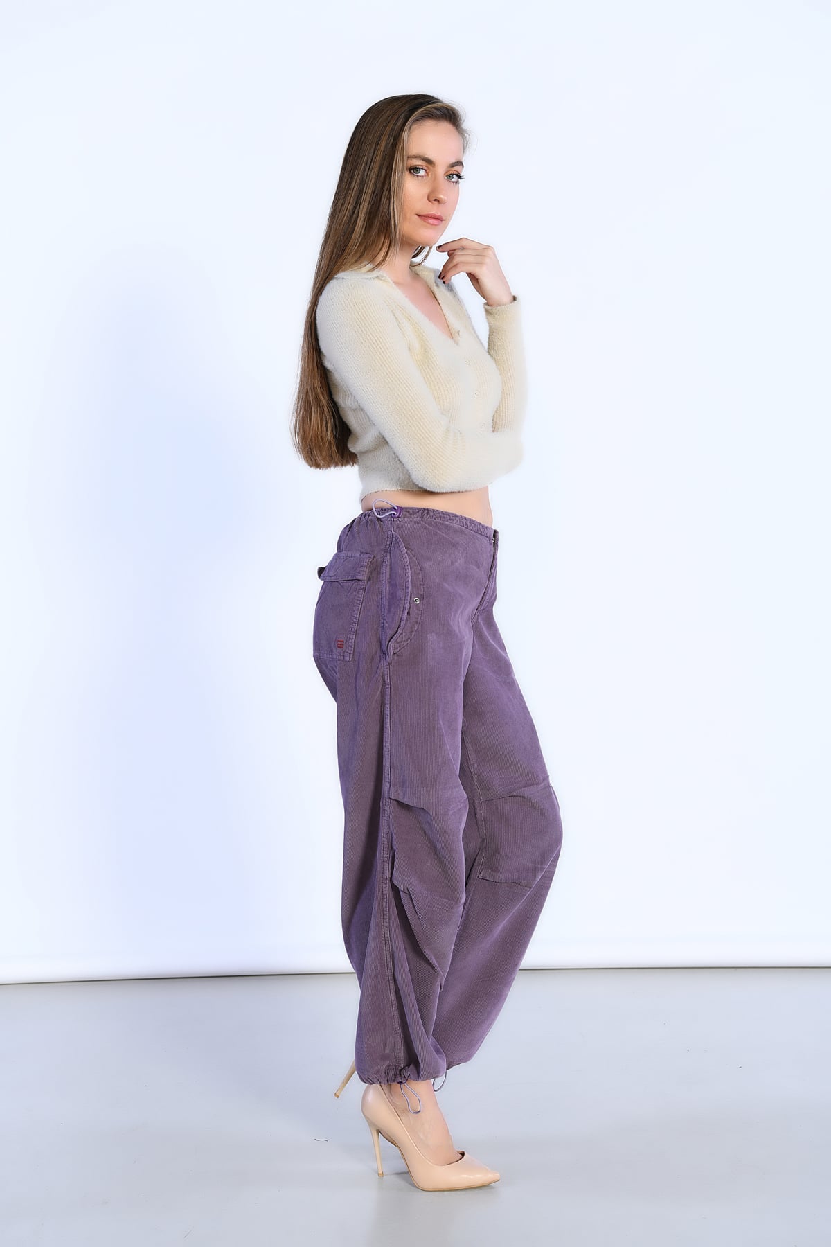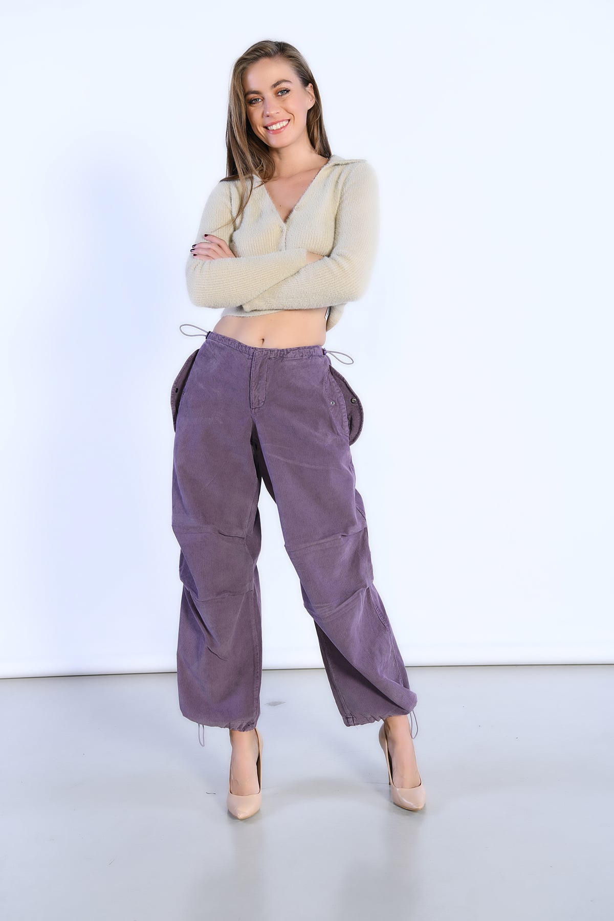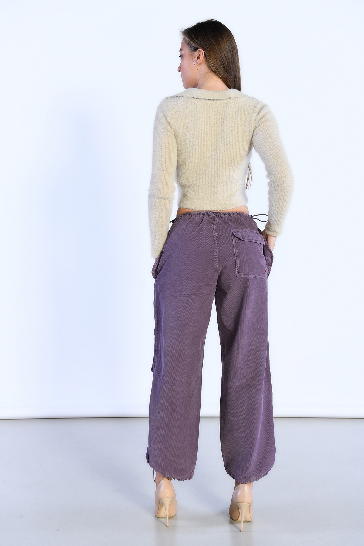 Straight Kargo Cep Çıt Çıtlı Parçalı Kadife Pantolon