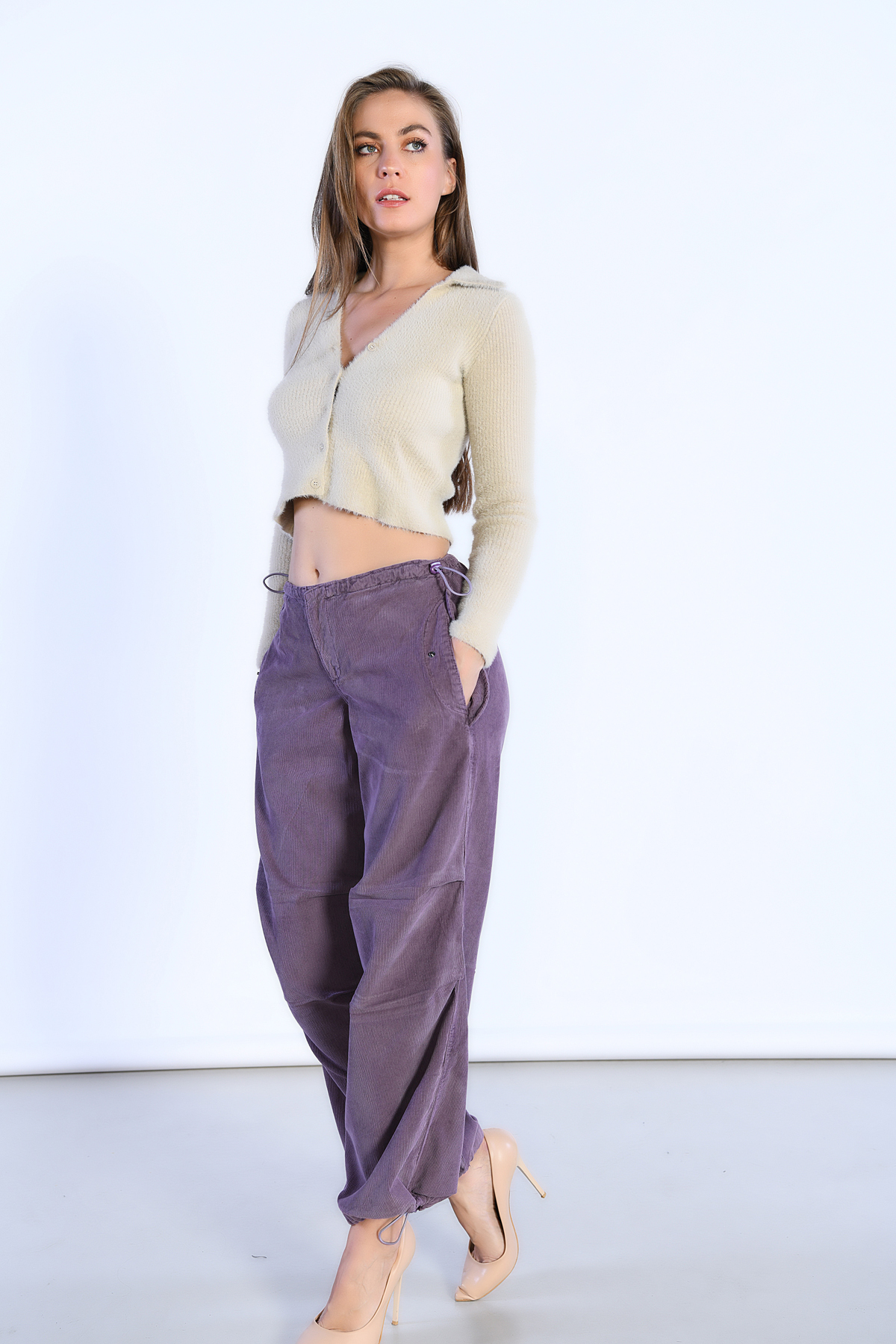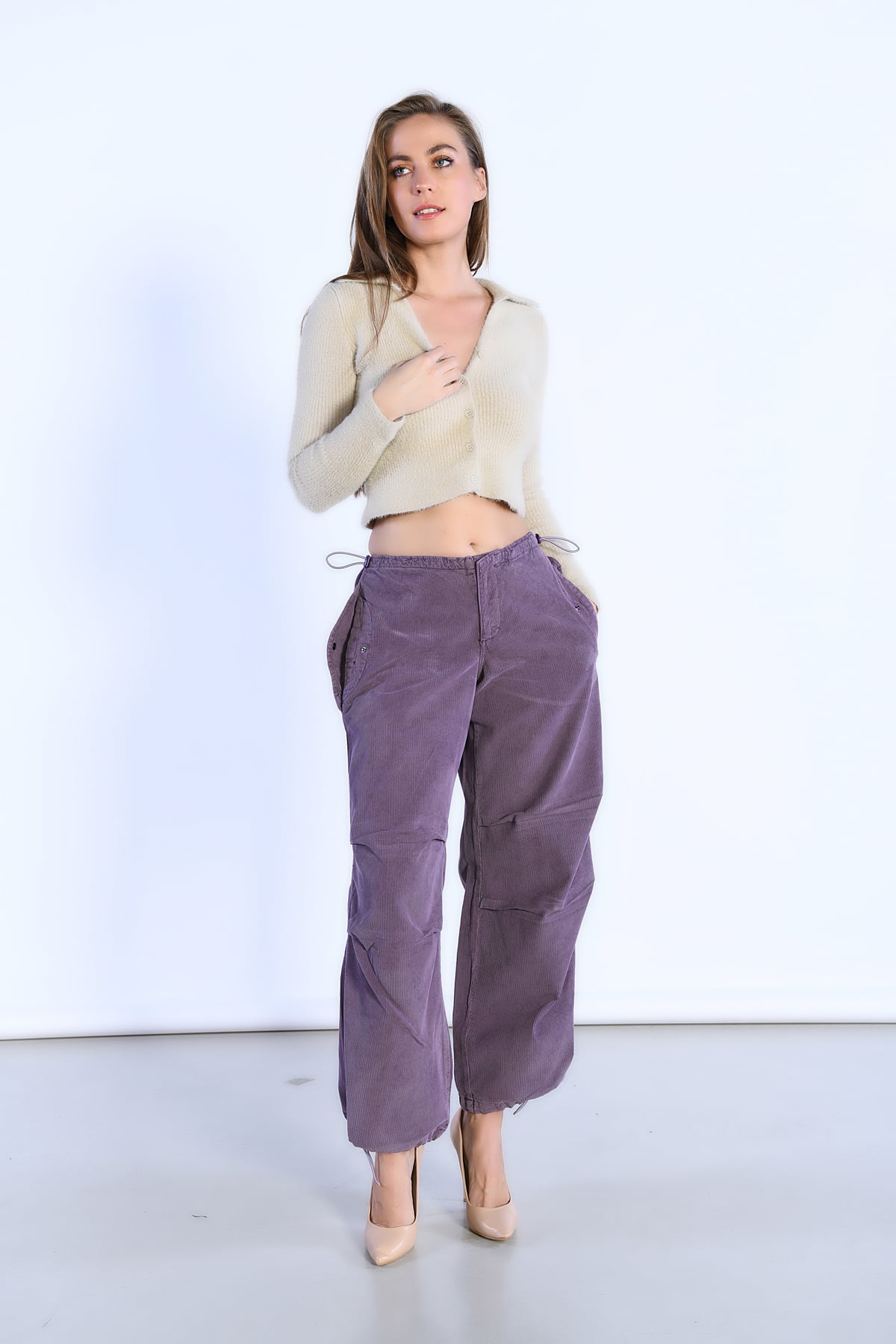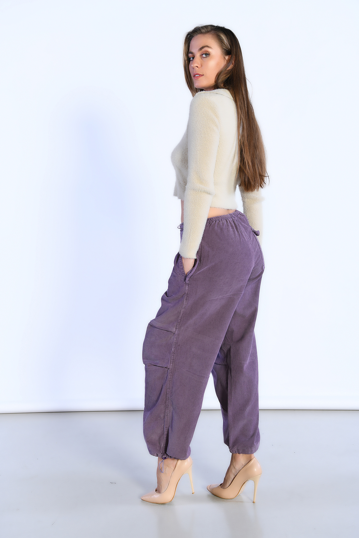 Straight Kargo Cep Çıt Çıtlı Parçalı Kadife Pantolon