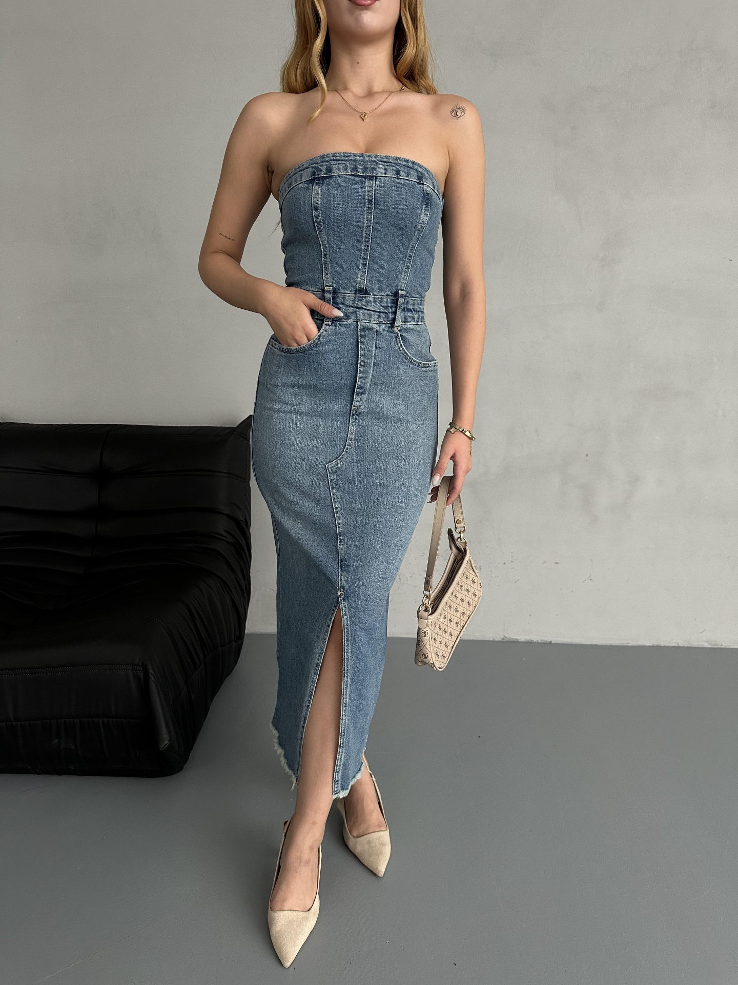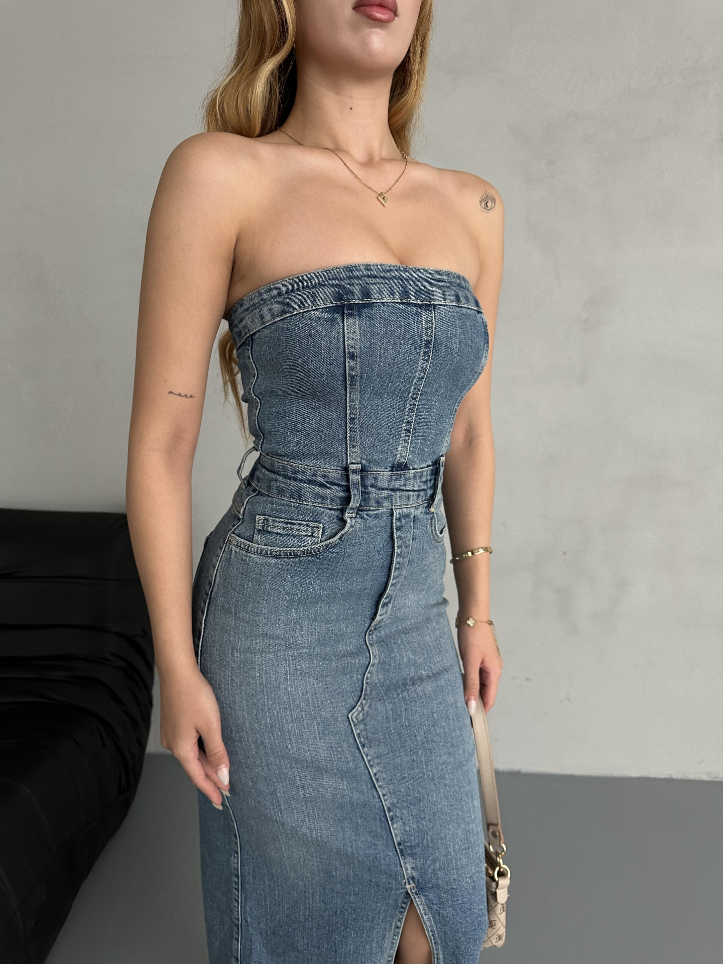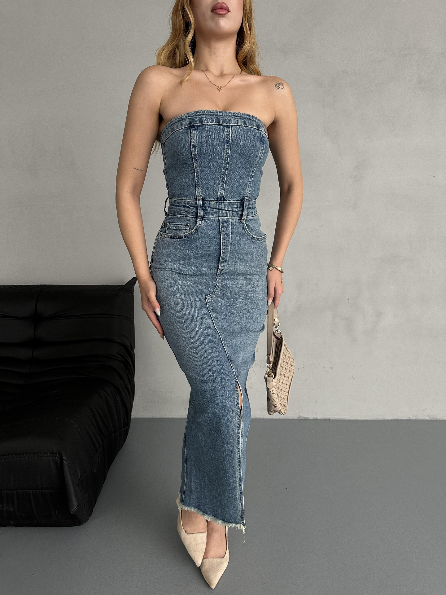 Straplez Denim Elbise