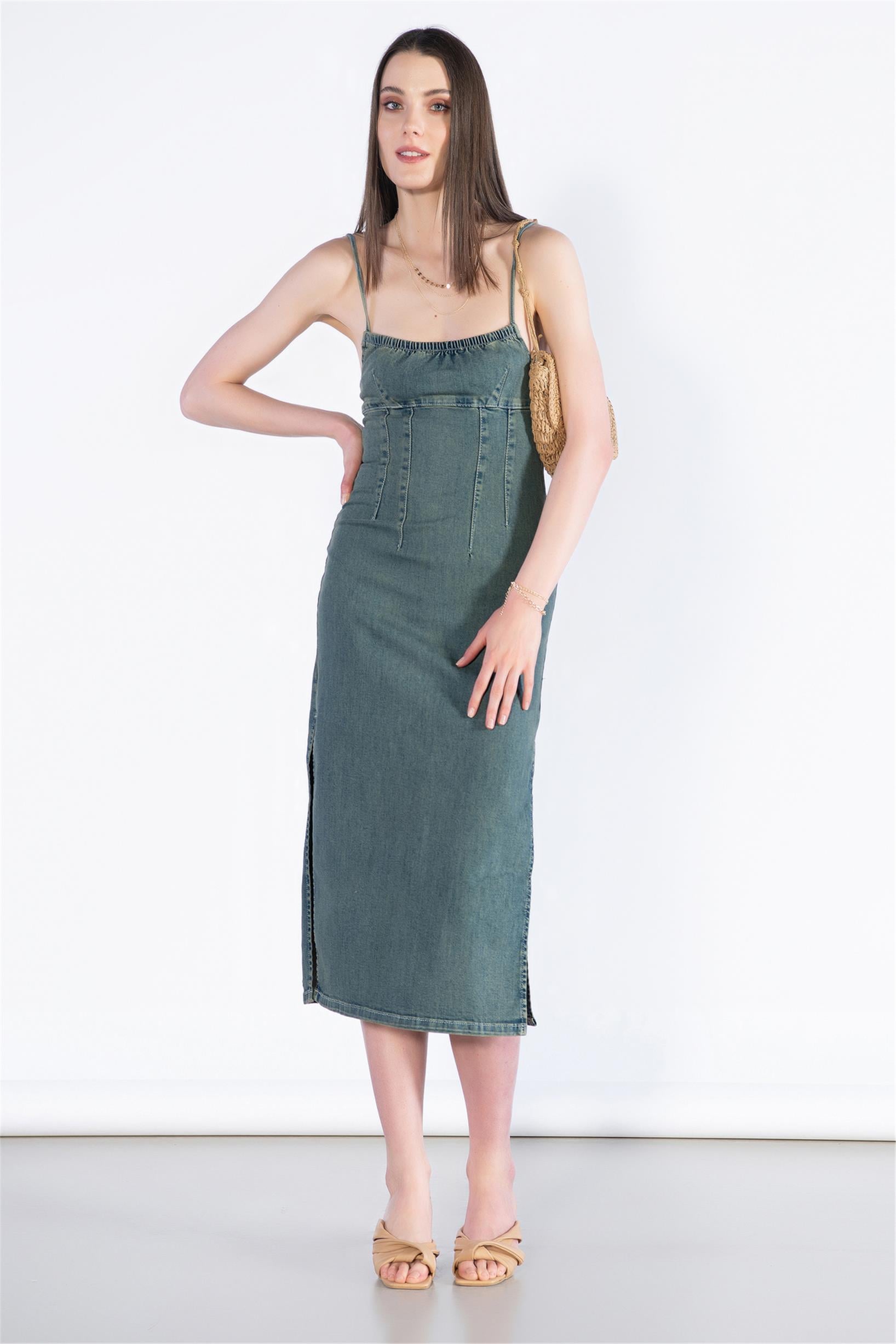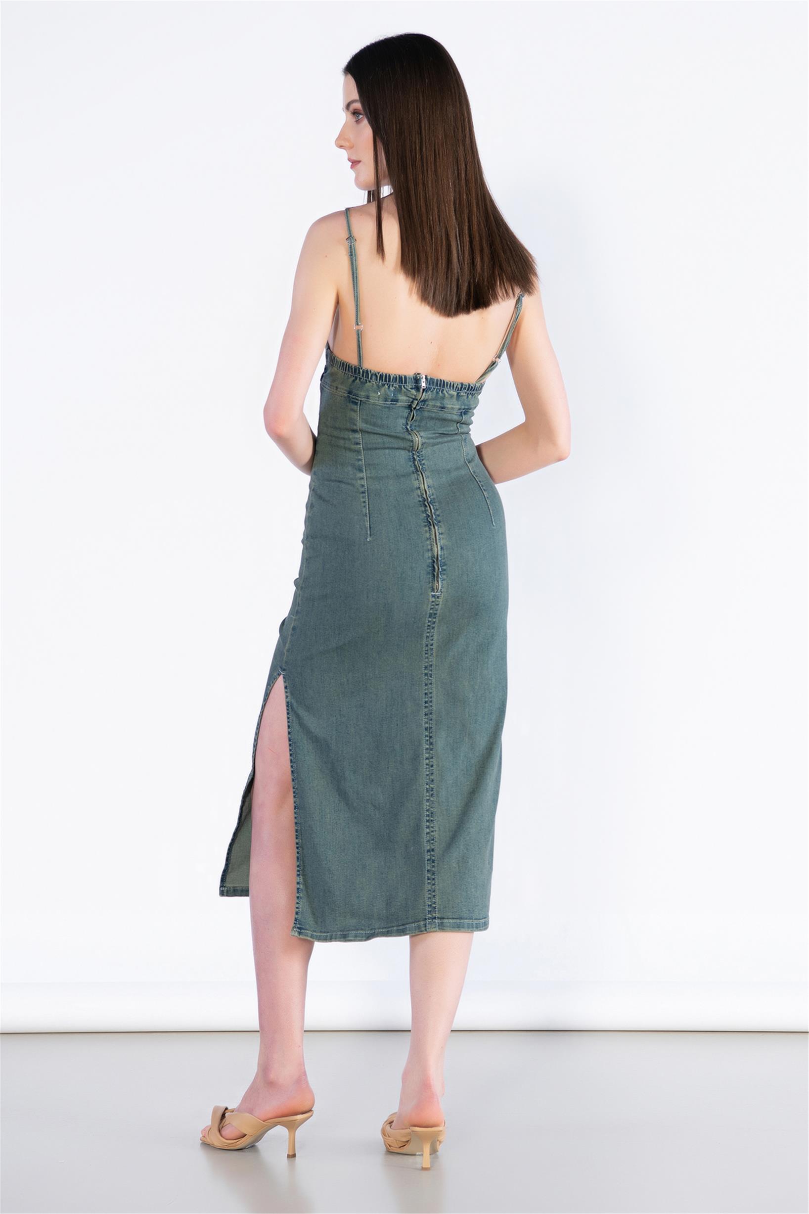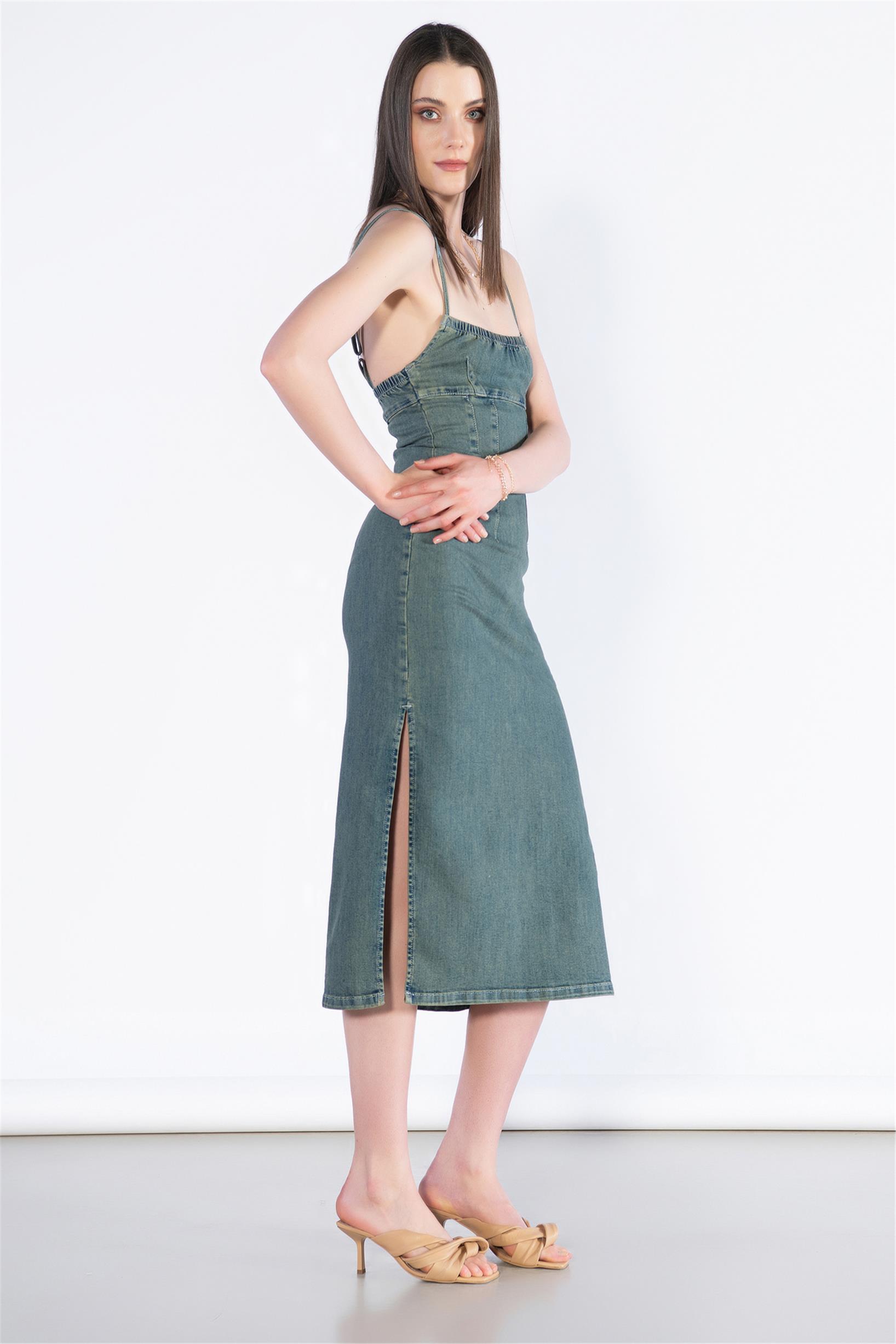 Vintage Mavi Askılı Midi Boy Kot Elbise