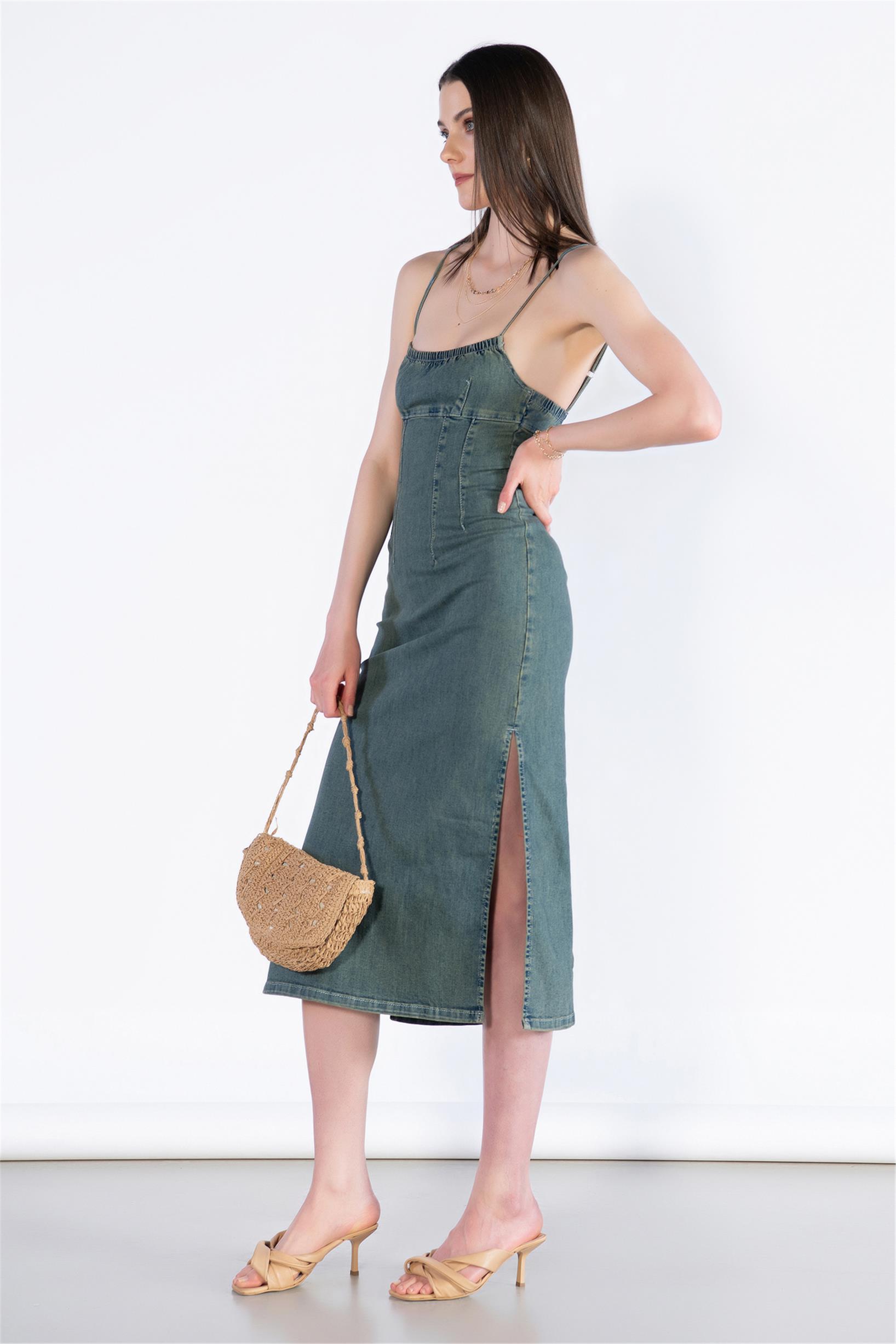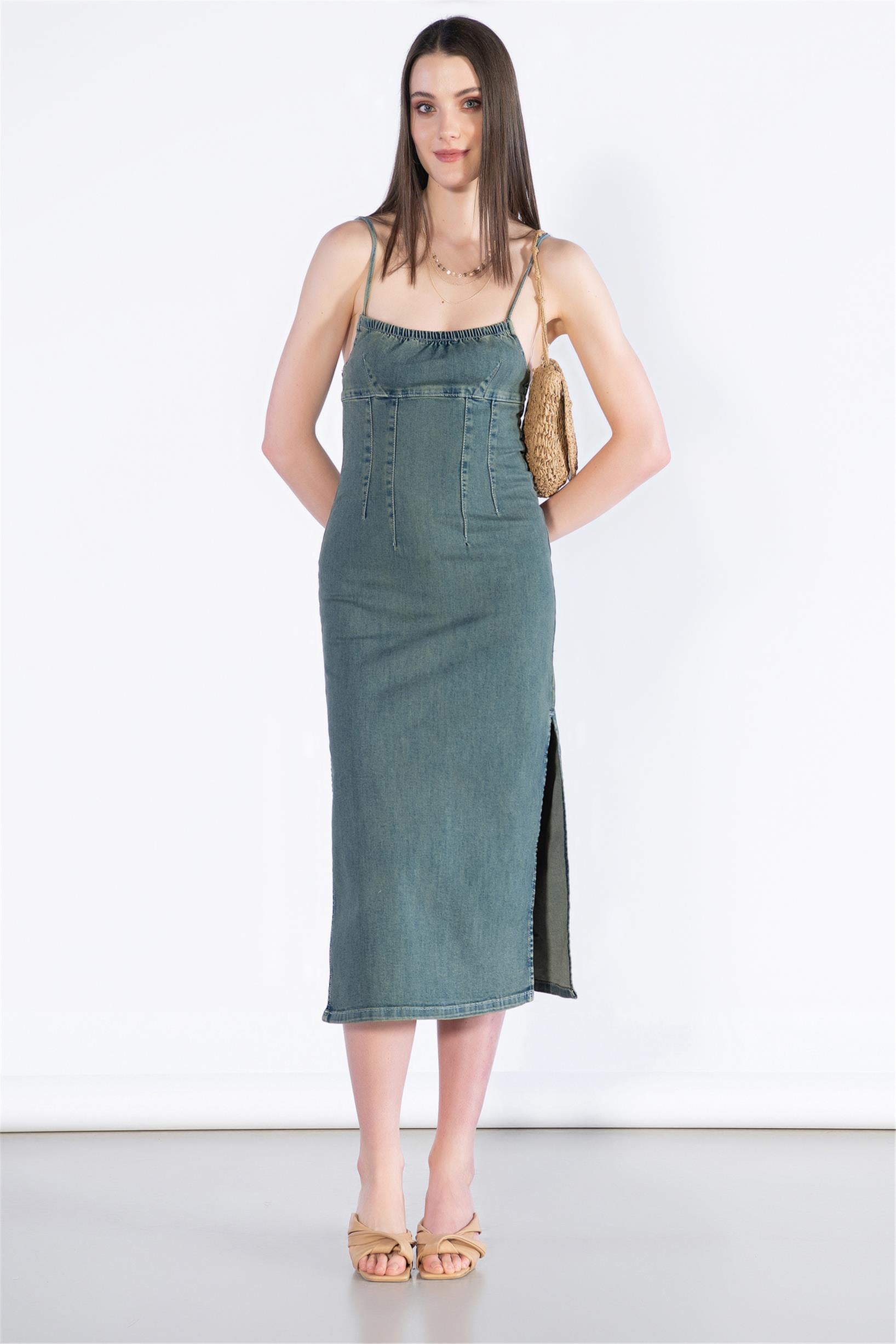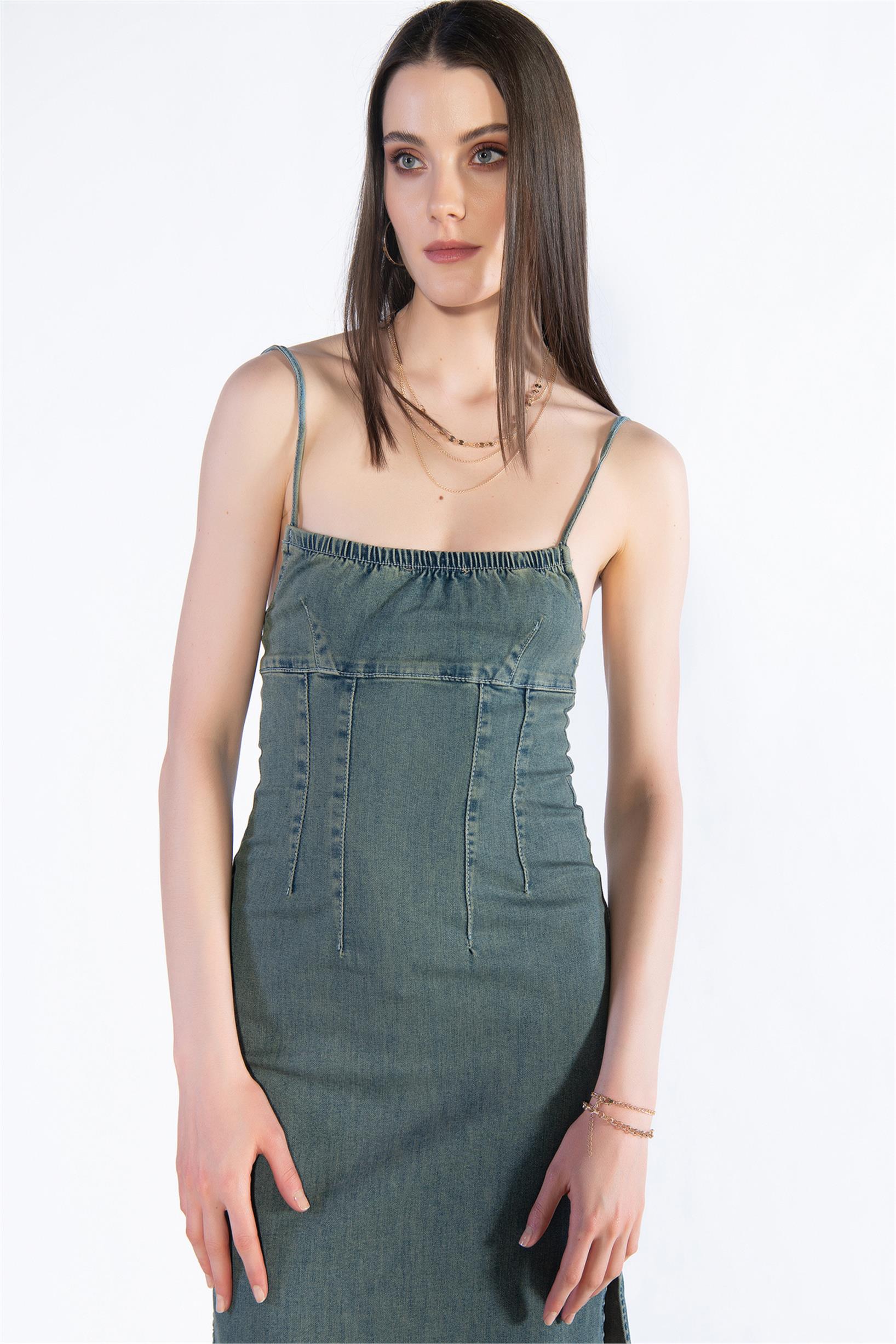 Vintage Mavi Askılı Midi Boy Kot Elbise