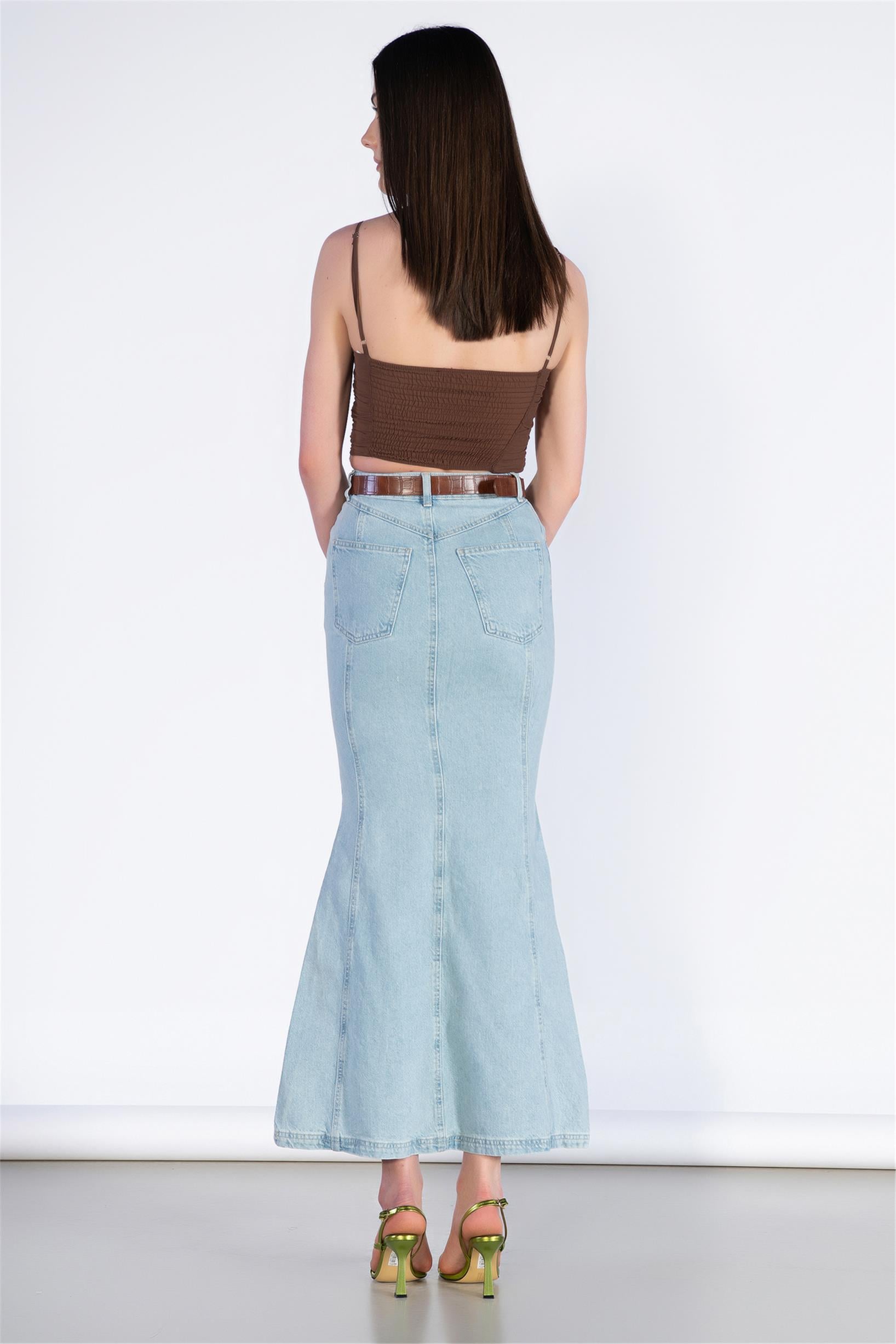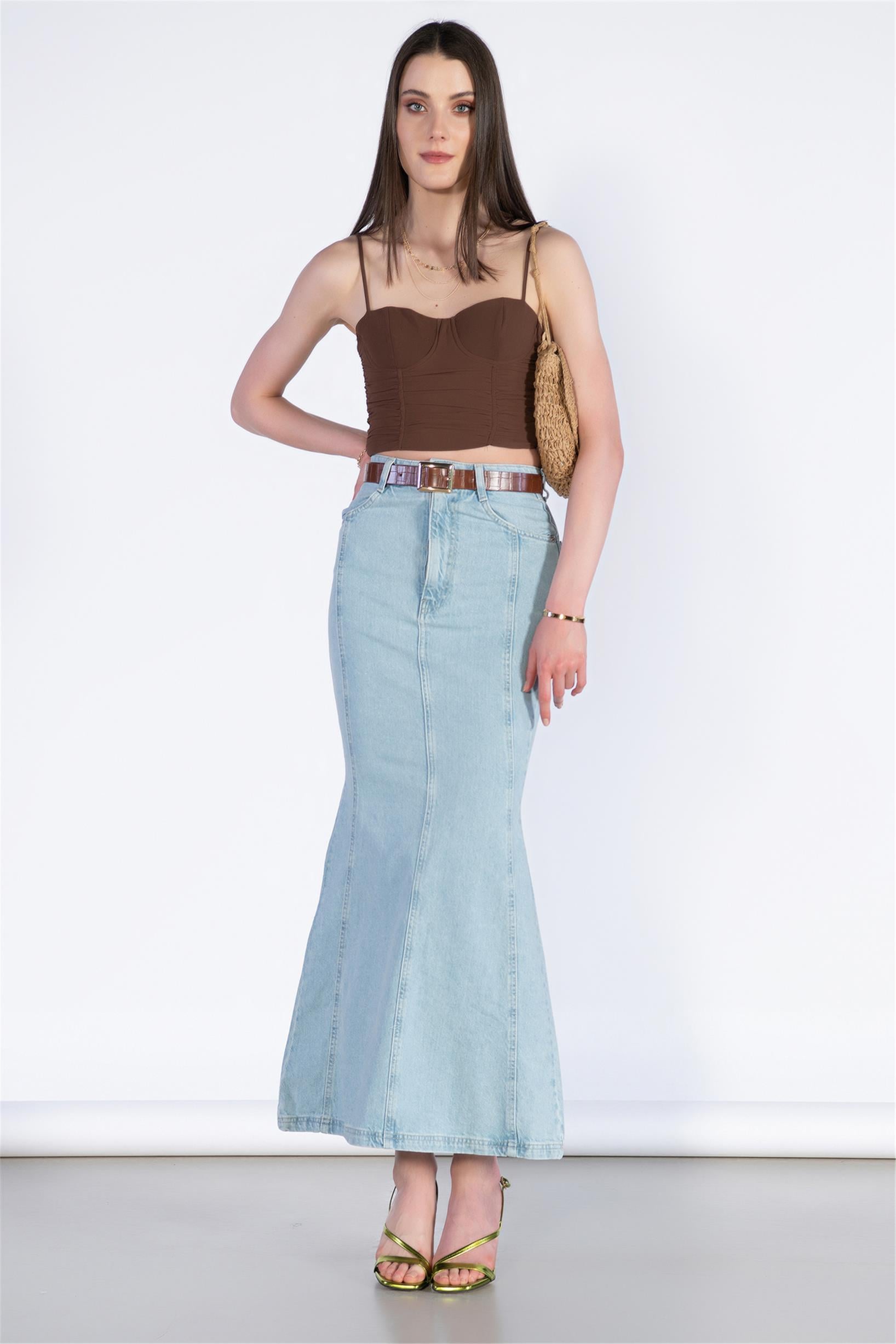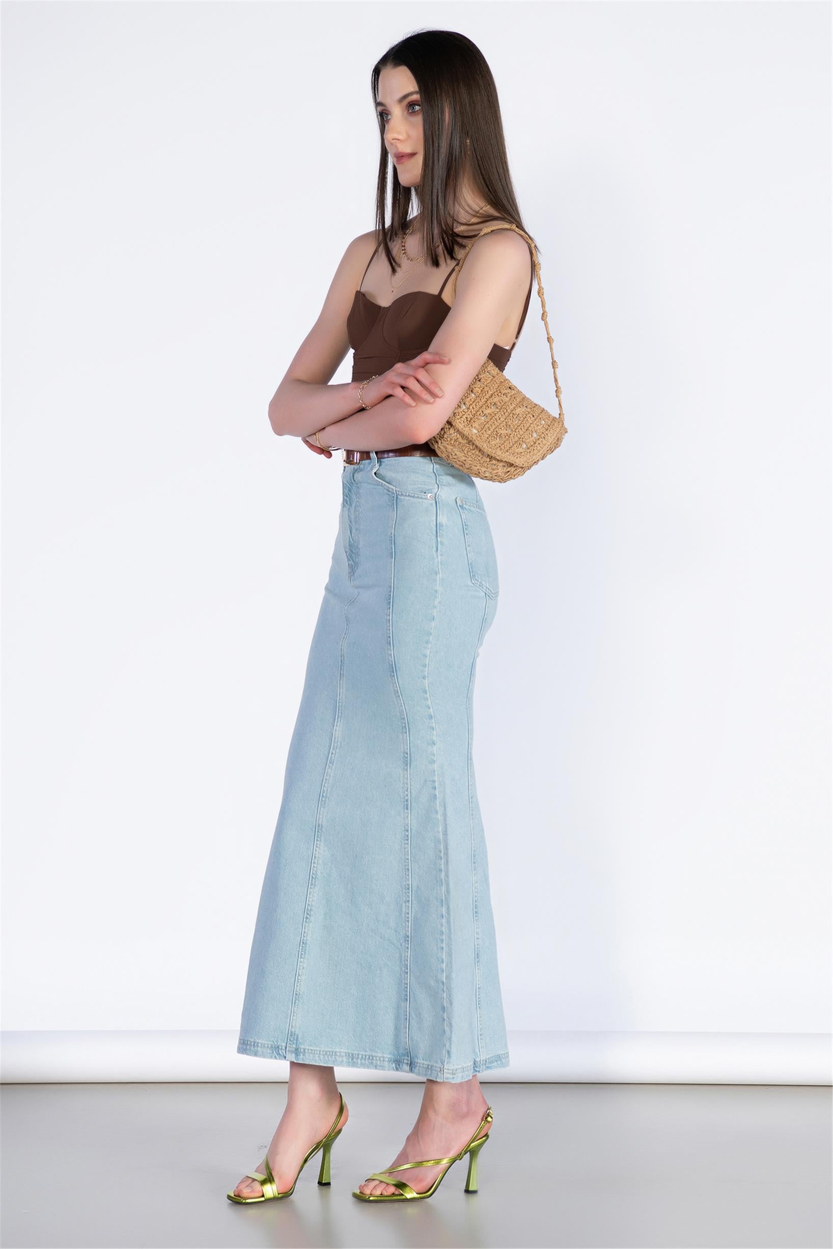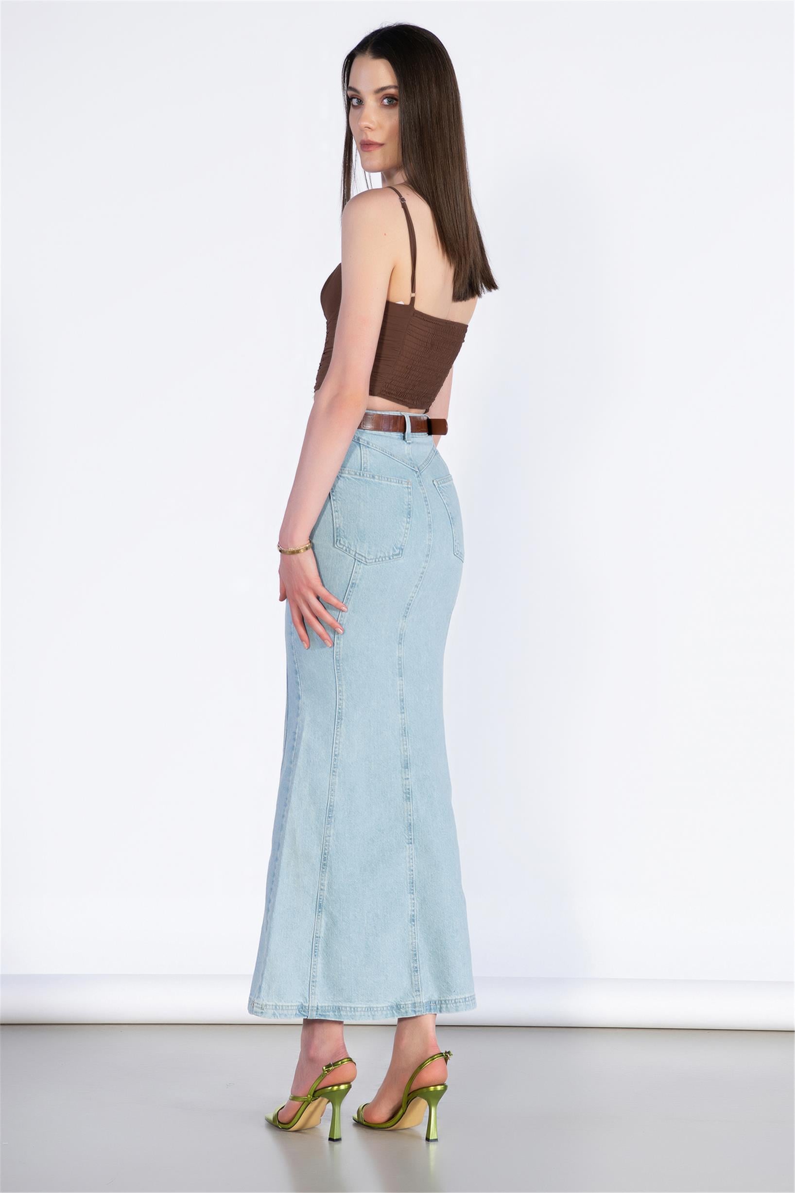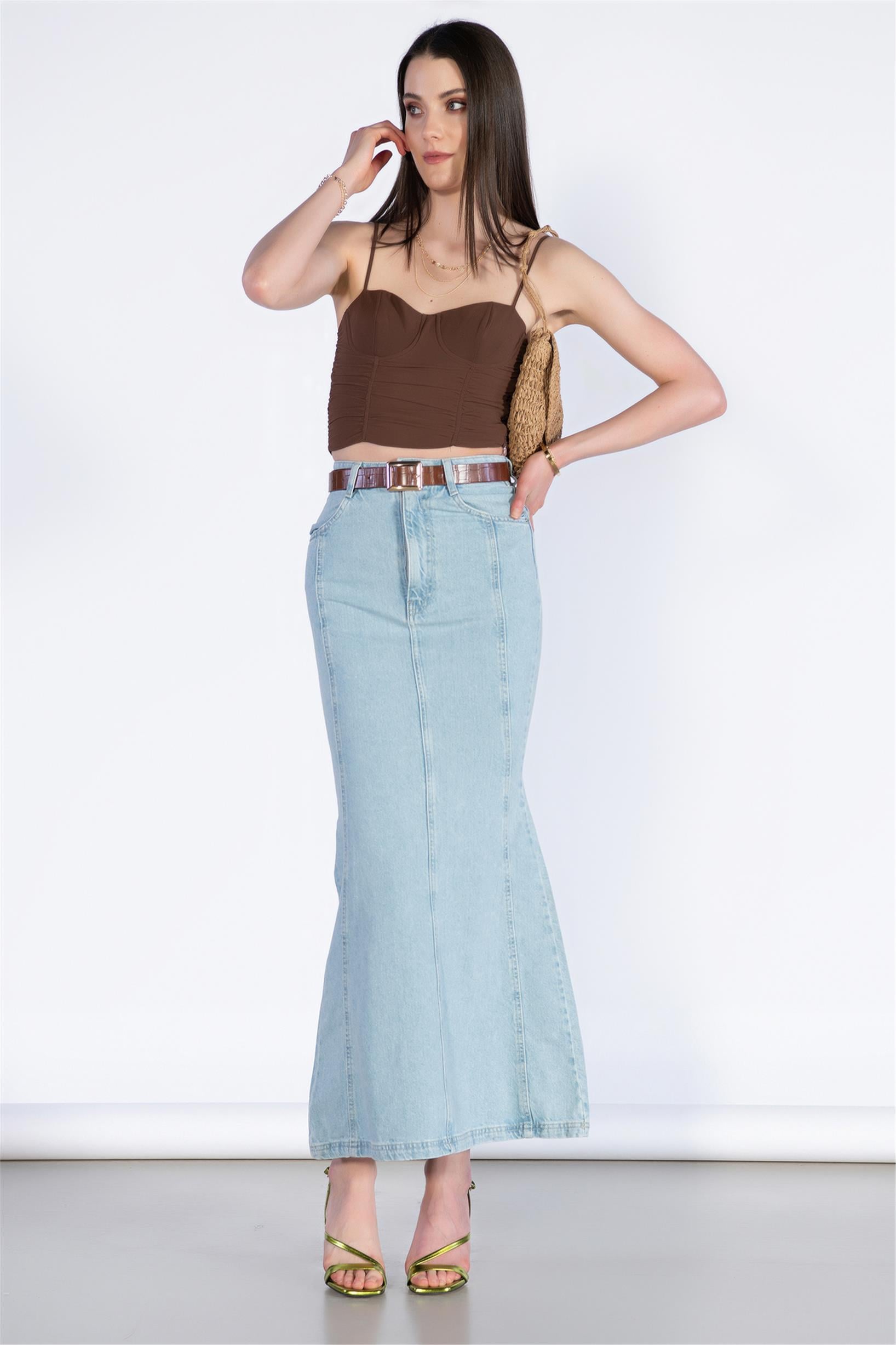 Yüksek Bel Midi Boy Balık Kalıp Kot Etek