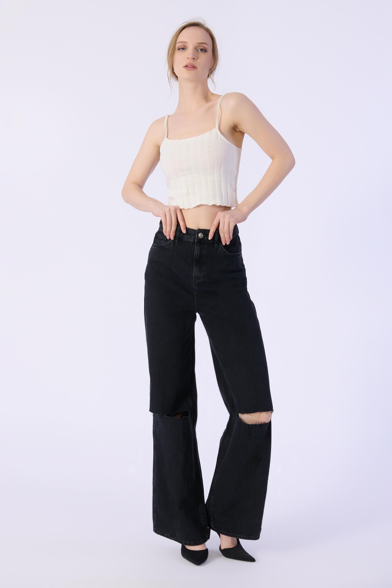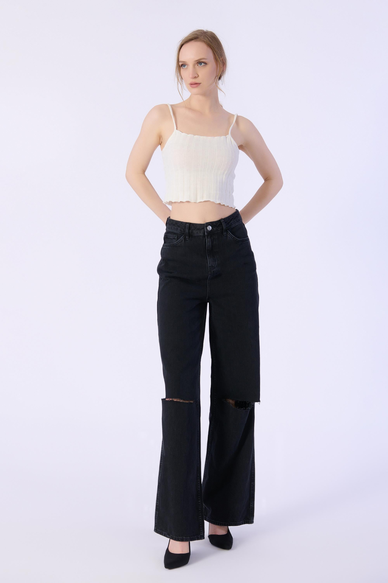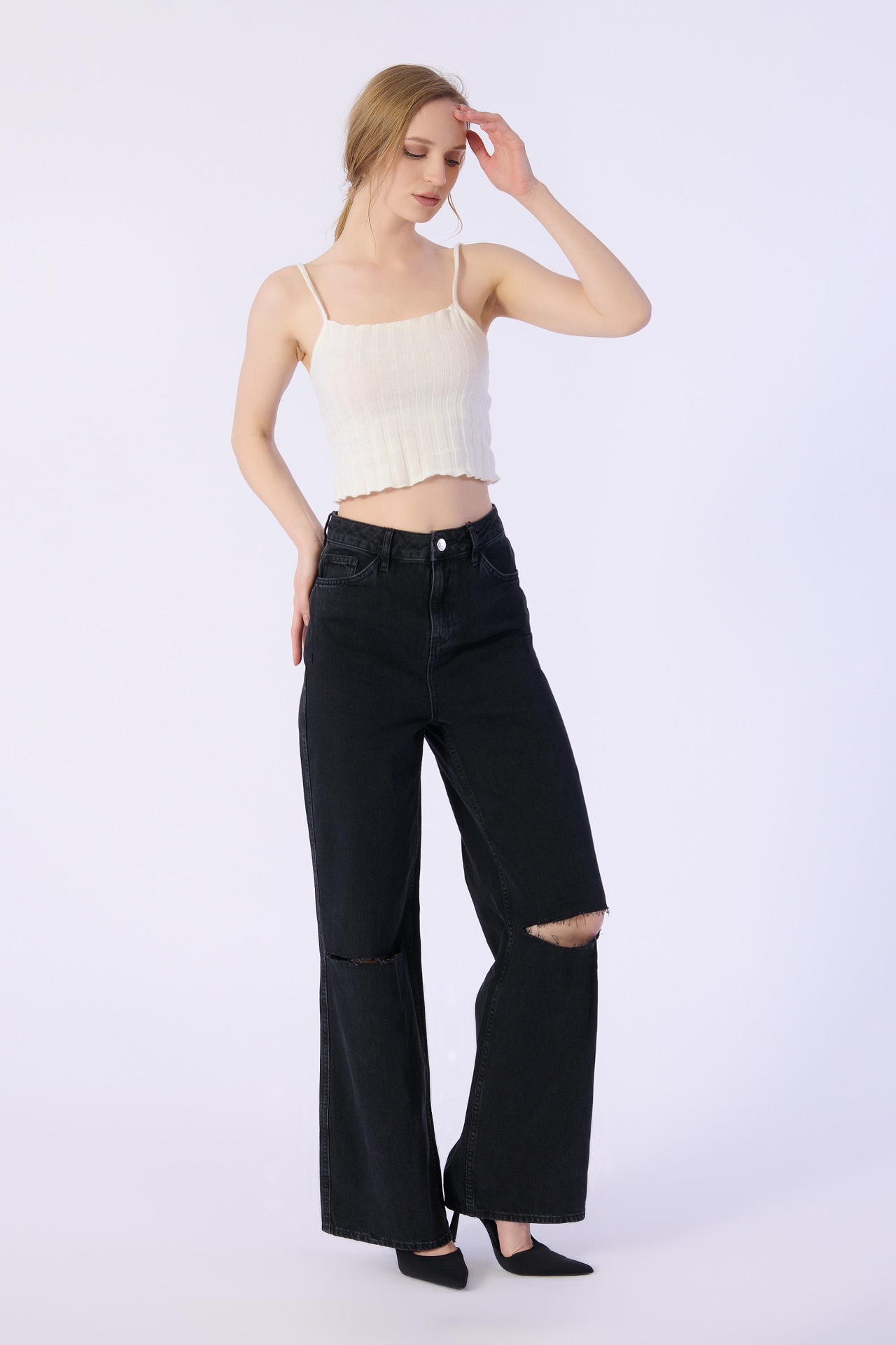Yüksek Bel Wide Leg Dizler Lazerlı Jeans