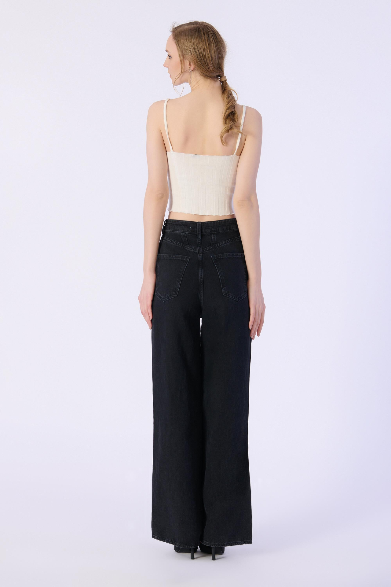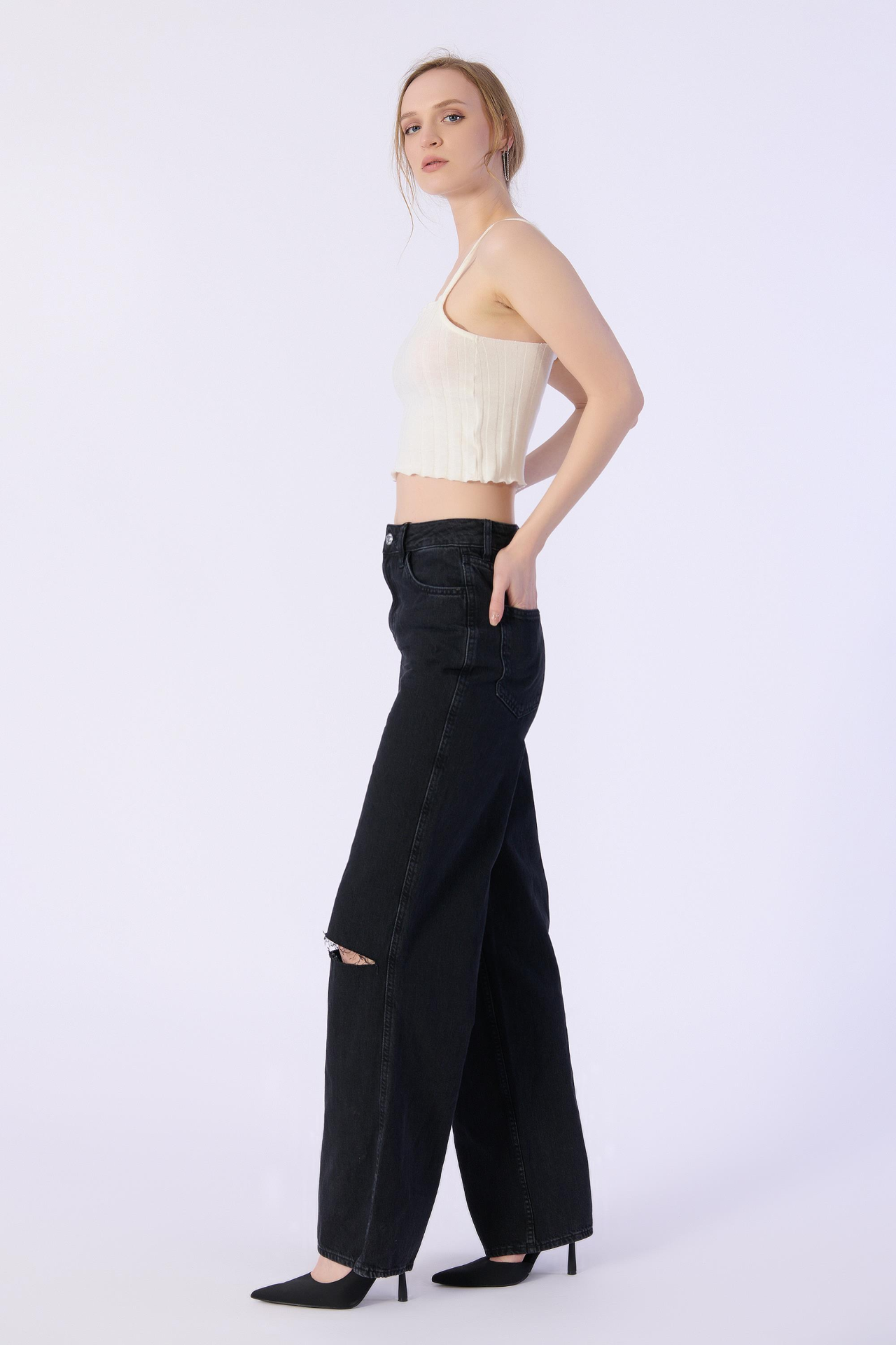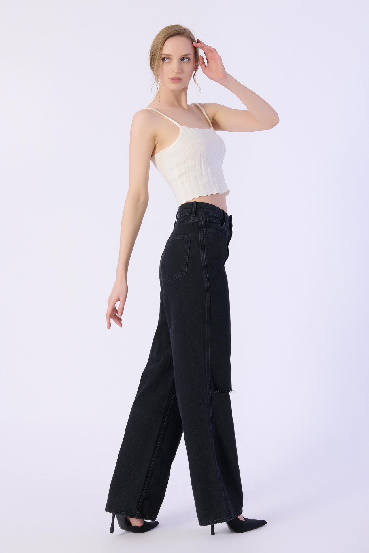 Yüksek Bel Wide Leg Dizler Lazerlı Jeans